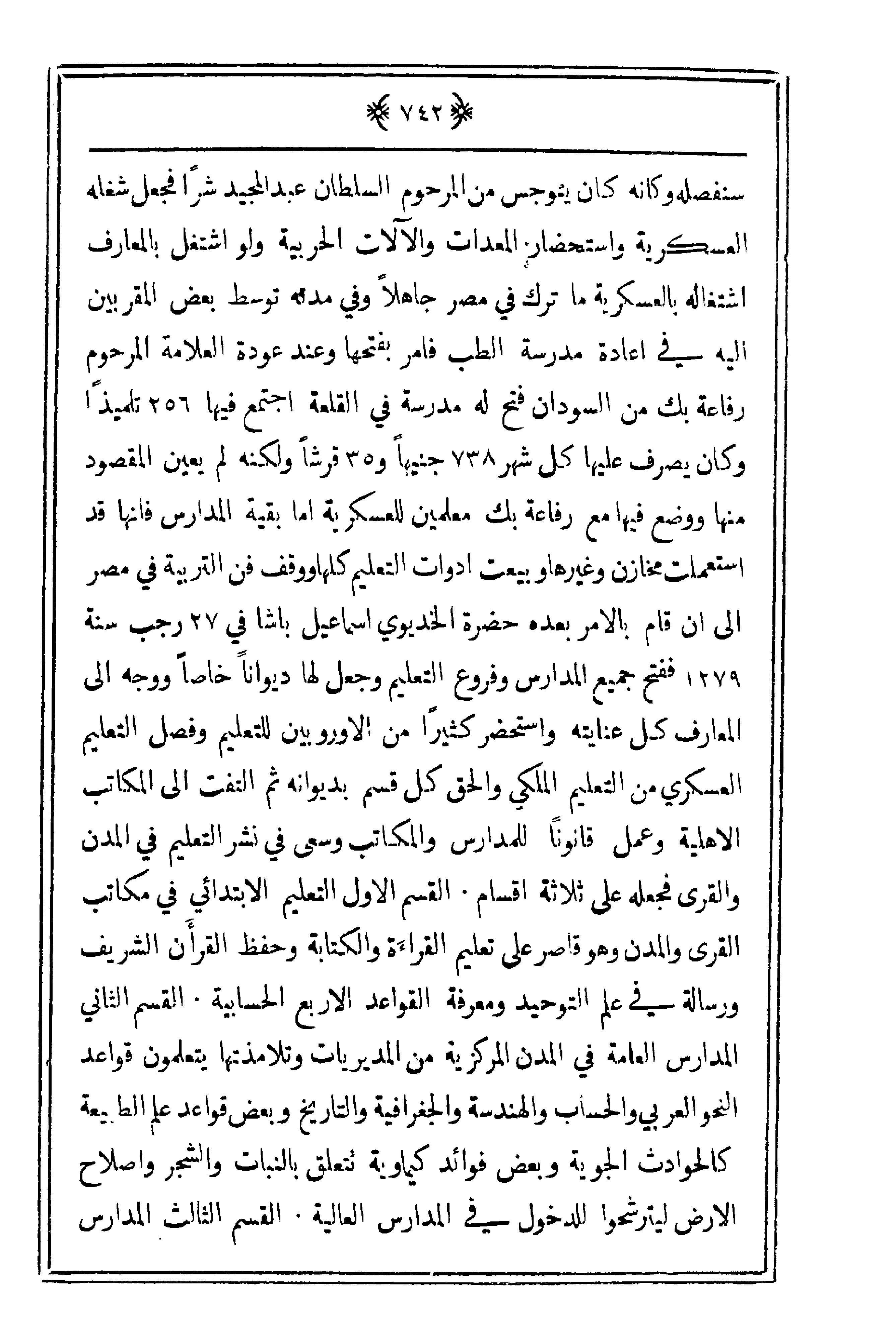 سنفصله وكأنه كان يتوجس من المرحوم السلطان عبد المجيد شراً فجعل شغله العسكرية واستحضار المعدات والآلات الحربية ولو اشتغل بالمعارف اشتغاله بالعسكرية ما ترك في مصر جاهلاً وفي مدنه توسط بعض المقربين إليه في إعادة مدرسة الطب فأمر بفتحها وعند عودة العلامة المرحوم رفاعة بك من السودان فتح له مدرسة في القلعة اجتمع فيها 256 تلميذاً وكان يصرف عليها كل شهر 738 جنيهاً و35 قرشاً ولكنه لم يعين المقصود منها ووضع فيها مع رفاعة بك معلمين للعسكرية أما بقية المدارس فإنها قد استعملت مخازن وغيرها وبيعت أدوات التعليم كلها ووقف فن التربية في مصر إلى أن قام بالأمر بعده حضرة الخديوي إسماعيل باشا في 27 رجب سنة 1279 ففتح جميع المدارس وفروع التعليم وجعل لها ديواناً خاصاً ووجه على المعارف كل عنايته واستحضر كثيراً من الأوروبيين للتعليم وفصل التعليم العسكري من التعليم الملكي والحق كل قسم بديوانه ثم ألفت على المكاتب الأهلية وعمل قانوناً للمدارس والمكاتب وسعى في نشر التعليم في المدن والقرى فجعله على ثلاثة أقسام. القسم الأول التعليم الابتدائي في مكاتب القرى والمدن وهو قاصر على تعليم القراءة والكتابة وحفظ القرآن الشريف ورسالة في علم التوحيد ومعرفة القواعد الأربع الحسابية. القسم الثاني المدارس العامة في المدن المركوية من المديريات وتلامذتها يتعلمون قواعد النحو العربي والحساب والهندسة والجغرافية والتاريخ وبعض قواعد علم الطبيعة كالحوادث الجوية وبعض فوائد كيماوية تتعلق بالنبات والشجر وإصلاح الأرض ليترشحوا للدخول في المدارس العالية. القسم الثالث المدارس