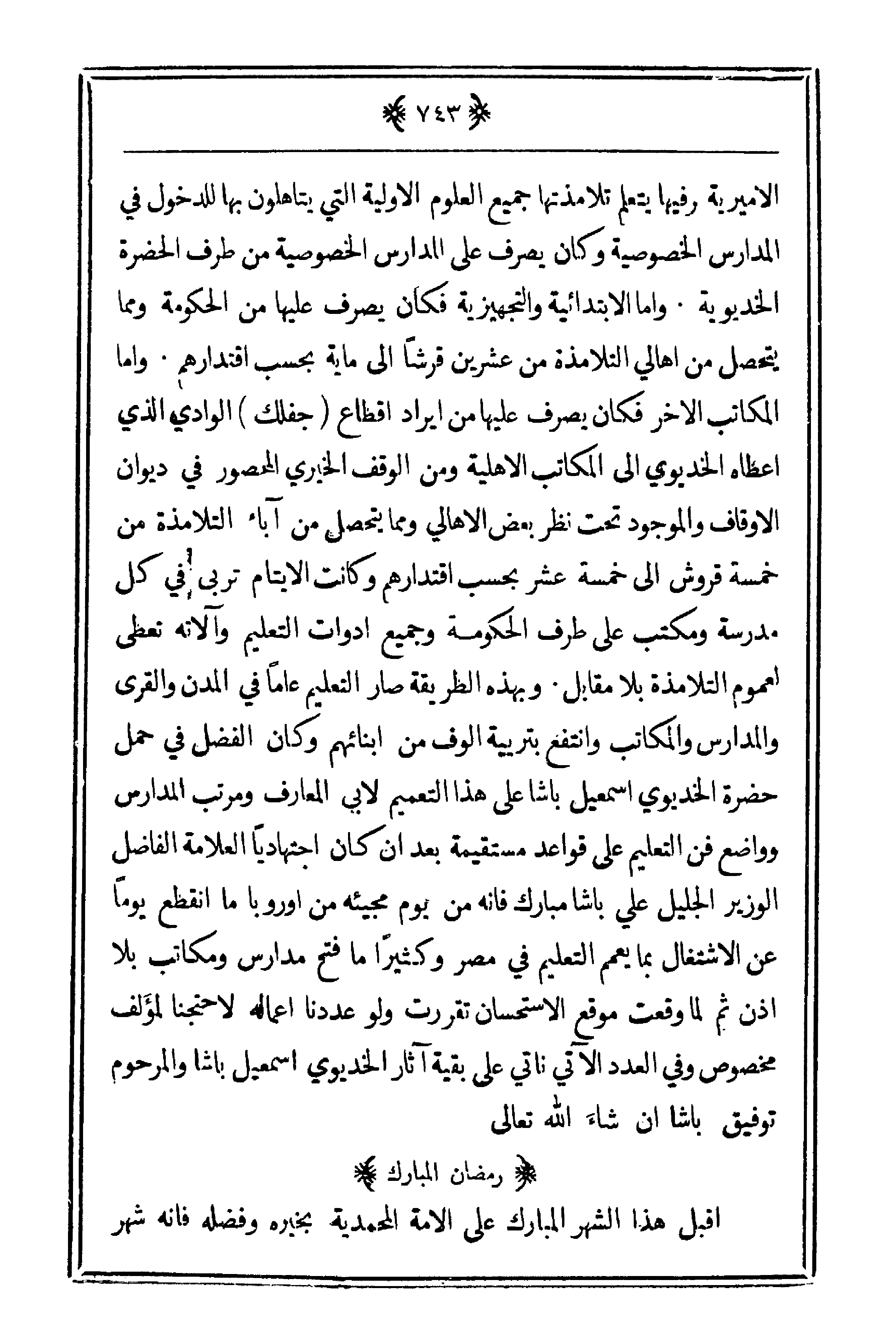 جميع العلوم الأولية التي يتأهلون بها للدخول في المدارس الخصوصية وكان يصرف على المدارس الخصوصية من طرف الحضرة الخديوية. وأما الابتدائية والتجهيزية فكان يصرف عليها من الحكومة ومما يتحصل من أهالي التلامذة من عشرين قرشاً على مائة بحسب اقتدارهم. وأما المكاتب الآخر فكان يصرف عليها من إيراد إقطاع (جفلك) الوادي الذي أعطاه الخديوي على المكاتب الأهلية ومن الوقف الخيري المحصور في ديوان الأوقاف والموجود تحت نظر بعض الأهالي ومما يتحصل من آباء التلامذة من خمسة قروش على خمسة عشر بحسب اقتدارهم وكانت الأيتام تربى في كل مدرسة ومكتب على طرف الحكومة وجميع أدوات التعليم وآلاته تعطى لعموم التلامذة بلا مقابل. وبهذه الطريقة صار التعليم عاماً في المدن والقرى والمدارس والمكاتب وانتفع بتربية ألوف من أبنائهم وكان الفضل في حمل حضرة الخديوي إسماعيل باشا على هذا التعميم لأبي المعارف ومرتب المدارس وواضع فن التعليم على قواعد مستقيمة بعد أن كان اجتهادياً العلامة الفاضل الوزير الجليل علي باشا مبارك فإنه من يوم مجيئه من أوروبا ما انقطع يوماً عن الاشتغال بما يعمم التعليم في مصر وكثيراً ما فتح مدارس ومكاتب بلا إذن ثم لما وقعت وقع الاستحسان تقررت ولو عددنا أعماله لاحتجنا لمؤلف مخصوص وفي العدد الآتي نأتي على بقية آثار الخديوي إسماعيل باشا والمرحوم توفيق باشا إن شاء الله تعالى