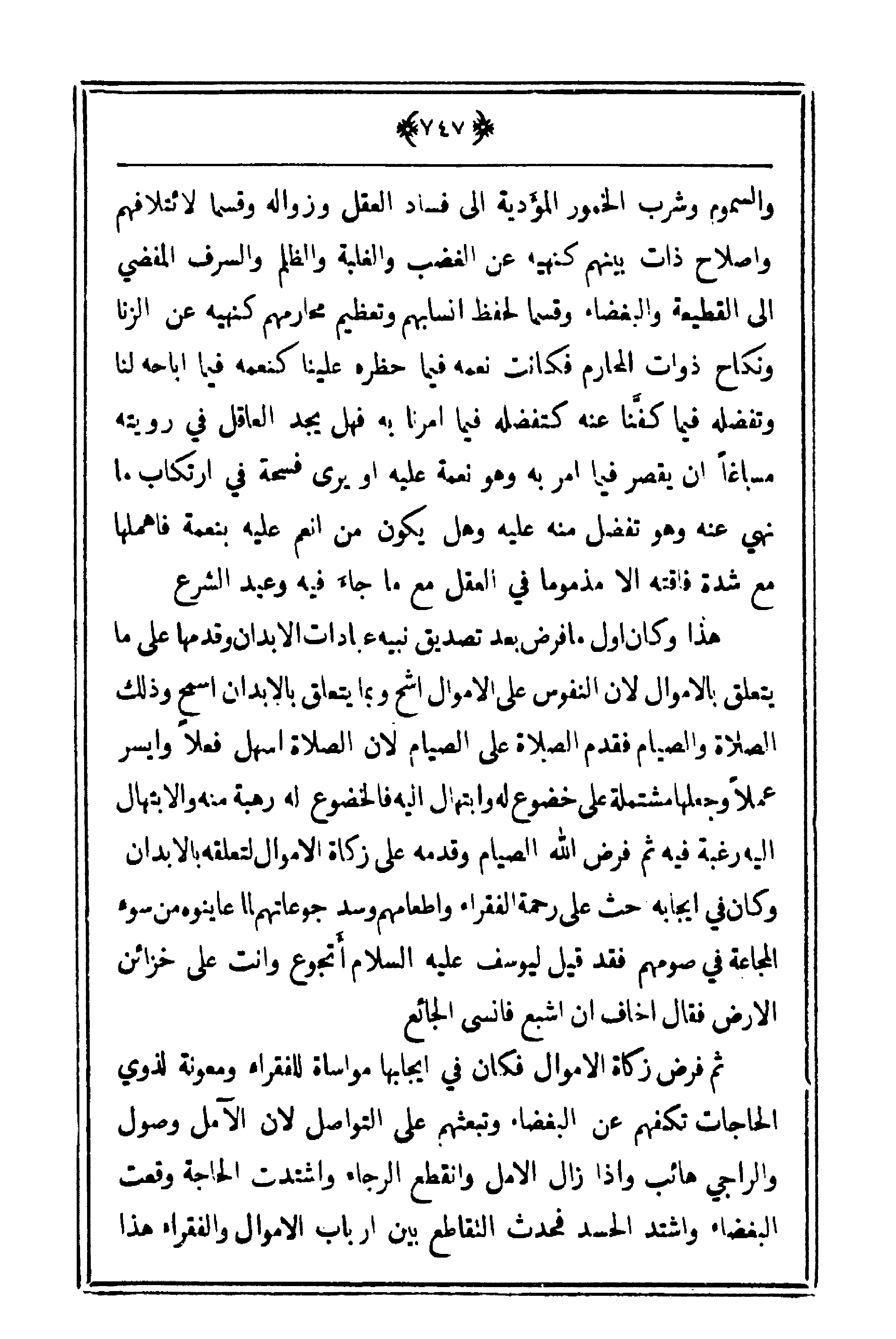 على فساد العقل وزواله وقسماً لائتلافهم وإصلاح ذات بينهم كنهيه عن الغضب والغلبة والظلم والسرف المفضي إلى القطيعة والبغضاء وقسما ًلحفظ أنسابهم وتعظيم محارمهم كنهيه عن الزنا ونكاح ذوات المحارم فكانت نعمه فيما حظره علينا كنعمه فيما أباحه لنا وتفضله فيما كفّنا عنه كتفضله فيما أمرنا به فهل يجد العاقل في رويته مساغاً أن يقصر فيما أمر به وهو نعمة عليه أو يرى فسحة في ارتكاب ما نهي عنه وهو تفضل منه عليه وهل يكون من أنعم عليه بنعمة فأهملها مع شدة فاقته إلا مذموماً في العقل مع ما جاء فيه وعيد الشرع.