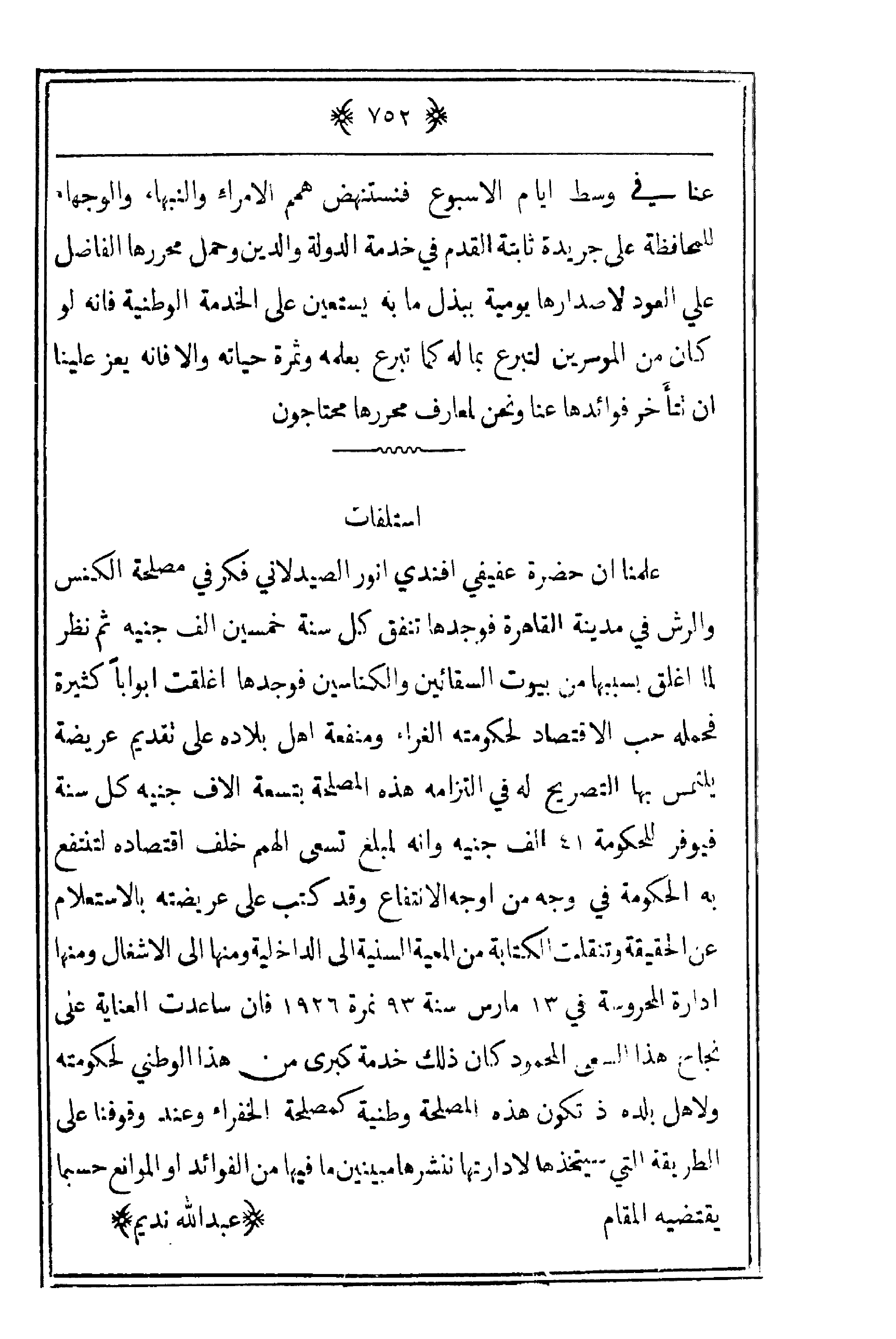 عنا في وسط أيام الأسبوع فنستنهض همم الأمراء والنبهاء والوجهاء للمحافظة على جريدة ثابتة القدم في خدمة الدولة والدين وحمل محررها الفاضل علي العود لإصدارها يومية ببذل ما به يستعين على الخدمة الوطنية فإنه لو كان من الموسرين لتبرع بما له كما تبرع بعلمه وثمرة حياته وإلا فإنه يعز علينا أن تتأخر فوائدها عنا ونحن لمعارف محررها محتاجون.
