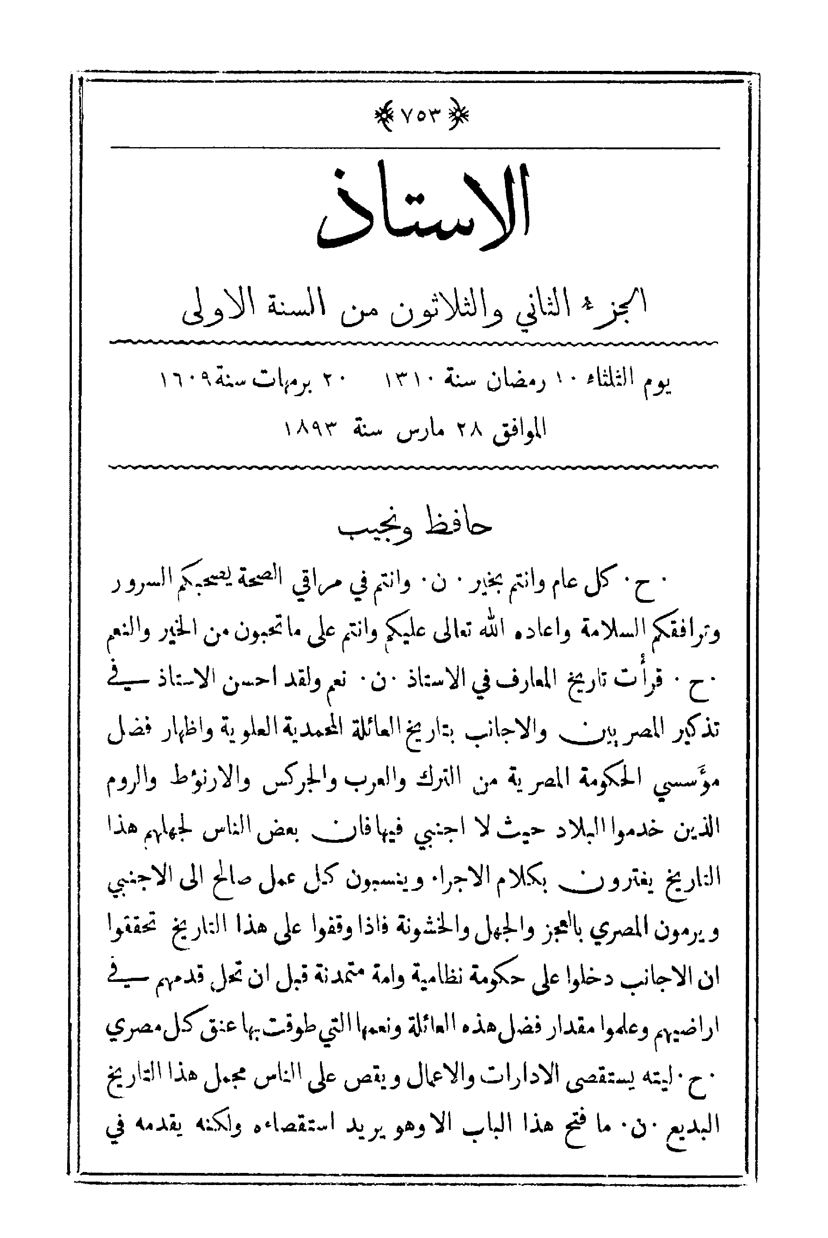 . ح. كل عام وأنتم بخير. ن. وأنتم في مراقي الصحة يصحبكم السرور وترافقكم السلامة وأعاده الله تعالى عليكم وأنتم على ما تحبون من الخير والنعم. ح. قرأت تاريخ المعارف في الأستاذ. ن. نعم ولقد أحسن الأستاذ في تذكير المصريين والأجانب بتاريخ العائلة المحمدية العلوية وإظهار فضل مؤسسي الحكومة المصرية من الترك والعرب والجركس والارنؤط والروم الذين خدموا البلاد حيث لا أجنبي فيها فإن بعض الناس لجهلهم هذا التاريخ يغترون بكلام الأجراء وينسبون كل عمل صالح إلى الأجنبي ويرمون المصري بالعجز والجهل والخشونة فإذا وقفوا على هذا التاريخ تحققوا أن الأجانب دخلوا على حكومة نظامية وأمة متمدنة قبل أن تحل قدمهم في أراضيهم وعلموا مقدار فضل هذه العائلة ونعمها التي طوقت بها عنق كل مصري. ح. ليته يستقصي الإدارات والأعمال ويقص على الناس مجمل هذا التاريخ البديع. ن. ما فتح هذا الباب إلا وهو يريد استقصاء ولكنه يقدمه في