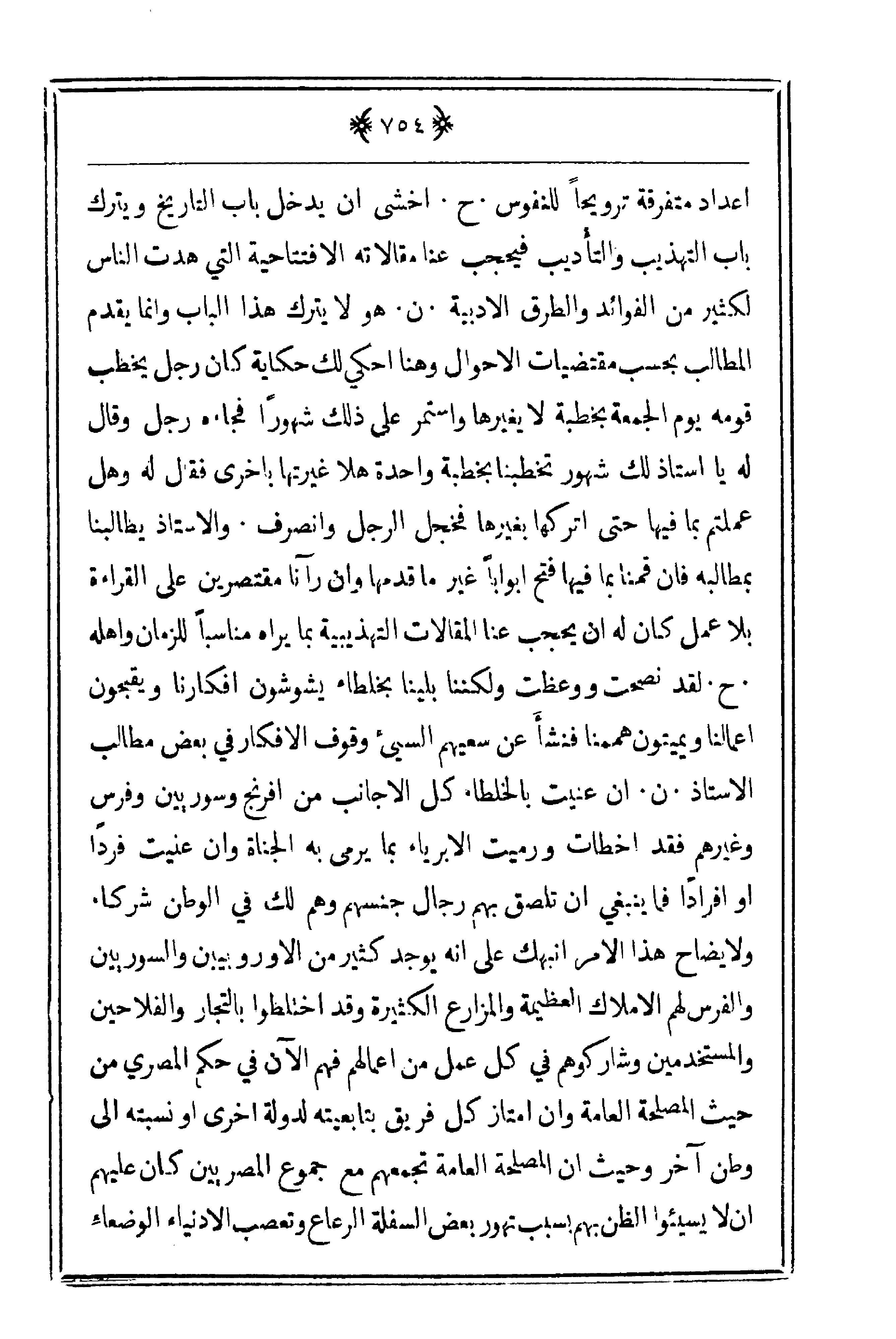 إعداد متفرقة ترويحاً للنفوس. ح. أخشى أن يدخل باب التاريخ ويترك باب التهذيب والتأديب فيحجب عنا مقالاته الافتتاحية التي هدت الناس لكثير من الفوائد والطرق الأدبية. ن. هو لا يترك هذا الباب وإنما يقدم المطالب بحسب مقتضيات الأحوال وهنا أحكي لك حكاية كان رجل يخطب قومه يوم الجمعة بخطبة لا يغيرها واستمر على ذلك شهوراً فجاءه رجل وقال له يا أستاذ لك شهور تخطبنا بخطبة واحدة هلا غيرتها بأخرى فقال له وهل عملتم بما فيها حتى أتركها بغيرها فخجل الرجل وانصرف. والأستاذ يطالبنا بمطالبه فإن قمنا بما فيها فتح أبواباً غير ما قدمها وأن رآنا مقتصرين على القراءة بلا عمل كان له أن يحجب عنا المقالات التهذيبية بما يراه مناسباً للزمان وأهله صح. لقد نصحت ووعظت ولكننا بلينا بخلطاء يشوشون أفكارنا ويقبحون أعمالنا ويميتون هممنا فنشأ عن سعيهم السيئ وقوف الأفكار وسوريين وفرس وغيرهم فقد أخطأت ورميت الأبرياء بما يرمى به الجناة وأن عنيت فرداً أو أفراداً فما ينبغي أن تلصق بهم رجال جنسهم وهم لك في الوطن شركاء ولا يضاح هذا الأمر أنبهك على أنه يوجد كثير من الأوروبيين والسوريين والفرس لهم الأملاك العظيمة والمزارع الكثيرة وقد اختلطوا بالتجار والفلاحين والمستخدمين وشاركوهم في كل عمل من أعمالهم فهم الآن في حكم المصري من حيث المصلحة العامة وإن أمتاز كل فريق بتابعيته لدولة أخرى أو نسبته على وطن آخر وحيث