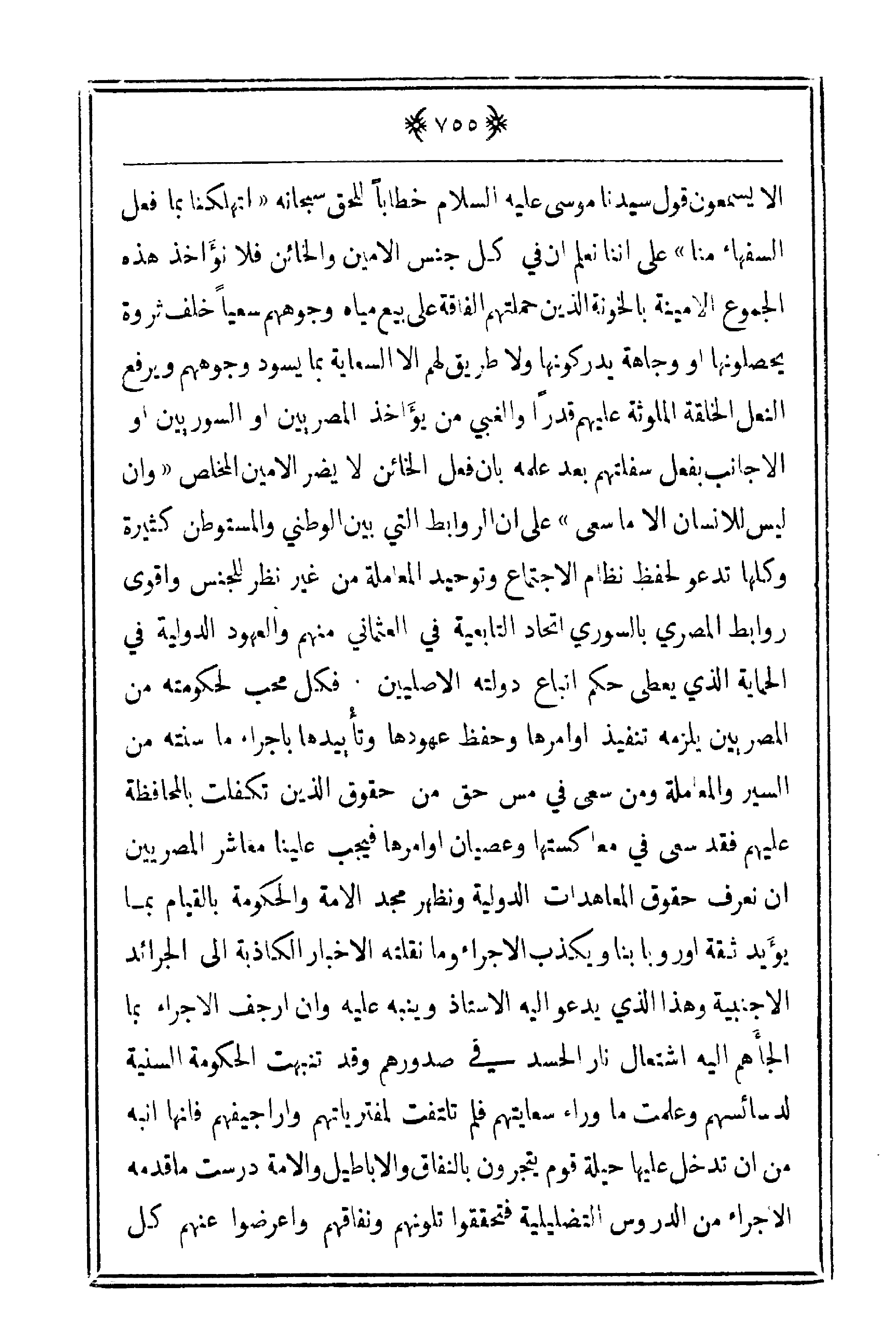 إلا يسمعون قول سيدنا موسى عليه السالم خطاباً للحق سبحانه {اتهلكنا بما فعل السفهاء منا} على أننا نعلم أن في كل جنس الأمين والخائن فلا تؤاخذ هذه الجموع الأمينة بالخونة الذين حملتهم ألفاقة على بيع مياه وجوههم سعياً خلف ثروة يحصلونها أو وجاهة يدركونها ولا طريق لهم إلا السعاية بما يسود وجوههم ويرفع النعل الخلقة الملوثة عليهم قدراً والغبي من يؤاخذ المصريين أو السويين أو الأجانب بفعل سفلتهم بعد علمه بأن فعل الخائن لا يضر الأمين المخلص {وإن ليس للإنسان إلا ما سعى} على أن الروابط التي بين الوطني والمستوطن كثيرة وكلها تدعو لحفظ نظام الاجتماع وتوحيد المعاملة من غير نظر للجنس وأقوى روابط المصري بالسوري اتحاد التابعية في العثماني منهم والعهود الدولية في الحماية الذي يعطى حكم انباع دولته الأصليين. فكل محب لحكومته من المصريين يلزمه تنفيذ أوامرها وحفظ عهودها وتأييدها بإجراء ما سنته من السير والمعاملة ومن سعى في مس حق من حقوق الذين تكفلت بالمحافظة عليهم فقد سعى في معاكستها وعصيان أوامرها فيجب علينا معاشر المصريين أن نعرف حقوق المعاهدات الدولية ونظهر مجد الأمة والحكومة بالقيام بما يؤيد ثقة أوروبا بنا ويكذب الإجراء وما نقلته الأخبار الكاذبة على الجرائد الأجنبية وهذا الذي يدعو إليه الأستاذ وينبه عليه وأن أرجف الإجراء بما ألجأهم إليه اشتعال نار الحسد في صدورهم وقد تنبهت الحكومة السنية لدسائسهم وعلمت ما وراء سعايتهم فلم تلتفت لمفترياتهم وأراجيفهم فإنها ابنه من أن تدخل عليها حيلة قوم يتجرون بالناف والأباطيل والأمة درست ما قدمه الإجراء من الدروس التضليلية فتحققوا تلونهم ونفاقهم وأعرضوا عنهم كل