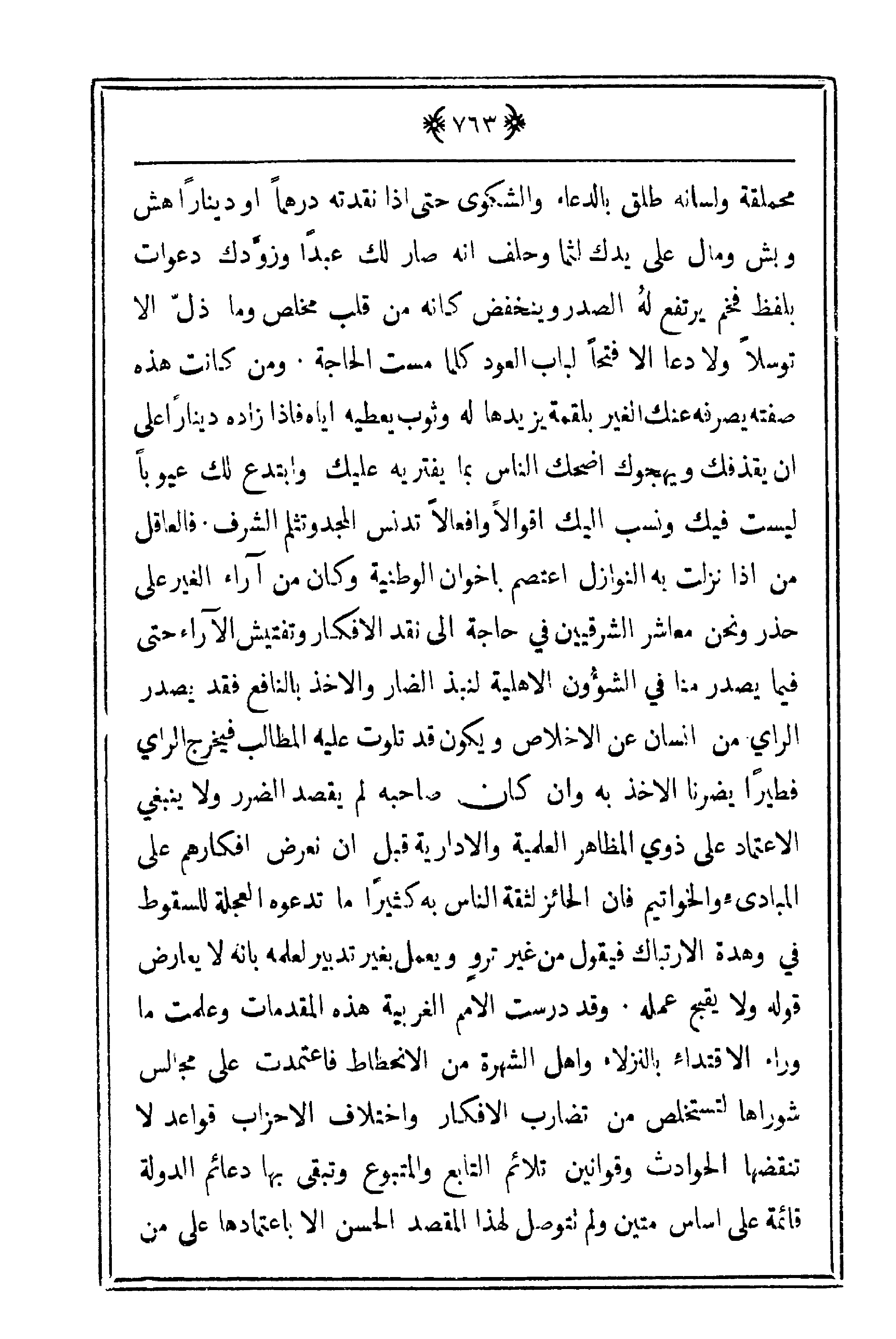 محملقة ولسانه طلق بالدعاء والشكوى حتى إذا نقدته درهماً أو جيناراً هش وبش ومال على يدك لثما وحلف أنه صار لك عبداً وزوّدك دعوات بلفظ فخم يرتفع لهُ الصدر وينخفض كأنه من قلب مخلص وما ذلّ إلا توسلاً ولا دعا إلا فتحاً لباب العود كلما مست الحاجة. ومن كانت هذه صفته يصرفه عنك الغير بلقمة يزيدها له وثوب يعطيه إياه فإذا زاده ديناراً على أن يقذفك ويهجوك أضحك الناس بما يفتريه عليك وابتدع لك عيوباً ليست فيك ونسب إليك أقوالاً وأفعالاً تدنس المجد وتثلم الشرف. فالعقل من إذا نزلت به النوازل اعتصم بإخوان الوطنية وكان من آراء الغير على حذر ونحن معاشر الشرقيين في حاجة إلى نقد الأفكار وتفتيش الآراء حتى فيما يصدر منا في الشؤُون الأهلية لنبذ الضار والأخذ بالنافع فقد يصدر الرأي من إنسان عن الإخلاص ويكون قد تلوت عليه المطالب فيخرج الرأي فطيراً يضرنا الأخذ به وأن كان صاحبه لم يقصد الضرر ولا ينبغي الاعتماد على ذوي المظاهر العلمية والإدارية قبل أن نعرض أفكارهم على المبادئ والخواتيم فإن الحائز لثقة الناس به كثيراً ما تدعوه العجلة للسقوط في وهدة الارتباك فيقول من غير تروٍ ويعمل بغير تدبير لعلمه بأنه لا يعارض قوله ولا يقبح عمله. وقد درست الأمم الغربية هذه المقدمات وعلمت ما وراء الاقتداء بالنزلاء وأهل الشهرة من الانحطاط فاعتمدت على مجالس شوراها لتستخلص من تضارب الأفكار واختلاف الأحزاب قواعد لا تنقضها الحوادث وقوانين تلائم التابع والمتبوع وتبقى بها دعائم الدولة قائمة على أساس متين ولم تتوصل لهذا المقصد الحسن إلا باعتمادها على من