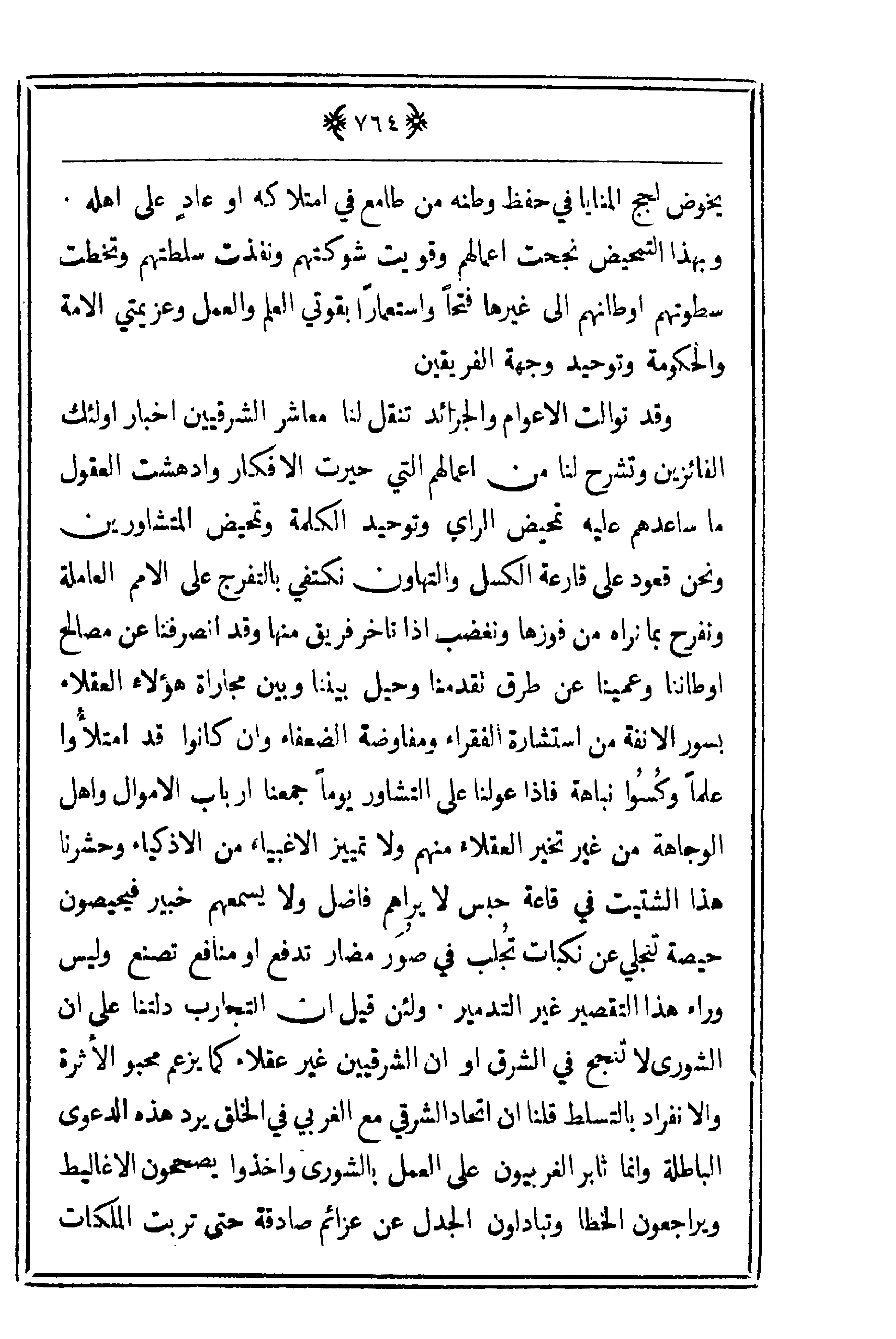 مصالح أوطاننا وعمينا عن طرق تقدمنا وحيل بيننا وبين مجاراة هؤلاء العقلاء بسور الأنفة من استشارة الفقراء ومفاوضة الضعفاء وإن كانوا قد امتلأُوا علماً وكُسُوا نباهة فإذا عولنا على التشاور يوماً جمعنا أرباب الأموال وأهل الوجاهة من غير تخير العقلاء منهم ولا تمييز الأغبياء من الأذكياء وحشرنا هذا الشتيت في قاعة حبس لا يراهم فاضل ولا يسمعهم خبير فيحيصون حيصة تنجلي عن نكبات تُجلب في صور مضار تدفع أو منافع تصنع وليس وراء هذا التقصير غير التدمير. ولئن قيل أن التجارب دلتنا على أن الشورى لا تنجح في الشرق أو أن الشرقيين غير عقلاء كما يزعم محبو الأثرة والانفراد بالتسلط قلنا إن اتحاد الشرقي مع الغربي في الخلق يرد هذه الدعوى الباطلة وإنما ثابر الغربيون على العمل بالشورى وأخذوا يصححون الأغاليط ويراجعون الخطأ وتبادلون الجدل عن عزائم صادقة حتى تربت الملكات