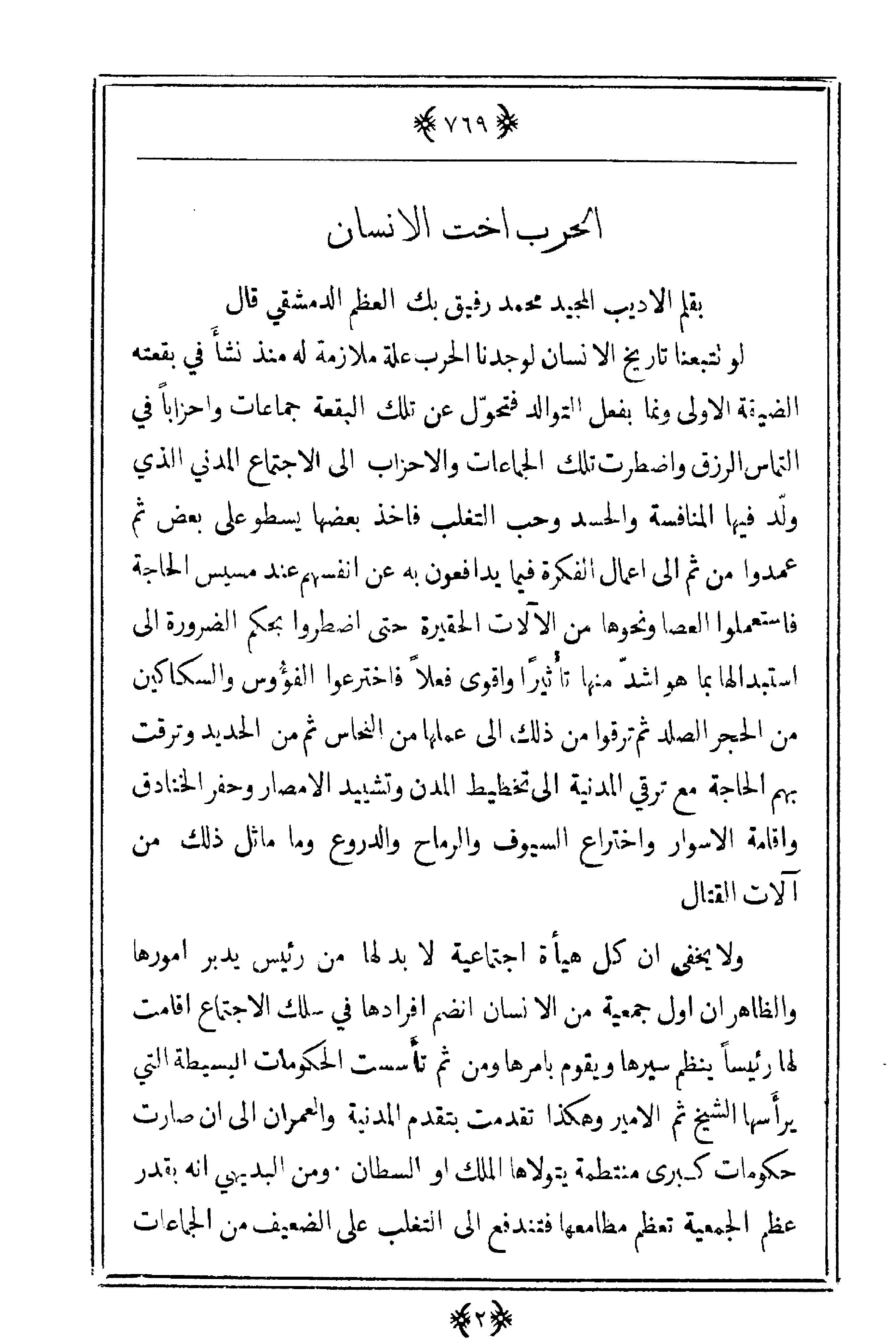 ولا يخفى أن كل هيأة اجتماعية لابد لها من رئيس يدبر أمورها والظاهران أول جمعية من الإنسان انضم أفرادها في سلك الاجتماع أقامت لها رئيساً ينظم سيرها ويقوم بأمرها ومن ثم تأسست الحكومات البسيطة التي يرأسها الشيخ ثم الأمير وهكذا تقدمت بتقدم المدينة والعمران إلى أن صارت حكومات كبرى منتظمة يتولاها الملك أو السلطان ومن البديهي أنه يقدر عظم الجمعية تعظم مطامعها فتندفع إلى التغلب على الضعيف من الجماعات