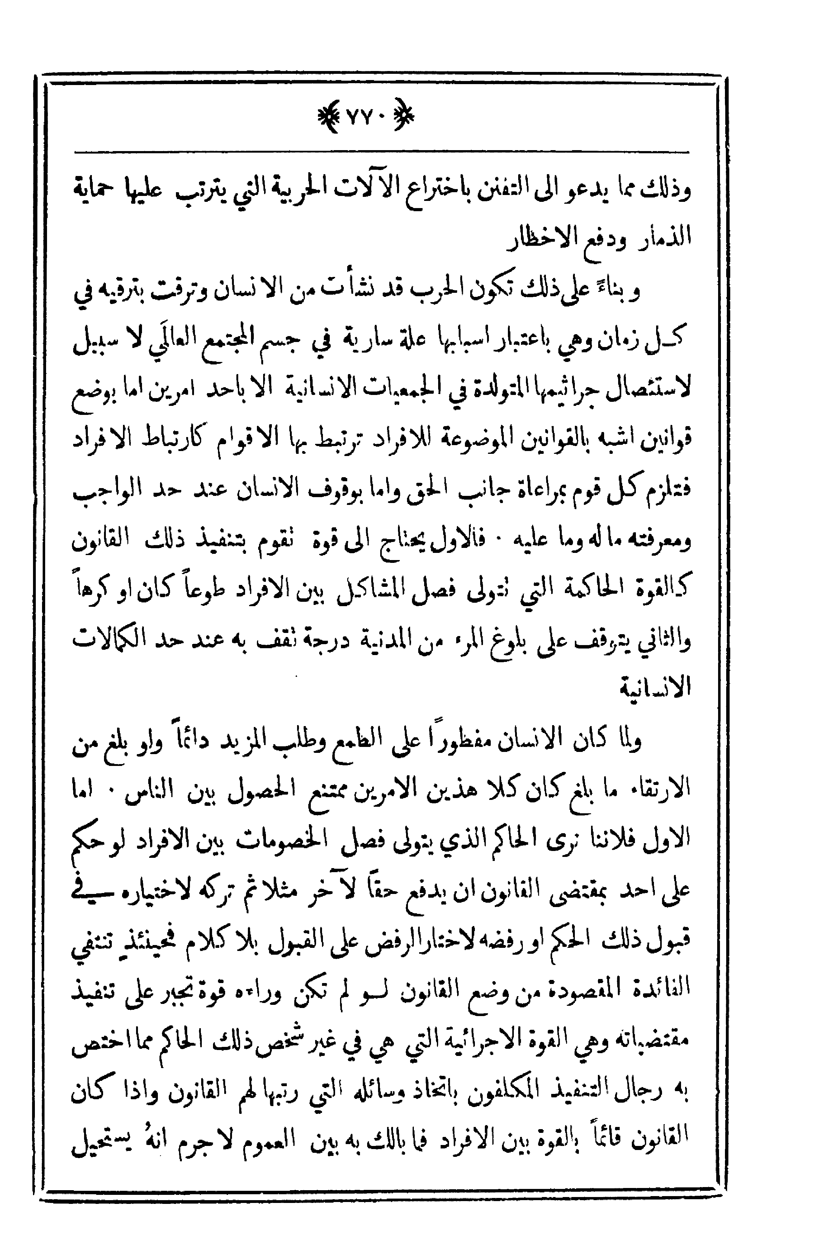 وبناء على ذلك تكون الحرب قد نشأت من الإنسان وترقت بترقيه في كل زمان وهي باعتبار أسبابها علة سارية في جسم المجتمع العالمي لا سبيل لاستئصال جراثيمها المتولدة في الجمعيات الإنسانية إلا بأحد أمرين أما بوضع قوانين أشبه بالقوانين الموضوعة للأفراد ترتبط بها الأقوام كارتباط الأفراد فتلزم كل قوم بمراعاة جانب الحق وأما بوقوف الإنسان عند حد الواجب ومعرفته ماله وما عليه. فالأول يحتاج على قوة تقوم بتنفيذ ذلك القانون كالقوة الحاكمة التي تتولى فصل المشاكل بين الأفراد طوعاً كان أو كرهاً والثاني يتوقف على بلوغ المرء من المدنية درجة تقف به عند حد الكمالات الإنسانية.