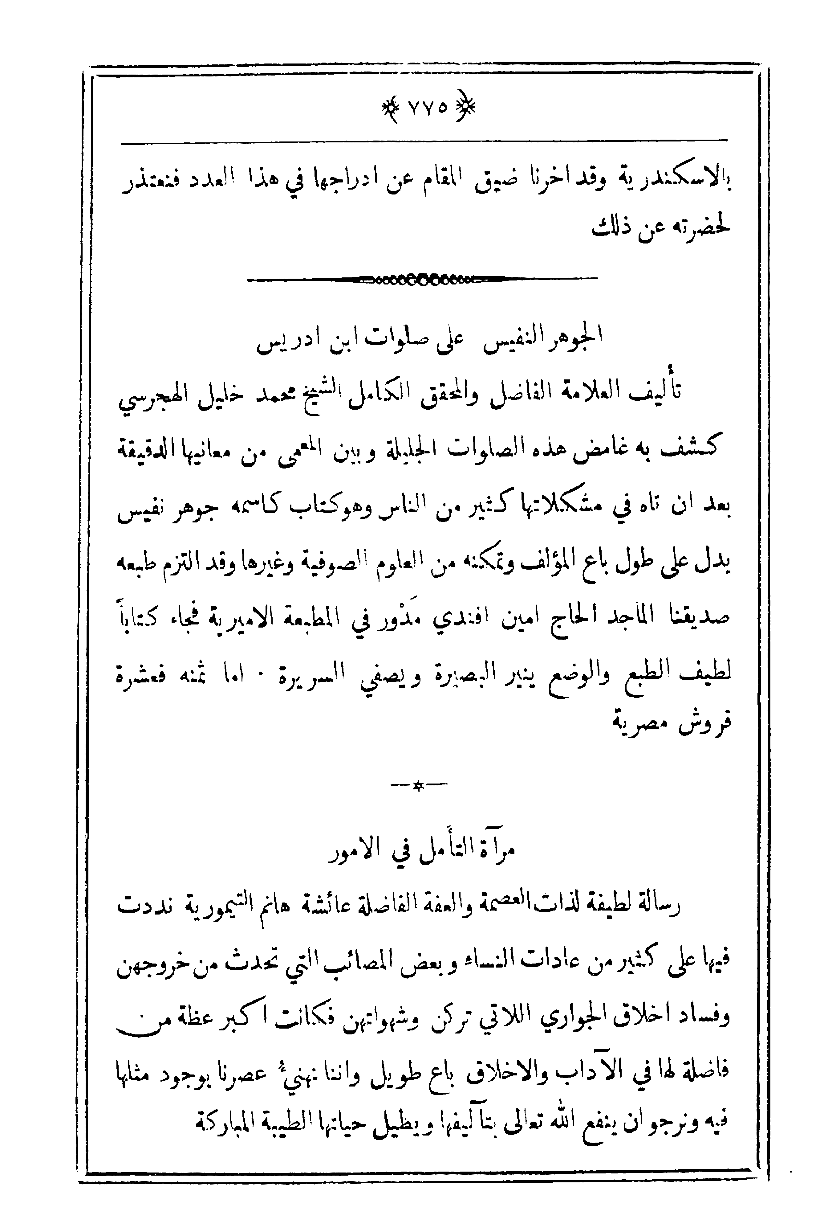 تأليف العلامة الفاضل والمحقق الكامل الشيخ محمد خليل الهجرسي كشف به غامض هذه الصلوات الجليلة وبين المعمى من معانيها الدقيقة بعد أن تاه في مشكلاتها كثير من الناس وهو كتاب كأسمه جوهر نفيس يدل على طول باع المؤلف وتمكنه من العلوم الصوفية وغيرها وقد التزم طبعه صديقنا الماجد الحاج أمين أفندي مَدْور في المطبعة الأميرية فجاء كتاباً لطيف الطبع والوضع ينير البصيرة ويصفي السريرة. أما ثمنه فعشرة قروش مصرية.