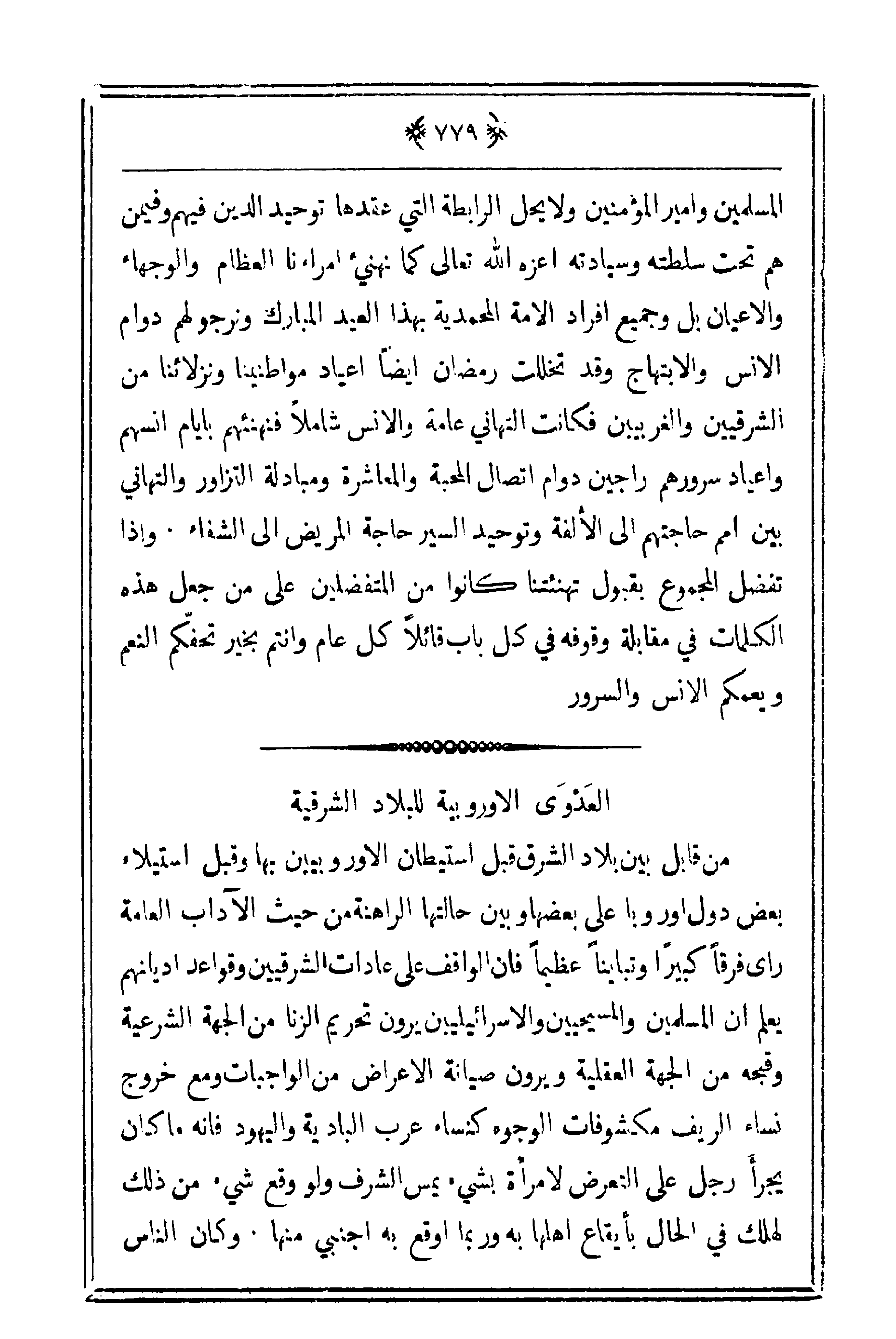 المسلمين وأمير المؤمنين ولا يحل الرابطة التي عقدها توحيد الدين فيهم وفيمن هم تحت سلطته وسيادته أعزه الله تعالى كما نهنيء أمراءنا العظام والوجهاء والأعيان بل وجميع أفراد الأمة المحمدية بهذا العيد المبارك ونرجو لهم دوام الإنس والابتهاج وقد تخللت رمضان أيضاً أعياد مواطنينا ونزلائنا من الشرقيين والغربيين فكانت التهاني عامة والإنس شاملاً فنهنئهم بأيام أنسهم وأعياد سرورهم راجين دوام اتصال المحبة والمعاشرة ومبادلة التزاور والتهاني بين أمم حاجتهم على الألفة وتوحيد السير حاجة المريض على الشفاء. وإذا تفضل المجموع بقبول تهنئتنا كانوا من المتفضلين على من جعل هذه الكلمات في مقابلة وقوفه في كل باب قائلاً كل عام وأنتم بخير تحفكم النعم ويعمكم الإنس والسرور.