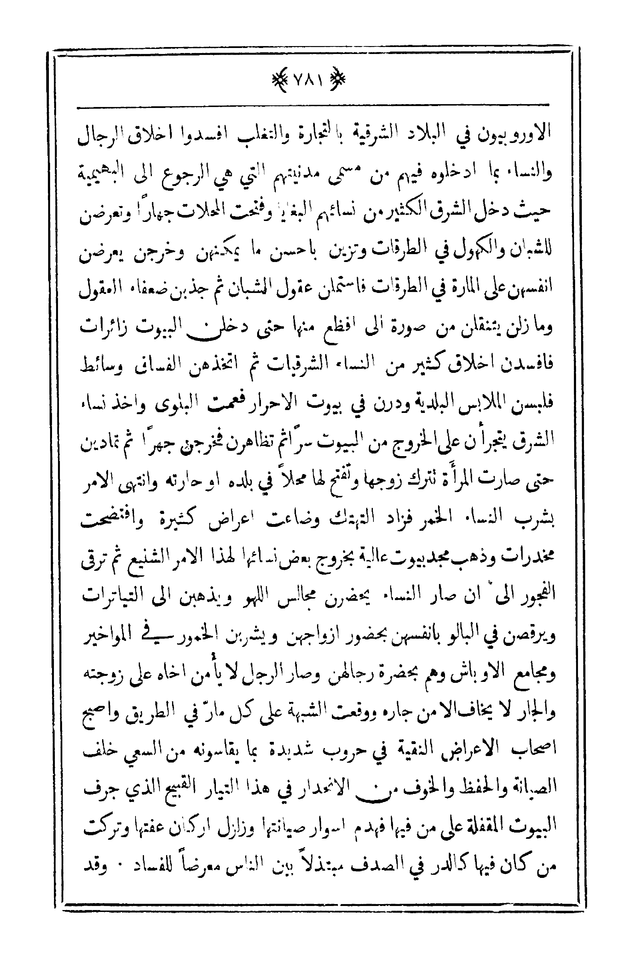 فيهم من مسمى مدنيتهم التي هي الرجوع إلى البهيمية حيث دخل الشرق الكثير من نسائهم البغايا وفتحت المحلات جهاراً وتعرضن للشبان والكهول في الطرقات وتزين بأحسن ما يمكنهن وخرجن يعرضن أنفسهن على المارة في الطرقات فاستملن عقول الشبان ثم جذبن ضعفاء العقول وما زلن يتنقلن من صورة إلى أفظع منها حتى دخلن البيوت زائرات فأفسدن أخلاق كثير من النساء الشرقيات ثم اتخذهن الفساق وسائط فلبسن الملابس البلدية ودرن في بيوت الأحرار فعمت البلوى وأخذ نساء الشرق يتجرأن على الخروج من البيوت سراً ثم تظاهرن فخرجن جهراً ثم تمادين حتى صارت المرأة تترك زوجها وتفتح لها محلاً في بلده أو حارته وانتهى الأمر بشرب النساء الخمر فزاد التهتك وضاعت أعراض كثيرة وافتضحت مخدرات وذهب مجد بيوت عالية بخروج بعض نسائها لهذا الأمر الشنيع ثم ترقى الفجور إلى أن صار النساء يحضرن مجالس اللهو ويذهبن إلى التياترات ويرقصن في البالو بأنفسهم بحضور أزواجهن ويشربن الخمور في المواخير ومجامع الأوباش وهم بحضرة رجالهن وصار الرجل لا يأمن أخاه على زوجته والجار لا يخاف إلا من جاره ووقعت الشبهة على كل مارّ في الطريق وأصبح أصحاب الأعراض النقية في حروب شديدة بما يقاسونه من السعي خلف الصيانة والحفظ والخوف من الانحدار في هذا التيار القبيح الذي جرف البيوت المقفلة على من فيها فهدم أسوار صيانتها وزلزل أركان عفتها وتركت من كان فيها كالدر في الصدف مبتذلاً بين الناس معرضاً للفساد. وقد