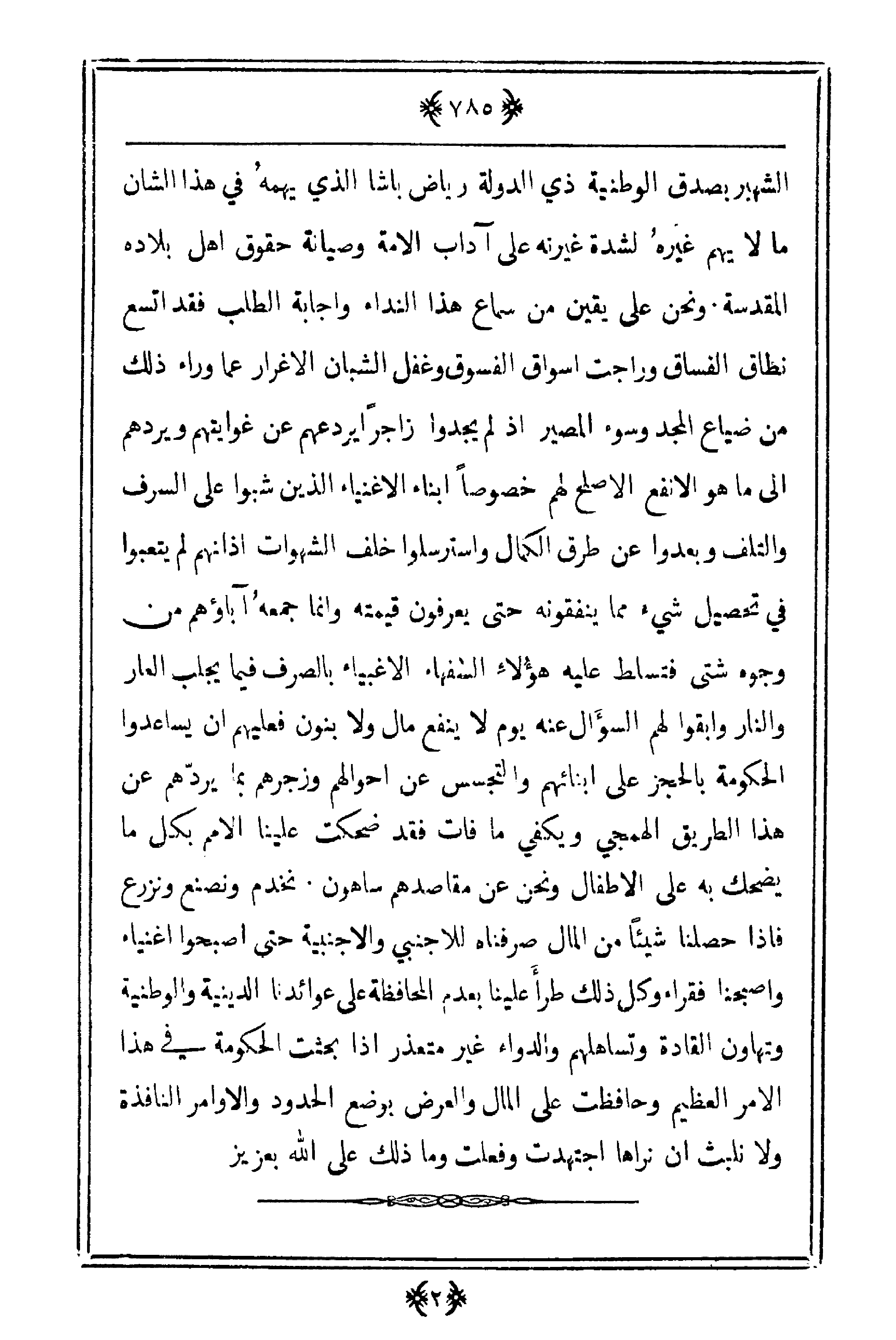 الشهير بصدق الوطنية ذي الدولة رياض باشا الذي يهمهُ في هذا الشأن ما لا يهم غيرهُ لشدة غيرته على آداب الأمة وصيانة حقوق أهل بلاده المقدسة. ونحن على يقين من سماع هذا النداء وإجابة الطلب فقد اتسع نطاق الفساق وراجت أسواق الفسوق وغفل الشبان الأغرار عما وراء ذلك من ضياع المجد وسوء المصير إذ لم يجدوا زاجراً يردعهم عن غوايتهم ويردهم إلى ما هو الأنفع الأصلح لهم خصوصاً أبناء الأغنياء الذين شبوا على السرف والتلف وبعدوا عن طرق الكمال واسترسلوا خلف الشهوات آذانهم لم يتعبوا في تحصيل شيء مما ينفقونه حتى يعرفون قيمته وإنما جمعهُ آباؤهم من وجوه شتى فتسلط عليه هؤلاء السفهاء الأغبياء بالصرف فيما يجلب العار والنار وابقوا لهم السؤال عنه يوم لا ينفع مال ولا بنون فعليهم