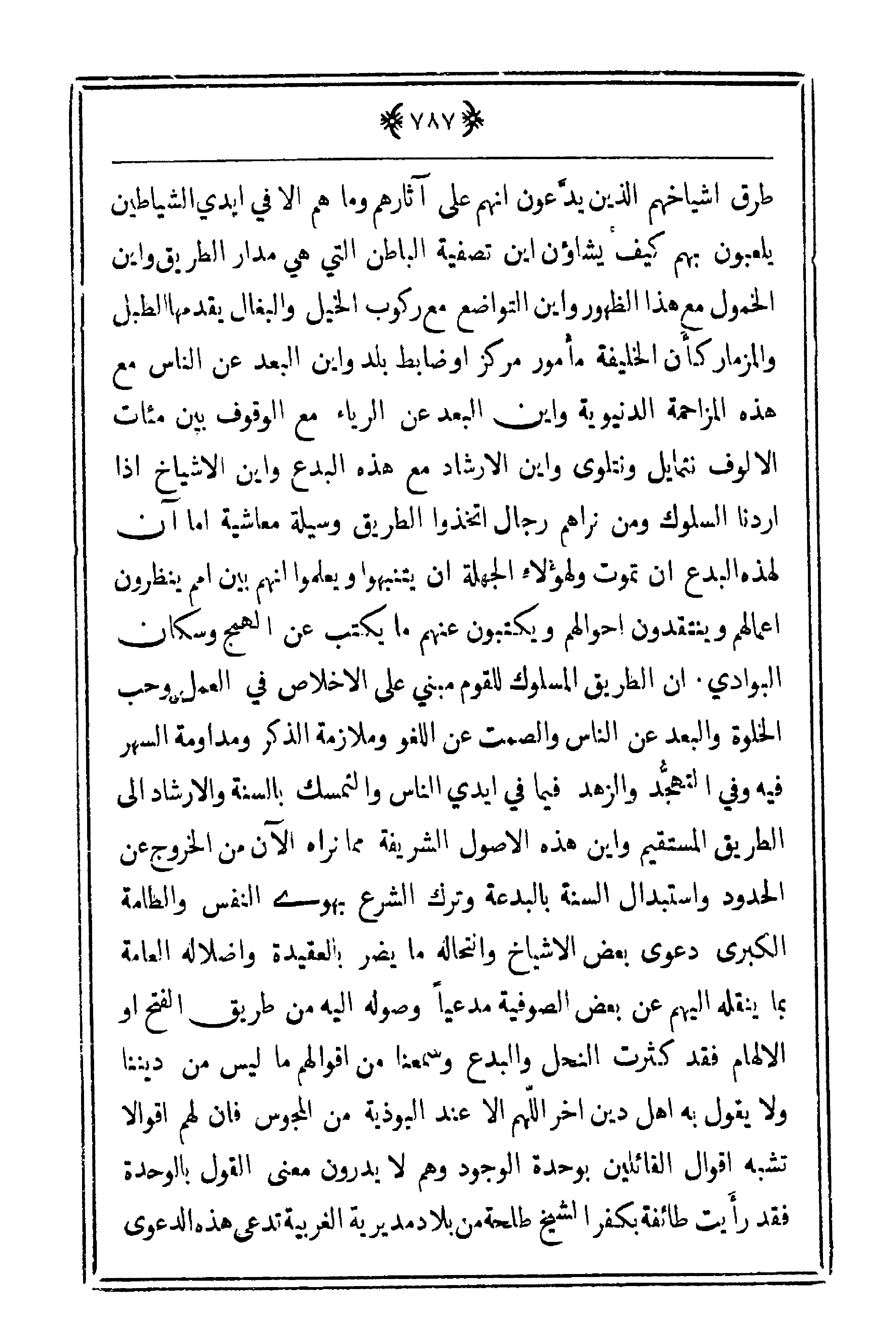 طرق أشياخهم الذين يدّعون أنهم على آثارهم وما هم إلا في أيدي الشياطين يلعبون بهم كيف يشاؤن أين تصفية الباطن التي هي مدار الطريق وأين الخمول مع هذا الظهور وأين التواضع مع ركوب الخيل والبغال يقدمها الطبل والمزمار كأن الخليفة مأمور مركز أو ضابط بلد وأين البعد عن الناس مع هذه المزاحمة الدنيوية وأين البعد عن الرياء مع الوقوف بين مئات الألوف نتمايل ونتلوى وأين الإرشاد مع هذه البدع وأين الأشياخ إذا أردنا السلوك ومن نراهم رجال اتخذوا الطريق وسيلة معاشية أما آن لهذه البدع أن تموت ولهؤلاء الجهلة أن يتنبهوا ويعلموا أنهم بين أمم ينظرون أعمالهم وينتقدون أحوالهم ويكتبون عنهم ما يكتب عن الهمج وسكان البوادي. إن الطريق المسلوك للقوم مبني على الإخلاص في العمل وحب الخلوة والبعد عن الناس والصمت عن اللغو وملازمة الذكر ومداومة السهر فيه وفي التهجُّد والزهد فيما في أيدي الناس والتمسك بالسنة والإرشاد إلى الطريق المستقيم وأين هذه الأصول الشريفة مما نراه الآن من الخروج عن الحدود واستبدال السنة بالبدعة وترك الشرع بهوى النفس والطامة الكبرى دعوى بعض الأشياخ وانتحاله ما يضر بالعقيدة وإصلاحه العامة بما ينقله إليهم عن بعض الصوفية مدعياً وصوله إليه من طريق الفتح أو الإلهام فقد كثرت النحل والبدع وسمعنا من أقوالهم ما ليس من ديننا ولا يقول به أهل دين أخر اللهم إلا عند البوذية من المجوس فإن لهم أقوالاً تشبه أقوال القائلين بوحدة الوجود وهم لا يدرون معنى القول بالوحدة فقد رأيت طائفة بكفر الشيخ طلحة من بلاد مديرية الغربية تدعى هذه الدعوى