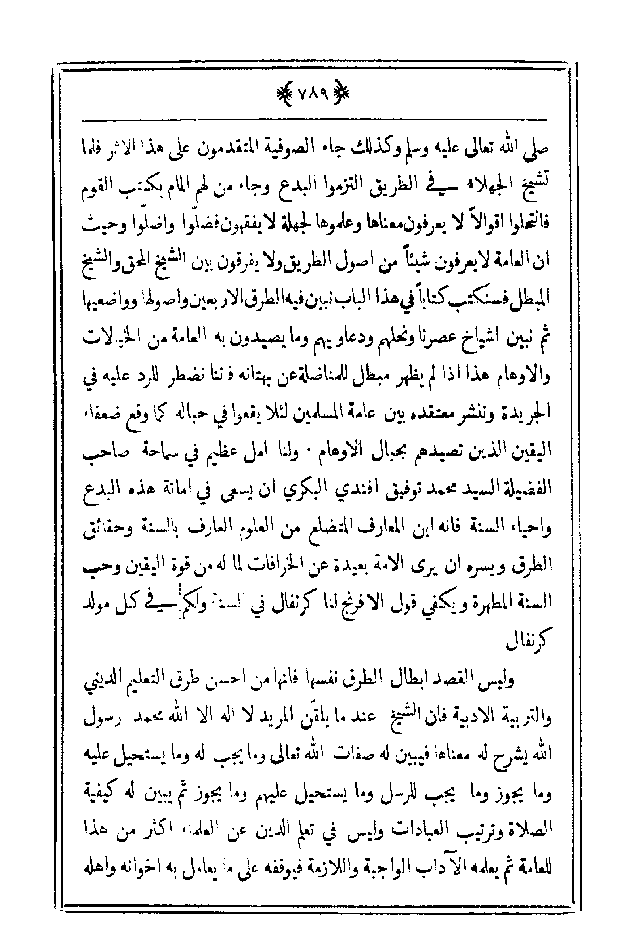 صلى الله تعالى عليه وسلم وكذلك جاء الصوفية المتقدمون على هذا الأثر فلما تشيخ الجهلاء في الطريق التزموا البدع وجاء من لهم إلمام بكتب القوم فانتحلوا أقوالاً لا يعرفون شيئاً من أصول الطريق ولا يفرقون بين الشيخ المحق والشيخ المبطل فسنكتب كتاباً في هذا الباب نبين فيه الطرق الأربعين وأصولها وواضعيها ثم نبين أشياخ عصرنا ونحلهم ودعاويهم وما يصيدون به العامة من الخيالات والأوهام هذا إذا لم يظهر مبطل للمناضلة عن بهتانه فإننا نضطر للرد عليه في الجريدة وننشر معتقده بين عامة المسلمين لئلا يقعوا في حباله كما وقع ضعفاء اليقين الذين تصيدهم بحبال الأوهام. ولنا أمل عظيم في سماحة صاحب الفضيلة السيد محمد توفيق أفندي البكري أن يسعى في إماتة هذه البدع وأحياء السنة فإنه ابن المعارف المتضلع من العلوم