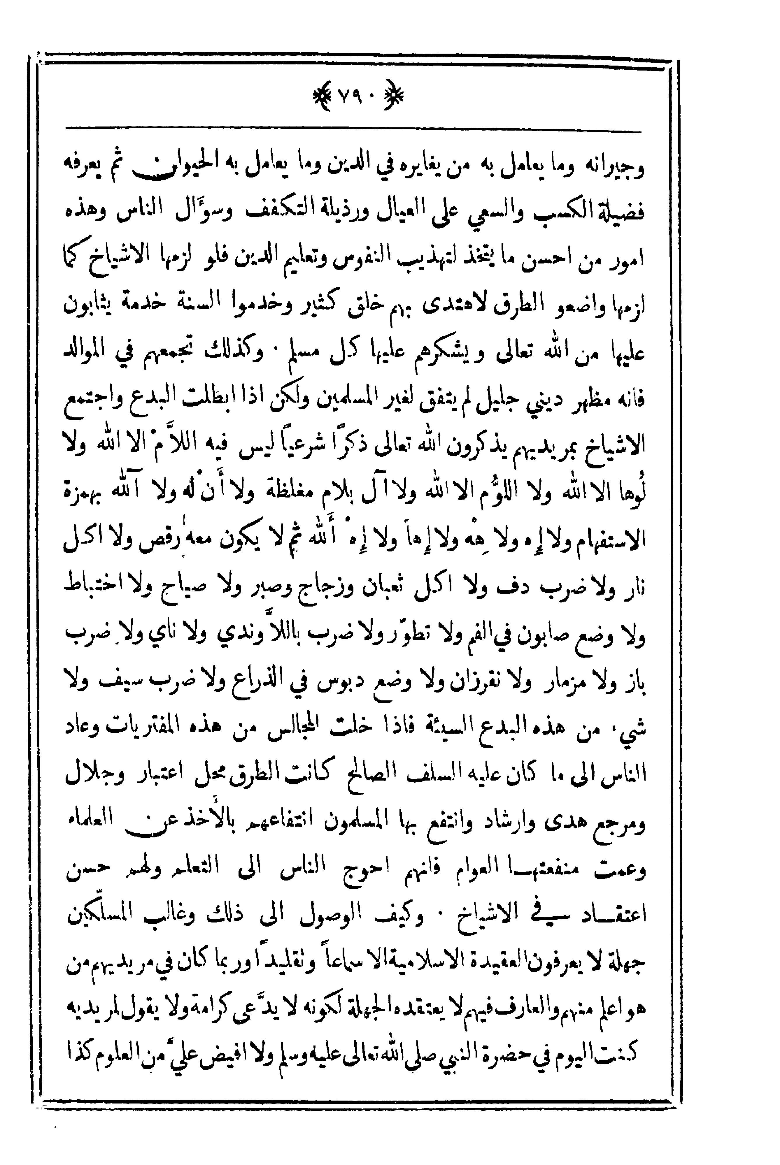 وجيرانه وما يعامل به من يغايره في الدين وما يعامل به الحيوان ثم يعرفه فضيلة الكسب والسعي على العيال ورذيلة التكفف وسؤال الناس وهذه أمور من أحسن ما يتخذ لتهذيب النفوس وتعليم الدين فلو لزمها الأشياخ كما لزمها واضعو الطرق لاهتدى بهم خلق كثير وخدموا السنة خدمة يثابون عليها من الله تعالى ويشكرهم عليها كل مسلم. وكذلك تجمعهم في الموالد فإنه مظهر ديني جليل لم يتفق لغير المسلمين ولكن إذا أبطلت البدع واجتمع فإنه مظهر ديني جليل لم يتفق لغير المسلمين ولكن إذا أبطلت البدع واجتمع الأشياخ بمريديهم يذكورن الله تعالى ذكراً شرعياً ليس فيه اللاّم إلا الله ولا لُوها إلا الله ولا اللوّم إلا الله ولا آل بلام مغلظة ولا أن له ولا آلله بهمزة الاستفهام ولا إه ولا هْه ولا إها ولا إِهْ ألله ثم لا يكون معه رقص ولا أكل نار ولا ضرب دف ولا أكل ثعبان وزجاج وصبر ولا صياح ولا اختباط نولا وضع صابون في الفم ولا تطوّر ولا ضرب باللاّوندي ولا ناي ولا ضرب باز ولا مزمار ولا نقرزان ولا وضع دبوس في الذراع ولا ضرب سيف ولا شيء من هذه البدع السيئة فإذا خلت المجالس من هذه المفتريات وعاد الناس إلى ما كان عليه السلف الصالح كانت الطرق محل اعتبار وجلال ومرجع هدى وارشاد وانتفع بها المسلمون انتفاعهم بالأخذ عن العلماء وعمت منفعتها العوام فإنها أحوج الناس إلى التعلم ولهم حسن اعتقاد في الأشياخ. وكيف الوصول إلى ذلك وغالب المسلكين جهلة لا يعرفون العقيدة الإسلامية إلا سماعاً وتقليداً وربما كان في مريديهم من هو أعلم منهم والعارف فيهم لا يعتقده الجهلة لكونه لا يدَّعى كرامة ولا يقول لمريديه كنت اليوم في حضرة النبي صلى الله
