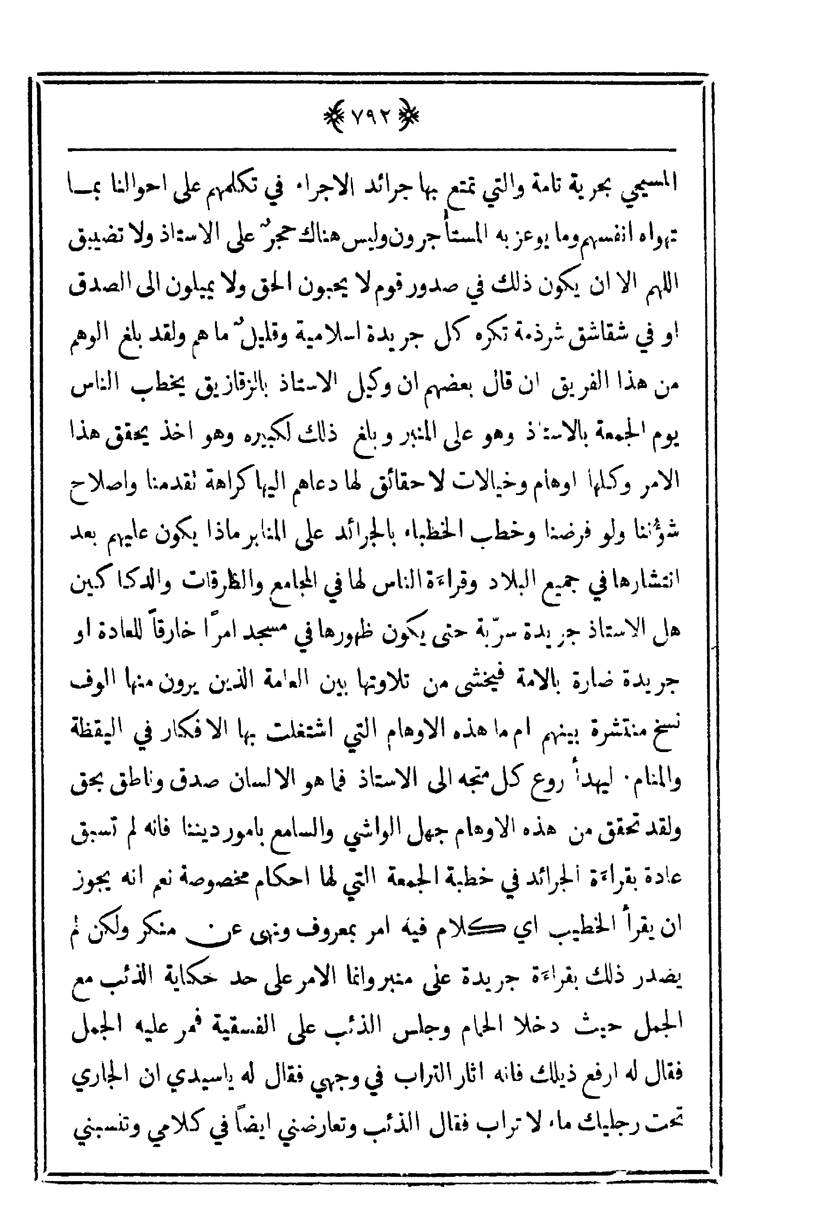 المسيحي بحرية تامة والتي تمتع بها جرائد الأجراء في تكلمهم على أحوالنا بما تهواه أنفسهم وما يوعز به المستأجرون وليس هناك حجرٌ على الأستاذ ولا تضييق اللهم إلا أن يكون ذلك في صدور قوم لا يحبون الحق ولا يميلون إلى الصدق أو في شقاشق شرذمة تكره كل جريدة إسلامية وقليلٌ ما هم ولقد بلغ الوهم من هذا الفريق أن قال بعضهم أن وكيل الأستاذ بالزقازيق يخطب الناس يوم الجمعة بالأستاذ وهو على المنبر وبلغ ذلك لكبيره وهو أخذ يحقق هذا الأمر وكلها أوهام وخيالات لا حقائق لها دعاهم إليها كراهة تقدمنا وإصلاح شؤُننا ولو فرضنا وخطب الخطباء بالجرائد على المنابر ماذا يكون عليهم بعد انتشارها في جميع البلاد وقراءة الناس لها في المجامع والطرقات والدكاكين هل الأستاذ جريدة سرّبة حتى يكون ظهورها في مسجد أمراً خارقاً للعادة أو جريدة ضارة بالأمة فيخشى من تلاوتها بين العامة الذين يرون منها ألوف نسخ منتشرة بينهم أم ما هذه الأوهام التي اشتغلت بها الأفكار في اليقظة والمنام. ليهدأ روع كل متجه إلى الأستاذ فما هو إلا لسان صدق وناطق بحق ولقد تحقق من هذه الأوهام جهل الواشي والسامع بأمور ديننا فإنه لم تسبق عادة بقراءة الجرائد في خطبة الجمعة التي لها أحكام مخصوصة نعم أنه يجوز أن يقرأ الخطيب أي كالم فيه أمر بمعروف ونهى عن منكر ولكن لم يصدر ذلك