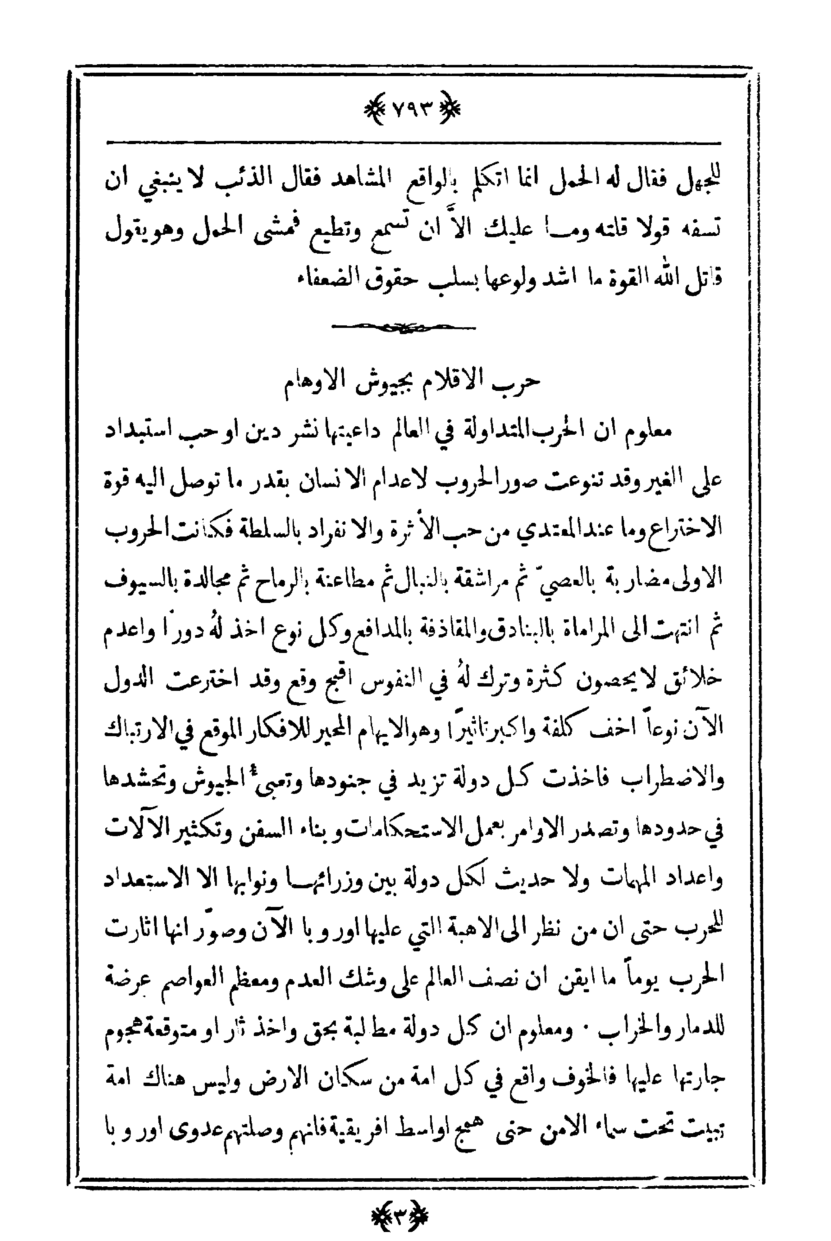 معلوم أن الحرب المتداولة في العالم داعيتها نشر دين أو حب استبداد على الغير وقد تنوعت صور الحروب لإعدام الإنسان بقدر ما توصل إليه قوة الاختراع وما عند المعتدي من حب الأثرة والانفراد بالسلطة فكانت الحروب الأولى مضاربة بالعصيّ ثم مراشقة بالنبال ثم مطاعنة بالرماح ثم مجالدة بالسيوف ثم انتهت إلى المراماة بالبنادق والمقاذفة بالمدافع وكل نوع أخذ لُه دوراً وأعدم خلائق لا يحصون كثرة وترك لهُ في النفوس أقبح وقع وقد اخترعت الدول الآن نوعاً أخف كلفة وأكبر تأثيراً وهو الإيهام المحير للأفكار الموقع في الارتباك والاضطراب فأخذت كل دولة تزيد في جنودها وتعبئُ الجيوش وتحشدها في حدودها وتصدر الأوامر بعمل الاستحكامات وبناء السفن وتكثير الآلات وإعداد المهمات ولا حديث لكل دولة بين وزرائها ونوابها إلا الاستعداد للحرب حتى إن من نظر إلى الأهبة التي عليها أوروبا الآن وصوّر أنها أثارت الحرب يوماً ما أيقن أن نصف العالم على وشك العدم ومعظم العواصم عرضة للدمار والخراب. ومعلوم أن كل دولة مطالبة بحق وأخذ ثار أو متوقعة هجوم جارتها عليها فالخوف واقع في كل أمة من سكان الأرض وليس هناك أمة تبيت تحت سماء الأمن حتى همج أواسط أفريقية فإنهم وصلتهم عدوى أوروبا