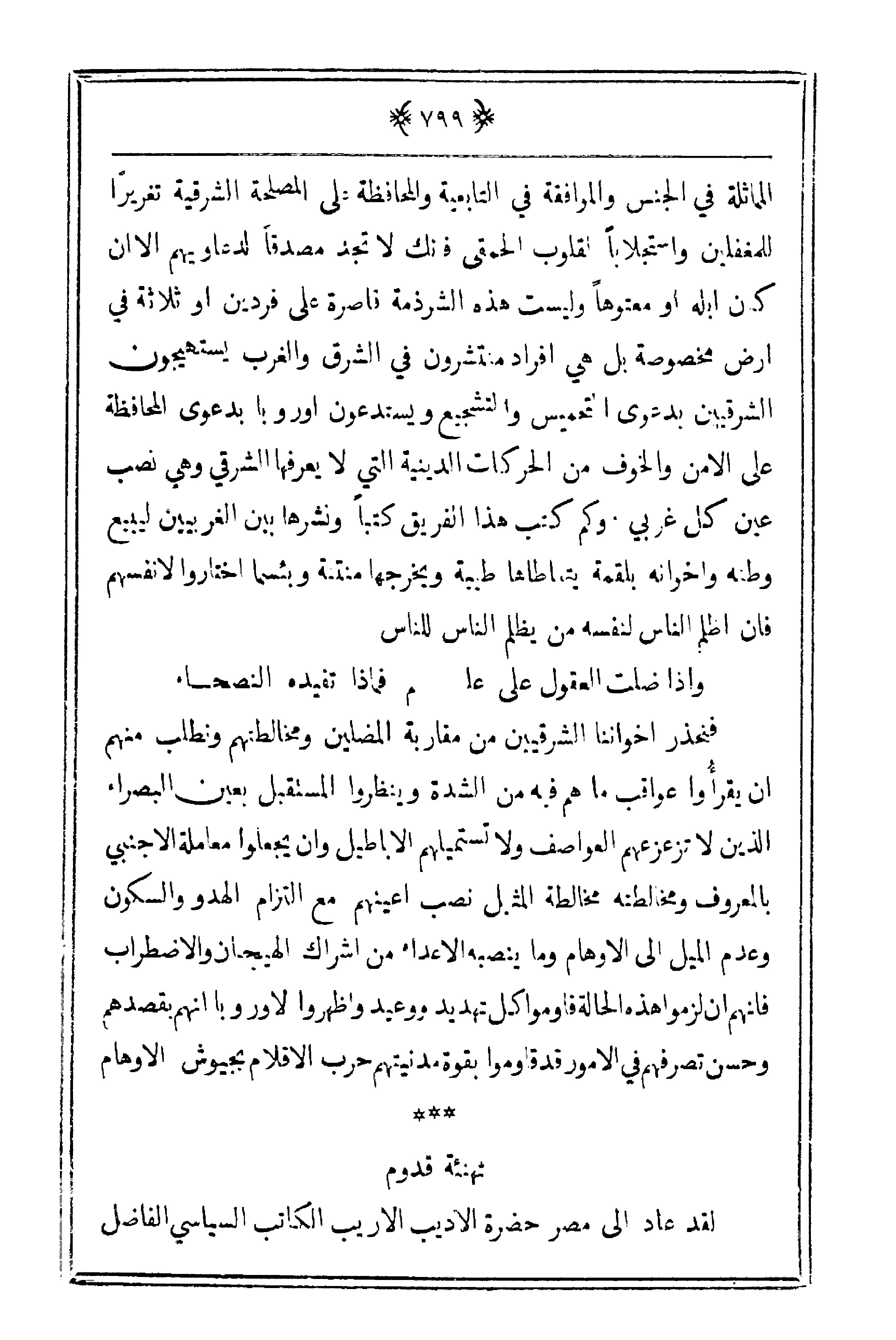 فنحذر إخواننا الشرقيين من مقاربة المضلين ومخالطتهم ونطلب منهم أن يقرأُوا عواقب ما هم فيه من الشدة وينظروا المستقبل بعين البصراء الذين لا تزعزعهم العواصف ولا تستميلهم إلا أباطيل وأن يجعلوا معاملة الأجنبي بالمعروف ومخالطته مخالطة المثيل نصب أعينهم مع التزام الهدوء والسكون وعدم الميل إلى الأوهام وما ينصبه الأعداء من إشراك الهيجان والاضطراب فإنهم أن لزموا هذه الحالة قاوموا كل تهديد ووعيد وأظهروا لأوروبا أنهم بقصدهم وحسن تصرفهم في الأمور قد قاوموا بقوة مدنيتهم حرب الأقلام بجيوش الأوهام.