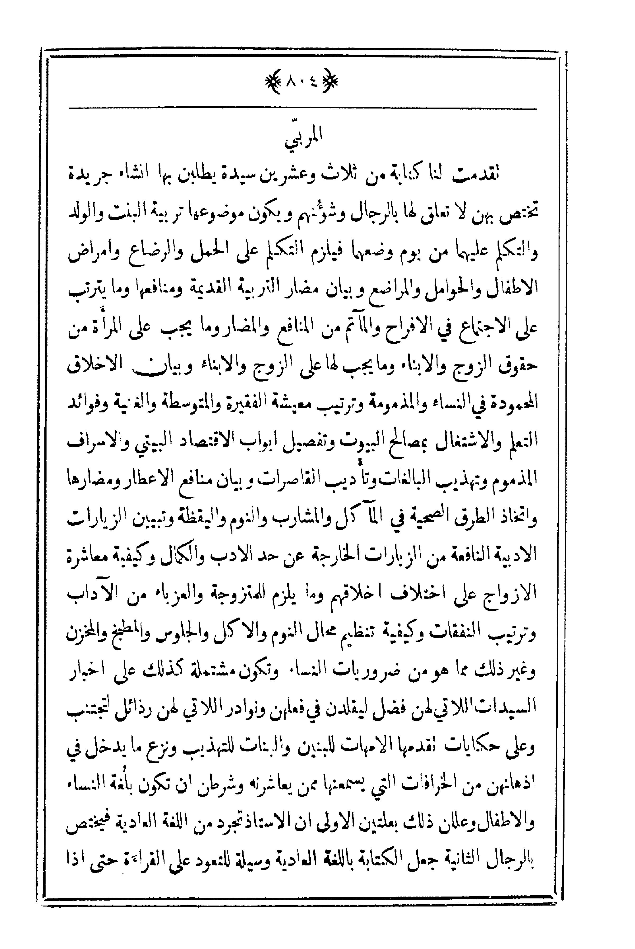 تقدمت لنا كتابة من ثلاث وعشرين سيدة يطلبن بها إنشاء جريدة تختص بهن لاتعلق لها بالرجال وشؤُنهم ويكون موضوعها تربية البنت والولد والتكلم عليهما من يوم وضعهما فيلزم التكلم على الحمل والرضاع وأمراض الأطفال والحوامل والمراضع وبيان مضار التربية القديمة ومنافعها وما يترتب على الاجتماع في الأفراح والمآتم من المنافع والمضار وما يجب على المرأة من حقوق الزوج ولأبناء وما يجب لها على الزوج والأبناء وبيان الأخلاق المحمودة في النساء والمذمومة وترتيب معيشة الفقيرة والمتوسطة والغنية وفوائد التعلم والاشتغال بمصالح البيوت وتفصيل أبواب الاقتصاد البيتي والإسراف المذموم وتهذيب البالغات وتأديب القاصرات وبيان منافع الأعطار ومضارها واتخاذ الطرق الصحية في المآكل والمشارب والنوم واليقظة وتبيين الزيارات الأدبية النافعة من الزيارات الخارجة عن حد الأدب والكمال وكيفية معاشرة الأزواج على اختلاف أخلاقهم وما يلزم للمتزوجة والعزباء من الآداب وترتيب النفقات وكيفية تنظيم محال النون والأكل والجلوس والمطبخ والمخزن وغير ذلك مما هو من ضروريات النساء وتكون مشتملة كذلك على أخبار السيدات اللاتي لهن فضل ليقلدن في فعلهن ونوادر اللاتي لهن رذائل لتجتنب وعلى حكايات تقدمها الأمهات للبنين والبنات للتهذيب ونزع ما يدخل في أذهانهن من الخرافات التي يسمعنها ممن يعاشرنه وشرطن أن تكون بلغة النساء والأطفال وعللن ذلك بعلتين الأولى أن الأستاذ تجرد من اللغة العادية فيختص بالرجال الثانية جعل الكتابة باللغة العادية وسيلة للتعود على القراءة حتى إذا
