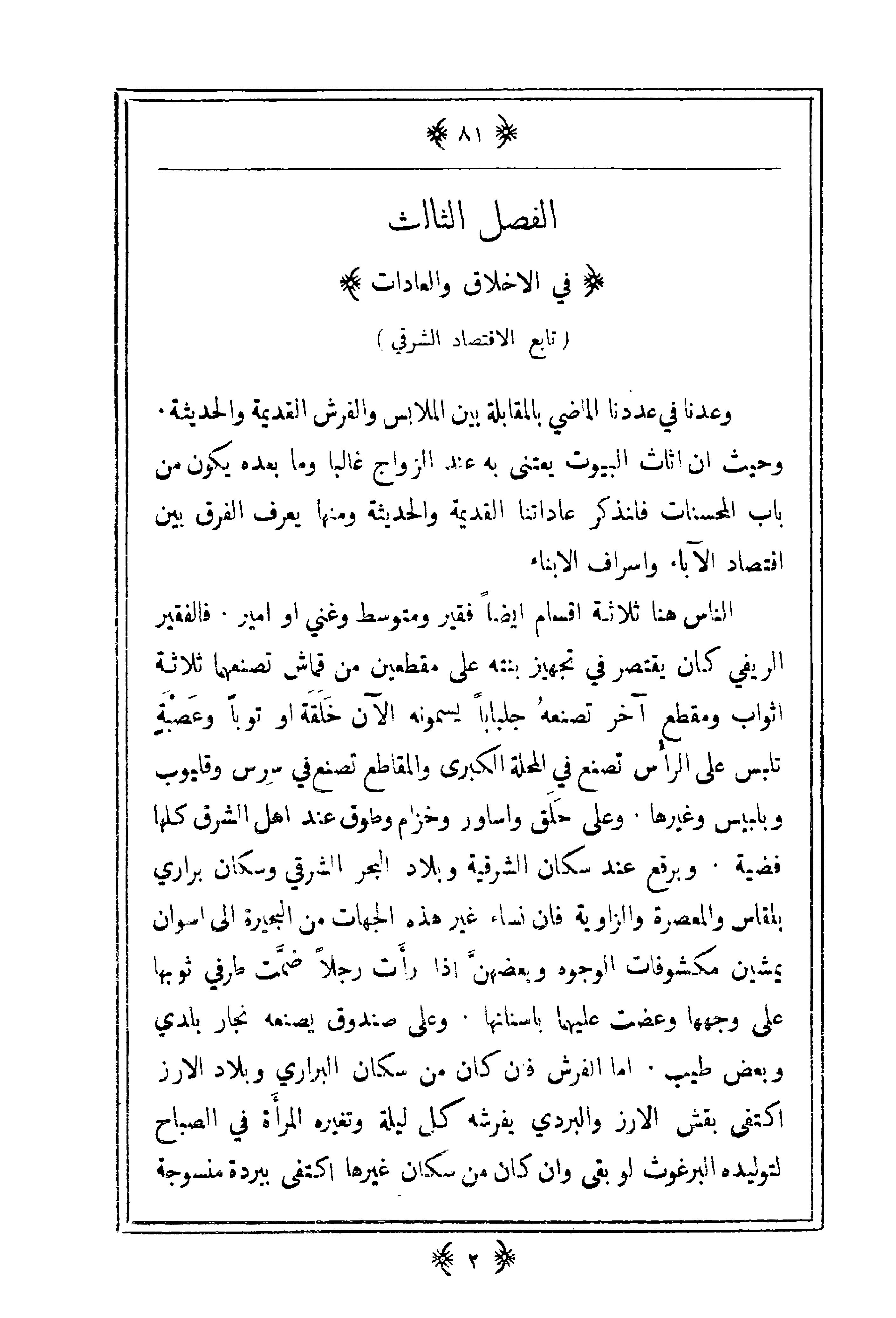 وعدنا في عددنا الماضي بالمقابلة بين الملابس والفرش القديمة والحديثة. وحيث أن أثاث البيوت يعتنى به عند الزواج غالباً وما بعده يكون من باب المحسنات فلنذكر عاداتنا القديمة والحديثة ومنها يعرف الفرق بين اقتصاد الآباء وإسراف الأبناء.