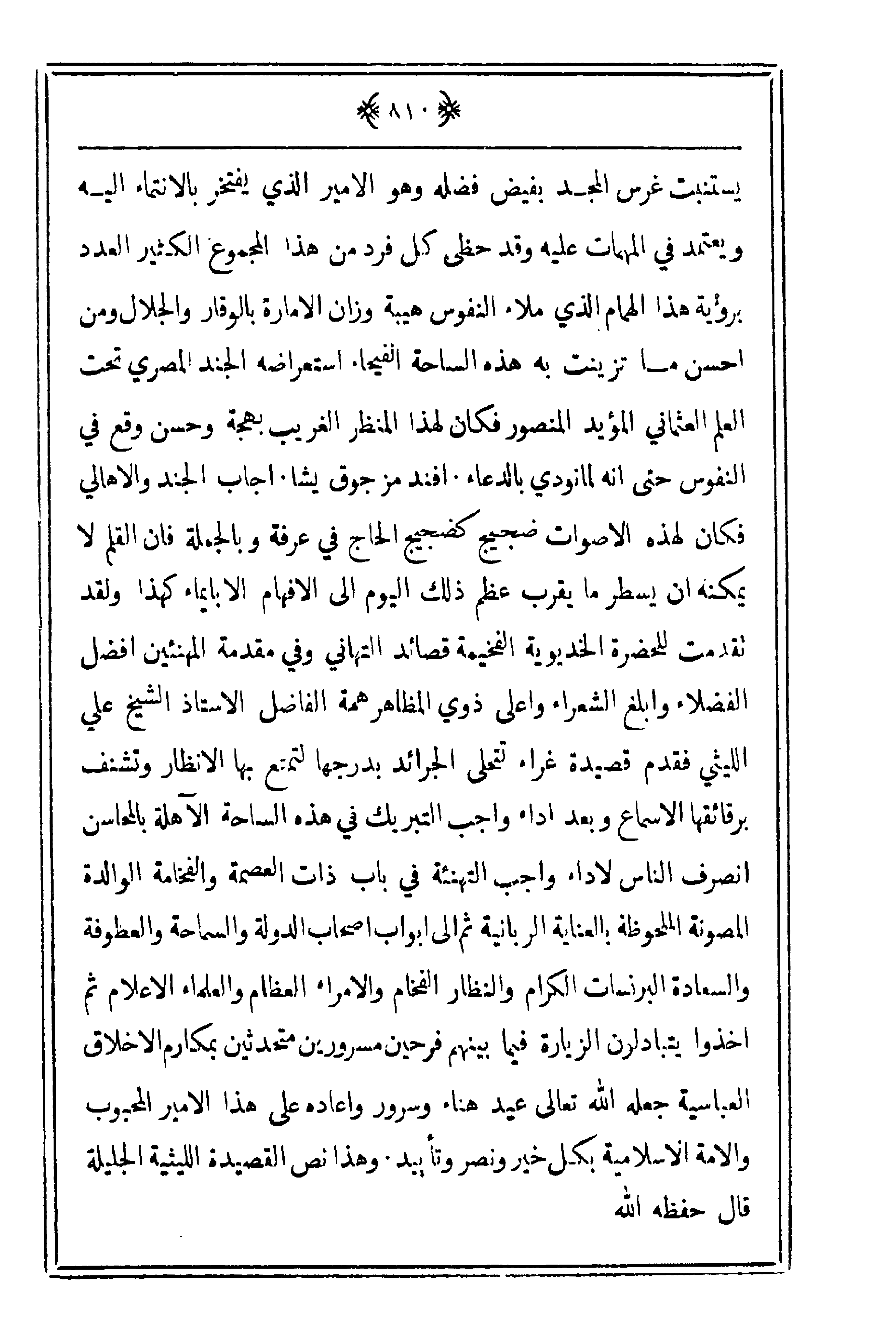 يستنبت غرس المجد بفيض فضله وهو الأمير الذي يفتخر بالانتماء إلهي ويعتمد في المهمات عليه وقد حظى كل فرد من هذا المجموع الكثير العدد برؤية هذا الهمام الذي ملاء النفوس هيبة وزان الإمارة بالوقار والجلال ومن أحسن ما تزينت به هذه الساحة الفيحاء استعراضه الجند المصري تحت العلم العثماني المؤيد المنصور فكان لهذا المنظر الغريب بهجة وحسن وقع في النفوس حتى أنه لما نودي بالدعاء. أفند مزجوق يشاء أجاب الجند والأهالي فكان لهذه الأصوات ضجيج كضجيج الحاج في عرفة وبالجملة فإن القلم لا يمكنه أن يسطر ما يقرب عظم ذلك اليوم إلى الأفهام إلا بإيماء كهذا ولقد تقدمت للحضرة الخديوية الفخيمة قصائد التهاني وفي مقدمة المهنئين أفضل الفضلاء وأبلغ الشعراء وأعلى ذوي المظاهر همة الفاضل الأستاذ الشيخ علي الليثي فقدم قصيدة غراء تتحلى الجرائد بدرجها لتمتع بها الأنظار وتشنف برقائقها الأسماع وبعد أداء واجب التبريك في هذه الساحة الآهلة بالمحاسن انصرف الناس لأداء واجب التهنئة في باب ذات العصمة والفخامة الوالدة المصونة الملحوظة بالعناية الربانية ثم إلى أبواب أصحاب الدولة والسماحة والعطوفة والسعادة الرنسات الكرام والنظار الفخام والأمراء العظام والعلماء الأعلام ثم أخذوا يتبادلون الزيارة فيما بينهم فرحين مسرورين متحدثين بمكارم الأخلاق العباسية جعله الله تعالى عيد هناء وسرور وأعاده على هذا الأمير المحبوب والأمة الإسلامية بكل خير ونصر وتأييد. وهذا نص القصيدة الليثية الجليلة قال