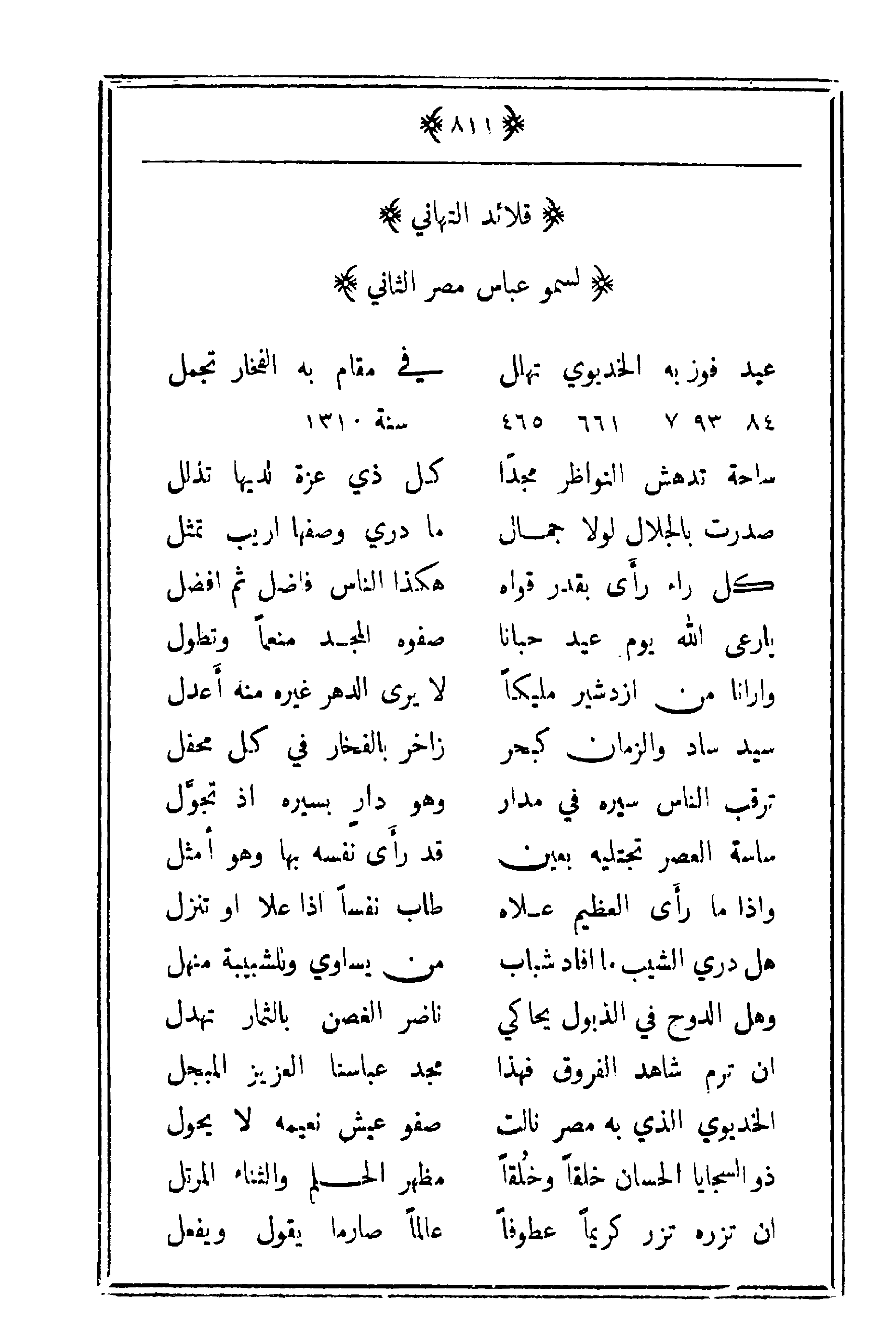 عيد فوز به الخديوي تهلل ... في مقام به الفخار تجمل