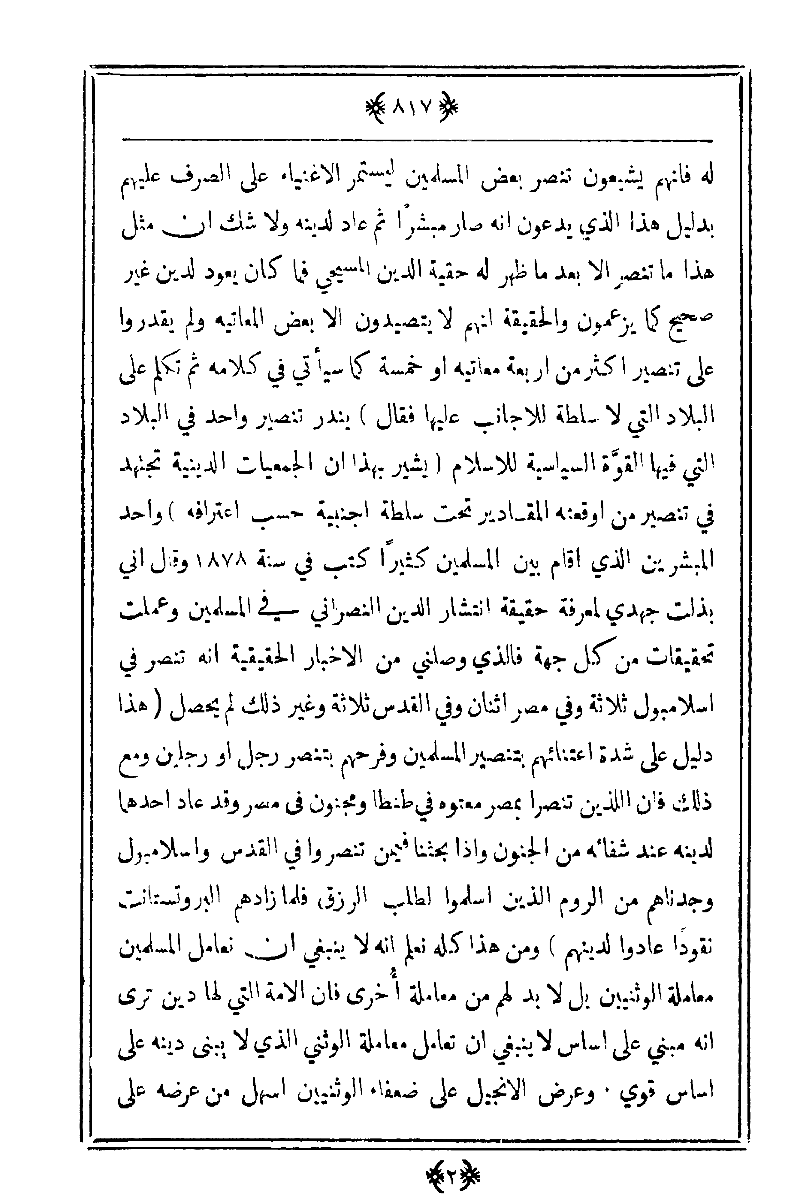 السياسية للإسلام (يشير بهذا أن الجمعيات الدينية تجتهد في تنصير من أوقعته المقادير تحت سلطة أجنبية حسب اعترافه) واحد المبشرين الذي أقام بين المسلمين كثيراً كتب في سنة 1878 وقال أني بذلت جهدي لمعرفة حقيقة انتشار الدين النصراني في المسلمين وعملت تحقيقات من كل جهة فالذي وصلني من الأخبار الحقيقة أنه تنصر في اسلامبول ثلاثة وفي مصر اثنان وفي القدس ثلاثة وغير ذلك لم يحصل (هذا دليل على شدة اعتنائهم بتنصير المسلمين وفرحهم بتنصر رجل أو رجلين ومع ذلك فإن اللذين تنصرا بمصر معتوه في طنطا ومجنون في مصر وقد عاد أحدهما لدينه عند شفائه من الجنون وإذا بحثنا فيمن تنصروا في القدس واسلامبول وجدناهم من الروم الذين أسلموا لطلب الرزق فلما زادهم البروتستانت نقوداً عادوا لدينهم) ومن هذا كله نعلم أنه لا ينبغي أن نعامل المسلمين معاملة الوثنيين بل لابد لهم من معاملة أخرى فإن الأمة التي لها دين ترى أنه مبني على أساس لا ينبغي أن تعامل معاملة الوثني الذي لا يبنى دينه على أساس قوي. وعرض الإنجيل على ضعفاء الوثنيين أسهل من عرضه على