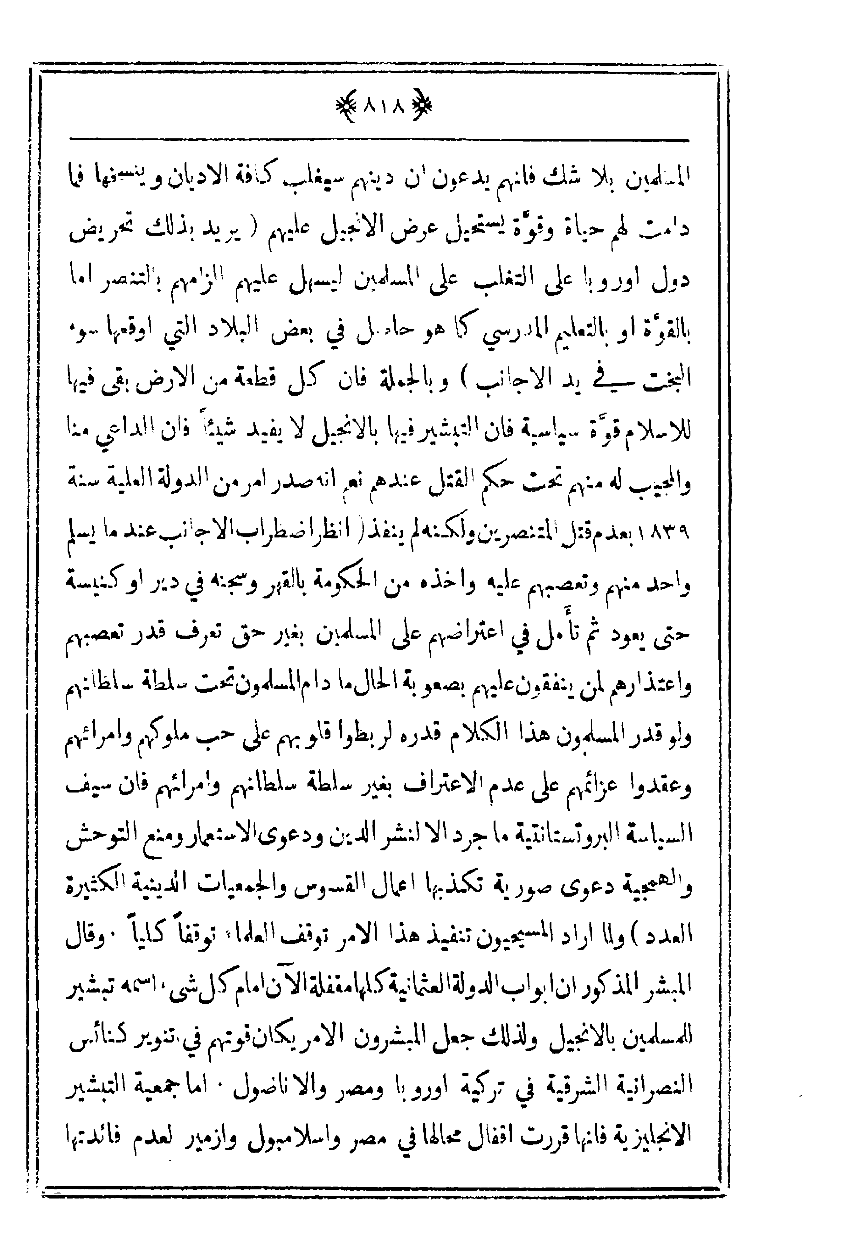المسلمين بلا شك فإنهم يدعون أن دينهم سيغلب كافة الأديان وينسخها فما دامت لهم حياة وقوّة يستحيل عرض الإنجيل عليهم (يريد بذلك تحريض دول أوروبا على التغلب على المسلمين ليسهل عليهم ألزامهم بالتنصر أما بالقوّة أو بالتعليم المدرسي كما هو حاصل في بعض البلاد التي أوقعها سوء البخت في يد الأجانب) وبالجملة فإن كل قطعة من الأرض بقي فيها للإسلام قوّة سياسية فإن التبشير فيها بالإنجيل لا يفيد شيئاً فإن الداعي منا والمجيب له منهم تحت حكم القتل عندهم نعم أنه صدر أمر من الدولة العلية سنة 1839 بعدم قتل المتنصرين ولكنه لم ينفذ (انظر اضطراب الأجانب عندما يسلم واحد منهم وتعصبهم عليه وأخذه من الحكومة بالقهر وسجنه في دير أو كنيسة حتى يعود ثم تأمل في اعتراضهم على المسلمين بغير حق تعرف قدر تعصبهم واعتذاراهم لمن ينفقون عليهم بصعوبة الحال ما دام المسلمون تحت سلطة سلطانهم ولو قدر المسلمون هذا الكلام قدره لربطوا قلوبهم على حب ملوكهم وأمرائهم وعقدوا عزائمهم على عدم الاعتراف بغير سلطة سلطانهم وأمرائهم فإن سيف السياسة البروتستانتية ما جرد إلا لنشر الدين ودعوى الاستعمار ومنع التوحش والهمجية دعوى صورية تكذبها أعمال القسوس والجمعيات الدينية الكثيرة العدد) ولما أراد المسيحيون تنفيذ
