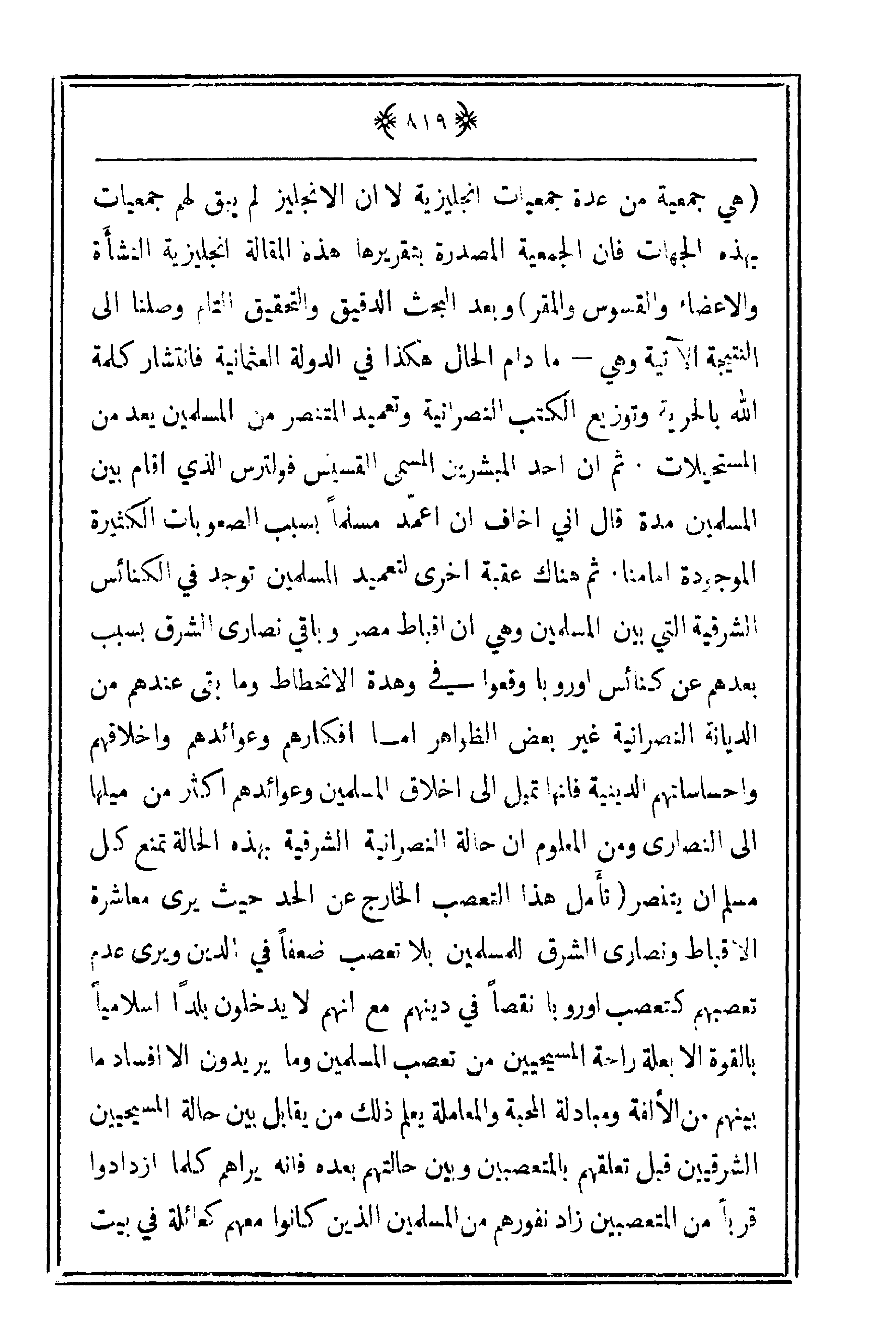 (هي جمعية من عدة جمعيات إنجليزية لا أن الإنجليز لم يبق لهم جمعيات بهذه الجهات فإن الجمعية المصدرة بتقريرها هذه المقالة إنجليزية النشأة والأعضاء والقسوس والمقر) وبعد البحث الدقيق والتحقيق التام وصلنا على النتيجة الآتية وهي - ما دام الحال هكذا في الدولة العثمانية فانتشار كلمة الله بالحرية وتوزيع الكتب النصرانية وتعميد المتنصر من المسلمين يعد من المستحيلات. ثم أن أحد المبشرين المسمى القسيس فولترس الذي أقام بين المسلمين مدة قال إني أخاف أن أعمّد مسلماً بسبب الصعوبات الكثيرة الموجودة أمامنا. ثم هناك عقبة أخرى لتعميد المسلمين توجد في الكنائس الشرقية التي بين المسلمين وهي أن أقباط مصر وباقي نصارى الشرق بسبب بعدهم عن كنائس أوروبا وقعوا في وهدة الانحطاط وما بقي عندهم من الديانة النصرانية غير بعض الظواهر أما أفكارهم وعوائدهم وأخلاقهم واحساساتهم الدينية فإنها تميل إلى أخلاق المسلمين وعوائدهم أكثر من ميلها إلى النصارى ومن المعلوم أن حالة النصرانية الشرقية بهذه الحالة تمنع كل مسلم أن يتنصر (تأمل هذا التعصب الخارج عن الحد حيث يرى معاشرة الأقباط ونصارى الشرق للمسلمين بلا تعصب ضعفاً في الدين ويرى عدم تعصبهم كتعصب أوروبا نقصاً في دينهم مع أنهم لا يدخلون بلداً إسلامياً بالقوة إلا بعلة راحة المسيحيين من تعصب المسلمين وما يريدون إلا إفساد ما بينهم من الألفة ومبادلة المحبة والمعاملة يعلم ذلك من يقابل بين حالة المسيحيين الشرقيين قبل تعلقهم بالمتعصبين وبين حالتهم بعده فإنه يراهم كلما ازدادوا قرباً من المتعصبين زاد نفورهم من المسلمين الذين كانوا معهم كعائلة في بيت