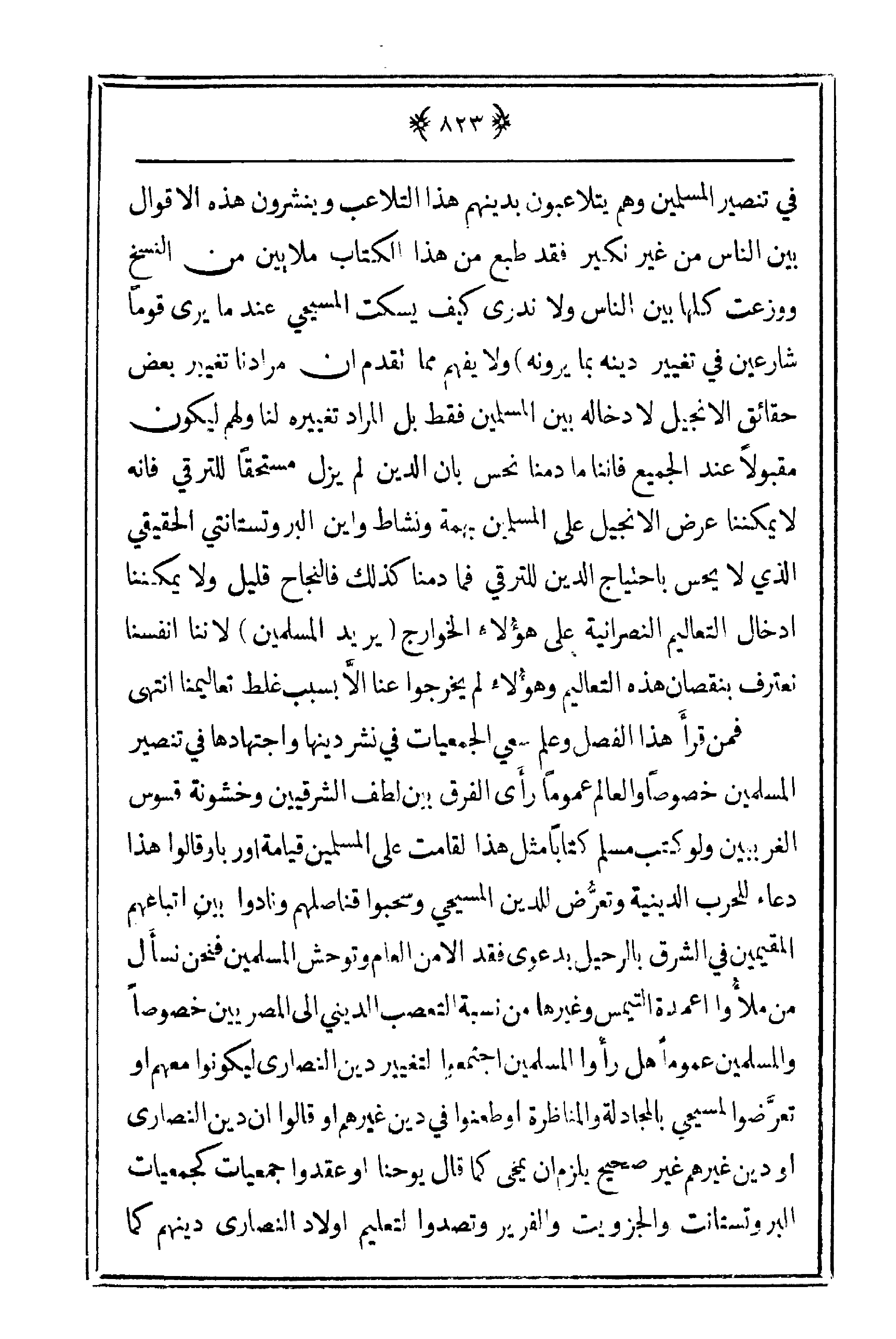 فمن قرأ هذا الفصل وعلم سعي الجمعيات في نشر دينها واجتهادها في تنصير المسلمين خصوصاً والعالم عموماً رأى الفرق بين لطف الشرقيين وخشونة قسوس الغربيين ولو كتب مسلم كتاباً مثل هذا لقامت على المسلمين قيامة أوروبا وقالوا هذا دعاء للحرب الدينية وتعرُّض للدين المسيحي وسحبوا قناصلهم ونادوا بين إتباعهم المقيمين في الشرق بالرحيل بدعوى فقد الأمن العام وتوحش المسلمين فنحن نسأل من ملأوا أعمدة التيمس وغيرها من نسبة التعصب الديني إلى المصريين خصوصاً والمسلمين عموماً هل رأوا المسلمين اجتمعوا لتغيير دين النصارى ليكونوا معهم أو تعرَّضوا لمسيحي بالمجادلة والمناظرة أو طعنوا في دين غيرهم أو قالوا أن دين النصارى أو دين غيرهم غير صحيح يلزم أن يمحى كما قال يوحنا أو عقدوا جمعيات كجمعيات البروتستانت والجزويت والفرير وتصدوا لتعليم أولاد النصارى دينهم كما
