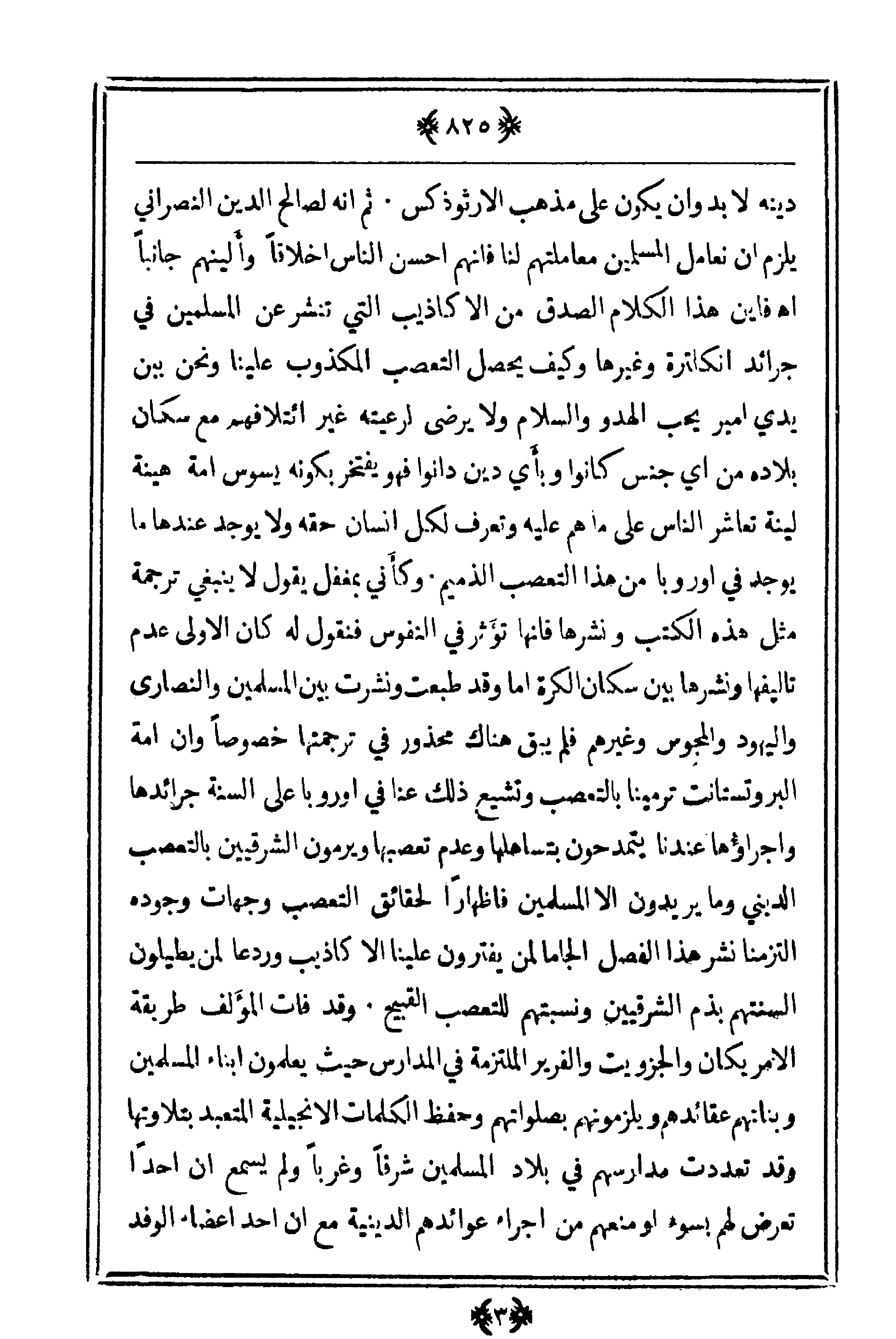 دينه لابد وأن يكون على مذهب الأرثوذكس. ثم أنه لصالح الدين النصراني يلزم أن نأمل المسلمين معاملتهم لنا فإنهم أحسن الناس أخلاقاً وألينهم جانباً فأين هذا الكلام الصدق من الأكاذيب التي تنشر عن المسلمين في جرائد انكلترة وغيرها وكيف يحصل التعصب المكذوب علينا ونحن بين يدي أمير يحب الهدوء والسلام ولا يرضى لرعيته غير ائتلافهم مع سكان بلاده من أي جنس كانوا وبأي دين دانوا فهو يفتخر بكونه يسوس أمة هينة لينة تعاشر الناس على ما هم عليه وتعرف لكل إنسان حقه ولا يوجد عندها ما يوجد في أوروبا من هذا التعصب الذميم. وكأني بمغفل يقول لا ينبغي ترجمة مثل هذه الكتب ونشرها فإنها تؤثر في النفوس فنقول له كان الأولى عدم تأليفها ونشرها بين سكان الكرة أما وقد طبعت ونشرت بين المسلمين والنصارى واليهود والمجوس وغيرهم فلم يبق هناك محذور في ترجمتها خصوصاً وإن أمة البروتستانت ترمينا بالتعصب وتشيع ذلك عنا في أوروبا على ألسنة جرائدها وأجراؤها عندنا يتمدحون بتساهلها وعدم تعصبها ويرمون الشرقيين بالتعصب الدينين وما يريدون إلا المسلمين فإظهاراً لحقائق التعصب وجهات وجود التزمنا نشر هذا الفصل إلجاماً لمن يفترون علينا الأكاذيب وردعاً لمن يطيلون ألسنتهم بذم الشرقيين ونسبتهم للتعصب القبيح. وقد فات المؤلف طريقة الأمريكان والجزويت والفرير الملتزمة في المدارس حيث يعلمون أبناء المسلمين وبناتهم عقائدهم ويلزمونهم بصلواتهم وحفظ الكلمات الإنجيلية المتعبد بتلاوتها وقد تعددت مدارسهم في بلاد المسلمين شرقاً وغرباً ولم يسمع أن أحداً تعرض لهم بسوء أو منعهم من إجراء عوائدهم الدينية مع أن أحد أعضاء الوفد