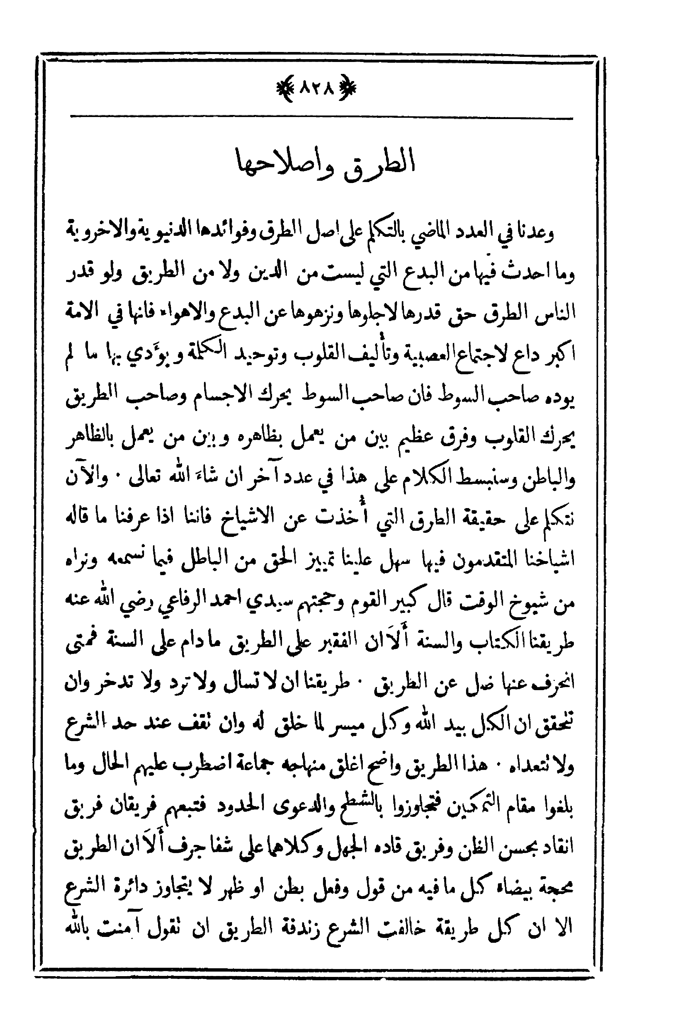 وعدنا في العدد الماضي بالتكلم على أصل الطرق وفوائدها الدنيوية والأخروية وما أحدث فيها من البدع التي ليست من الدين ولا من الطريق ولو قدر الناس الطرق حق قدرها لأجلوها ونزهوها عن البدع والأهواء فإنها في الأمة أكبر داع لاجتماع العصبية وتأليف القلوب وتوحيد الكلمة ويؤدي بها ما لم يؤده صاحب السوط فإن صاحب السوط يحرك الأجسام وصاحب الطريق يحرك القلوب وفرق عظيم بين من يعمل بظاهره وبين من يعمل بالظاهر والباطن وسنبسط الكلام على هذا في عدد آخر إن شاء الله تعالى. والآن نتكلم على حقيقة الطرق التي أُخذت عن الأشياخ فإننا إذا عرفنا ما قاله أشياخنا المتقدمون فيها سهل علينا تمييز الحق من الباطل فيما نسمعه ونراه من شيوخ الوقت قال كبير القوم وحجتهم سيدي أحمد الرفاعي رضي الله عنه طريقنا الكتاب والسنة ألا أن الفقير على الطريق ما دام على السنة فمتى انحرف عنها ضل عن الطريق. طريقنا أن لا تسأل ولا ترد ولا تدخر وإن تتحقق أن الكل بيد الله وكل ميسير لما خلق له وأن تقف عند حد الشرع ولا تتعداه. هذا الطريق واضح أغلق منهاجه جماعة اضطرب عليهم الحال وما بلغوا مقام التمكين فتجاوزوا بالشطح والدعوى الحدود فتبعهم فريقان فريق انقاد بحسن الظن وفريق قاده الجهل وكلاهما على شفا جرف ألا أن الطريق محجة بيضاء كل ما فيه من قول وفعل بطن أو ظهر لا يتجاوز دائرة الشرع إلا أن كل طريقة خالفت الشرع زندقة الطريق أن تقول آمنت بالله