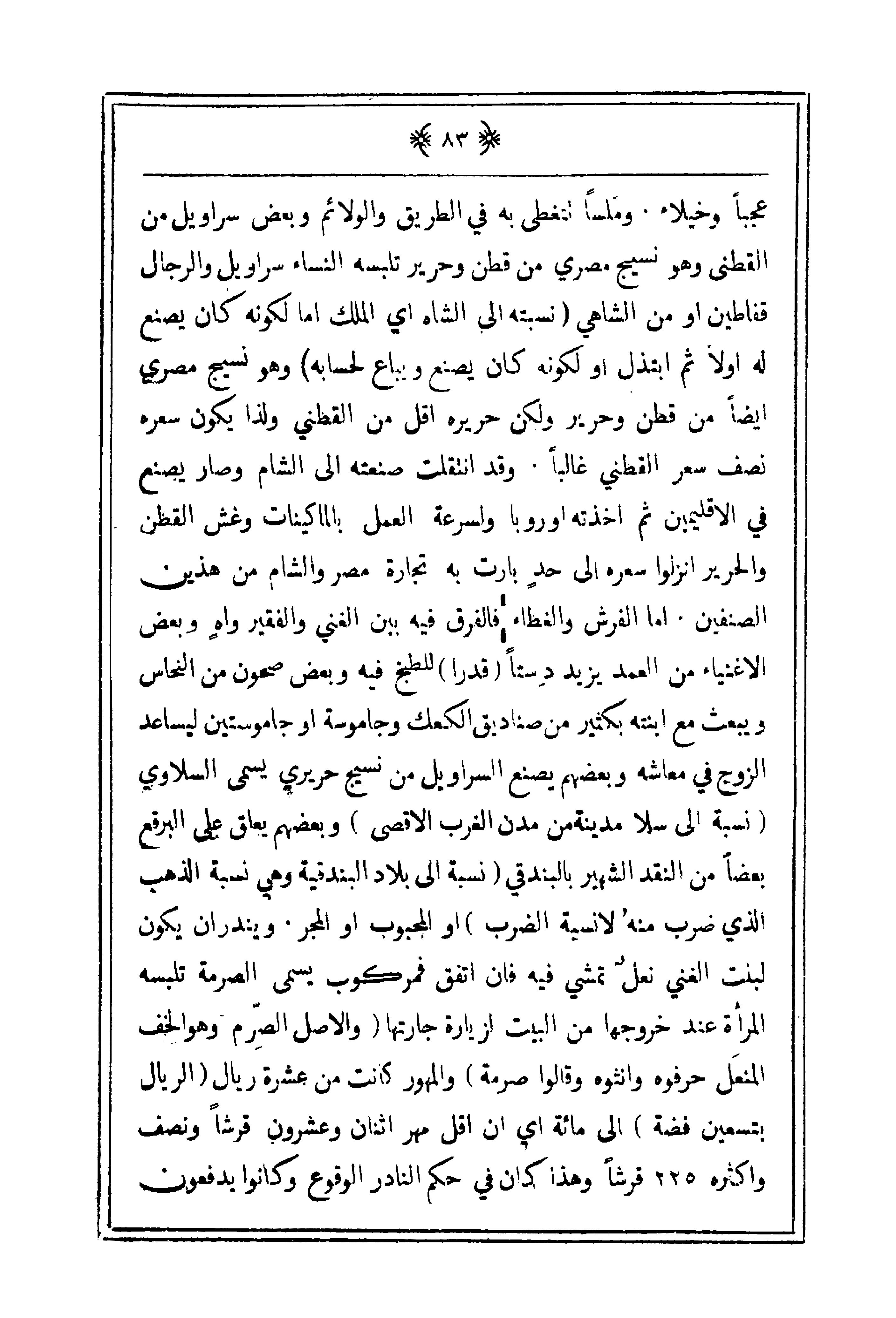 عجباً وخيلاء. ومَلساً تتغطى به في الطريق والولائم وبعض سراويل من القطني وهو نسيج مصري من قطن وحرير تلبسه النساء سراويل والرجال قفاطين أو من الشاهي (نسبته إلى الشاه أي الملك إما لكونه كان يصنع له أولاً ثم ابتذل أو لكونه كان يصنع ويباع لحسابه) وهو نسيج مصري أيضاً من قطن وحرير ولكن حريره أقل من القطني ولذا يكون سعره نصف سعر القطني غالباً. وقد انتقلت صنعته إلى الشام وصار يصنع في الإقليمين ثم أخذته أوروبا ولسرعة العلم بالماكينات وغش القطن والحرير أنزلوا سعره إلى حدٍّ بارت به تجارة مصر والشام من هذين الصنفين. أما الفرش والغطاء فالفرق فيه بين الغني والفقير واهٍ وبعض الأغنياء من العمد يزيد دِستاً (قدراً) للطبخ فيه وبعض صحون من النحاس ويبعث مع ابنته بكثير من صناديق الكعك وجاموسة أو جاموستين ليساعد الزوج في معاشه وبعضهم يصنع السراويل من نسيج حريري يسمى السلاوي (نسبة إلى سلا مدينة من مدن الغرب الأقصى) وبعضهم يعلق على البقع بعضاً من النقد الشهير بالبندقي (نسبة إلى بلاد البندقية وهي نسبة الذهب الذي ضرب منه لا نسبة الضرب) أو المحبوب أو المجر. ويندر أن يكون لبنت الغني نعلٌ تمشي فيه فإن اتفق فمركوب يسمى الصرمة تلبسه المرأة عند خروجها من البيت لزيارة جارتها (والأصل الصِّرم وهو الخف المنعَل حرفوه وأنثوه وقالوا صرمة) والمهور كانت من عشرة ريال (الريال بتسعين فضة) إلى مائة أي إن قل مهر اثنان وعشرون قرشاً ونصف وأكثره 225 قرشاً وهذا كان في حكم النادر الوقوع وكانوا يدفعون