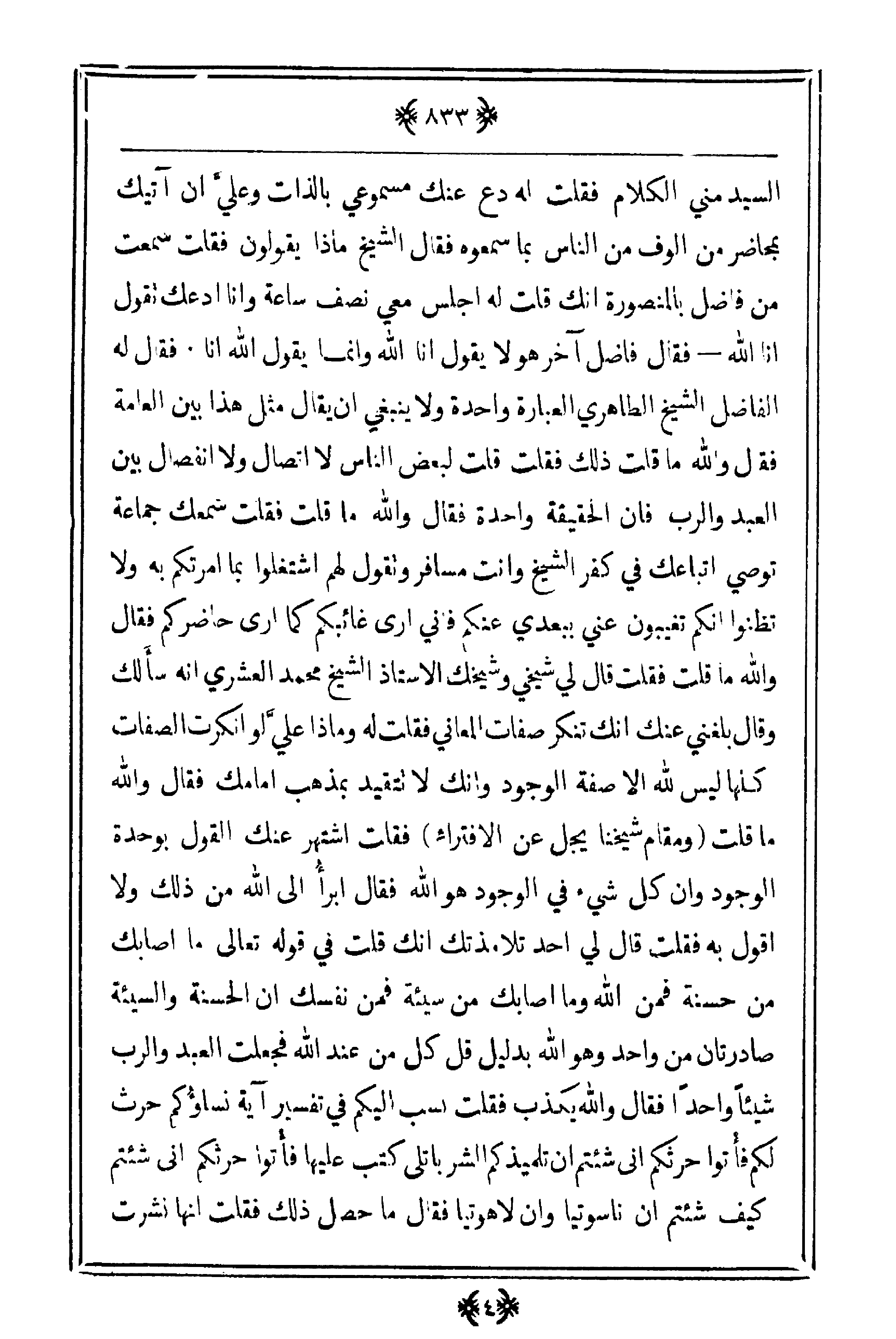 السيد مني الكلام فقلت له دع عنك مسموعي بالذات وعلي أن آتيك بمحاضر من ألوف من الناس بما سمعوه فقال الشيخ ماذا يقولون فقلت سمعت من فاض بالمنصورة إنك قلت له اجلس معي نصف ساعة وأنا أدعك تقول أنا الله - فقال فاضل آخر هو لا يقول أن الله وإنما يقول الله أنا. فقال له الفاضل الشيخ الطاهري العبارة واحدة ولا ينبغي أن يقال مثل هذا بين العامة فقال والله ما قلت ذلك فقلت قلت لبعض الناس لا اتصال ولا انفصال بين العبد والرب فإن الحقيقة واحدة فقال والله ما قلت فقلت سمعك جماعة توصي إتباعك في كفر الشيخ وأنت مسافر وتقول لهم اشتغلوا بما أمرتكم به ولا تظنوا أنكم تغيبون عني ببعدي عنكم فإني أرى غائبكم كما أرى حاضركم فقال والله ما قلت فقلت قال لي شيخي وشيخك الأستاذ الشيخ محمد العشري أنه سألك وقال بلغني عنك أنك تنكر صفات المعاني فقلت له وماذا علي لو أنكرت الصفات كلها ليس الله إلا صفة الوجود وأنك لا تتقيد بمذهب إمامك فقال والله ما قلت (ومقام شيخنا يجل عن الافتراء) فقلت اشتهر عنك القول بوحدة الوجود وأن كل شيء في الوجود هو الله فقال ابرأ إلى الله من ذلك ولا أقول به فقلت قال لي أحد تلامذتك أنك قلت في قوله تعالى ما أصابك من حسنة فمن الله وما أصابك من سيئة فيمن نفسك إن الحسنة والسيئة صادرتان من واحد وهو الله بدليل قل كل من عند الله فجعلت العبد والرب شيئاً واحداً فقال والله يكذب فقلت نسب إليكم في تفسير آية {نساؤكم حرث لكم فأتوا حرثكم إني شئتم} أن تلميذكم الشرباتلى كتب عليها فأتوا حرثكم أنى شئتم كيف شئتم أن ناسوتيا وأن لا هوتيا فقال ما