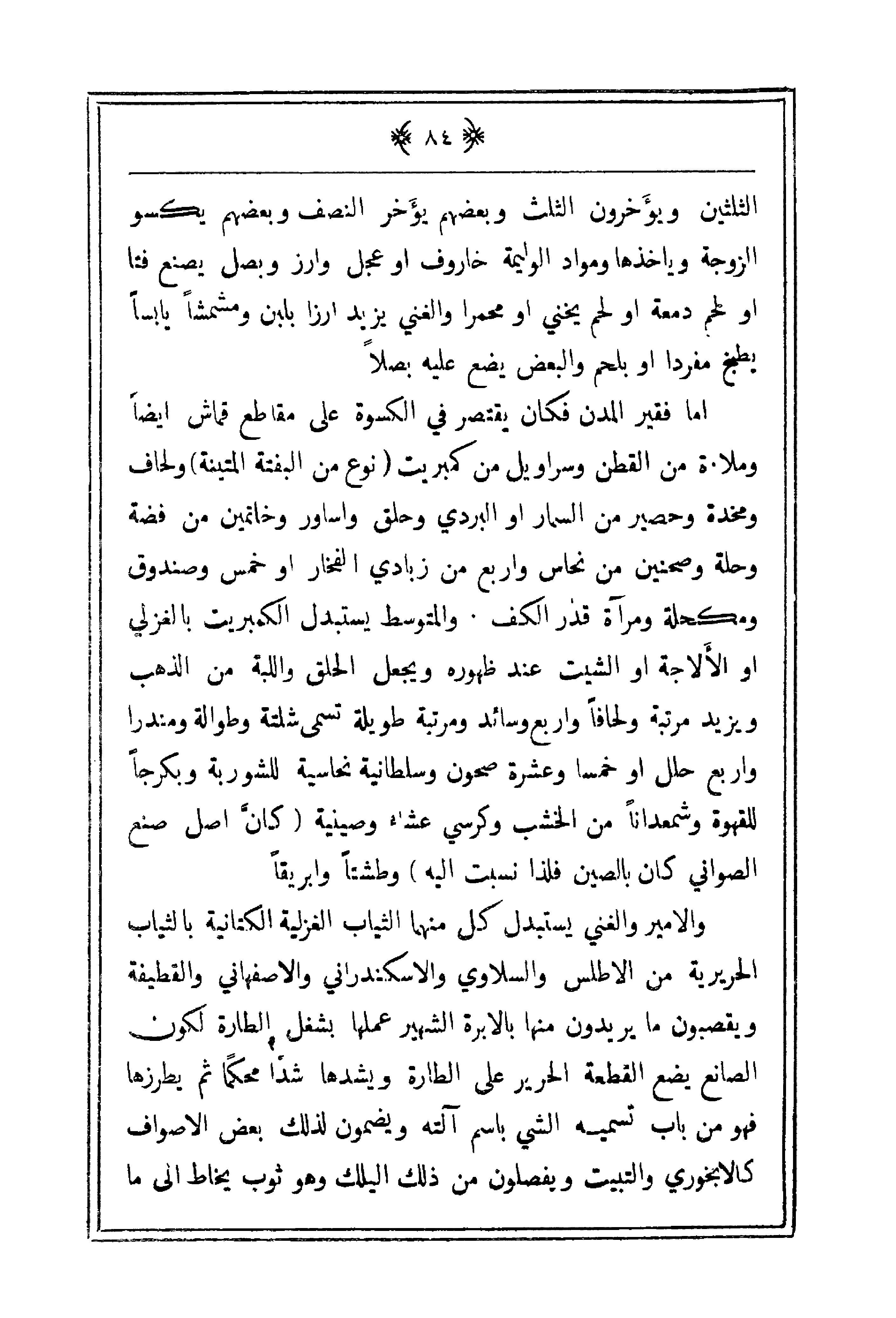 أما فقير المدن فكان يقتصر في الكسوة على مقاطع قماش أيضاً وملاءة من القطن وسراويل من كمبريت (نوع من البفتة المتينة) ولحاف ومخدة وحصير من السمار أو البردي وحلق وأساور وخاتمين من فضة وحلة وصحنين من نحاس وأربع من زبادي الفخاري أو خمس وصندوق ومكحلة ومرآة قدر الكف. والمتوسط يستبدل الكمبريت بالغزلي أو الألاجة أو الشيت عند ظهوره ويجعل الحلق واللبة من الذهب ويزيد مرتبة ولحافاً وأربع وسائد ومرتبة طويلة تسمى شلتة وطوالة ومندراً وأربع حلل أو خمساً وعشرة صحون وسلطانية نحاسية للشوربة وبكرجاً للقهوة وشمعداناً من الخشب وكرسي عشاء وصينية (كأن أصل صنع الصواني كان بالصين فلذا نسبت إليه) وطشتاً وإبريقاً.