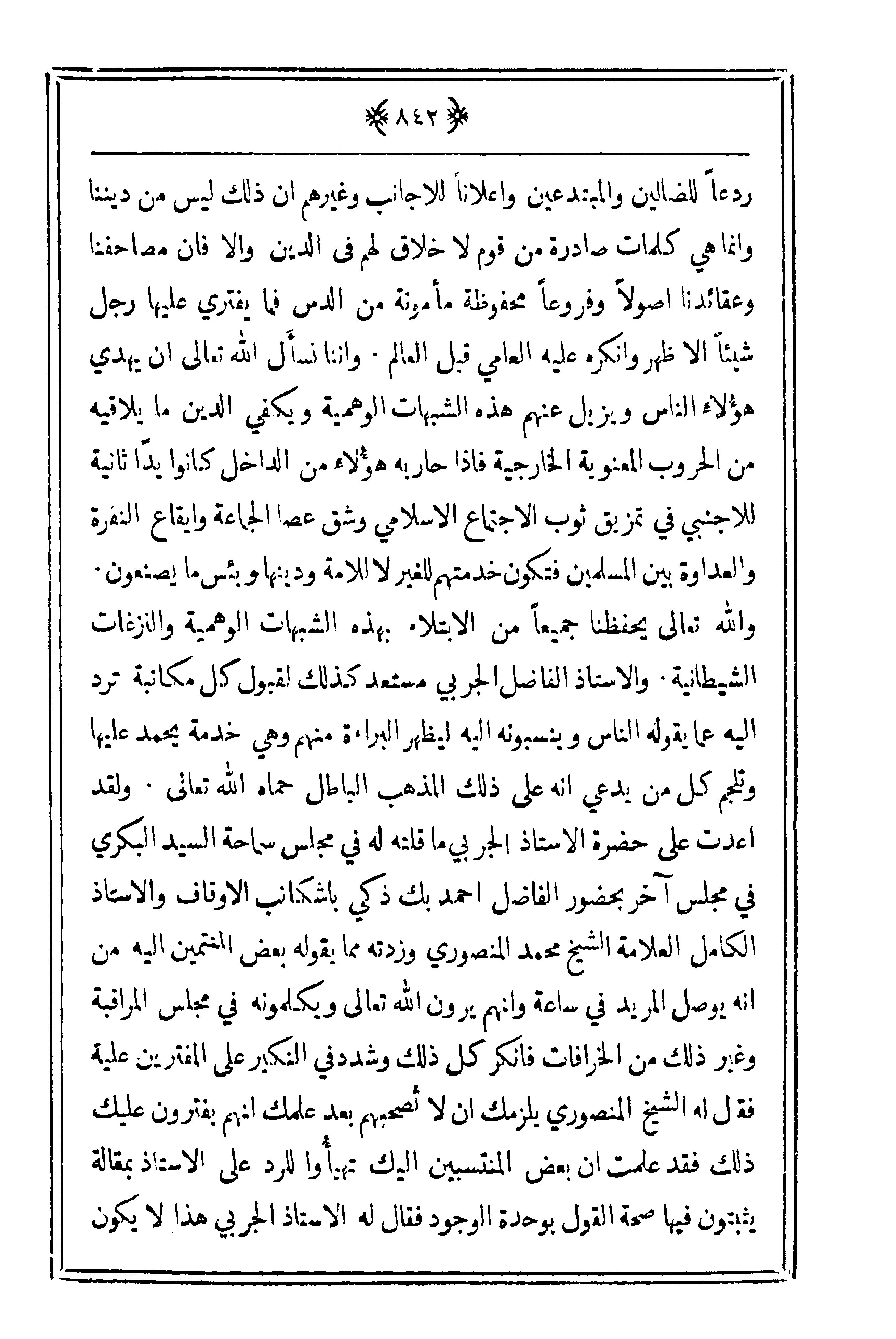 ردعاً للضالين والمبتدعين وإعلاناً للأجانب وغيرهم أن ذلك ليس من ديننا وإنما هي كلمات صادرة من قوم لا خلاق لهم في الدين وإلا فإن مصاحفنا وعقائدنا أصولاً وفروعاً محفوظة مأمونة من الدس فما يفتري عليها رجل شيئاً إلا ظهر وأنكره عليه العامي قبل العالم. وإننا نسأل الله تعالى أن يهدي هؤلاء الناس ويزيل عنهم هذه الشبهات الوهمية ويكفي الدين ما يلاقيه من الحروب المعنوية الخارجية فإذا حاربه هؤلاء من الداخل كانوا يداً ثانية للأجنبي في تمزيق ثوب الاجتماع الإسلامي وشق عصا الجماعة وإيقاع النفرة والعداوة بين المسلمين فتكون خدمتهم للغير لا للأمة ودينها وبئس ما يصنعون. والله تعالى يحفظنا جميعاً من الابتلاء بهذه الشبهات الوهمية والنزغات الشيطانية. والأستاذ الفاضل الجربي مستعد كذلك لقبول كل مكاتبة ترد إليه عما يقوله الناس وينسبونه إليه ليظهر البراءة منهم وهي خدمة يحمد عليها وتلجم كل من يدعي أنه على ذلك المذهب الباطل حماه الله تعالى. ولقد أعدت على حضرة الأستاذ الجربي ما قلته له في مجلس سماحة السيد البكري في مجلس آخر بحضور الفاضل أحمد بك ذكي باشكاتب الأوقاف والأستاذ الكامل العلامة الشيخ محمد المنصوري وزدته مما يقوله بعض المنتمين إيه من أنه يوصل المريد في ساعة وأنهم يرون الله تعالى ويكلمونه