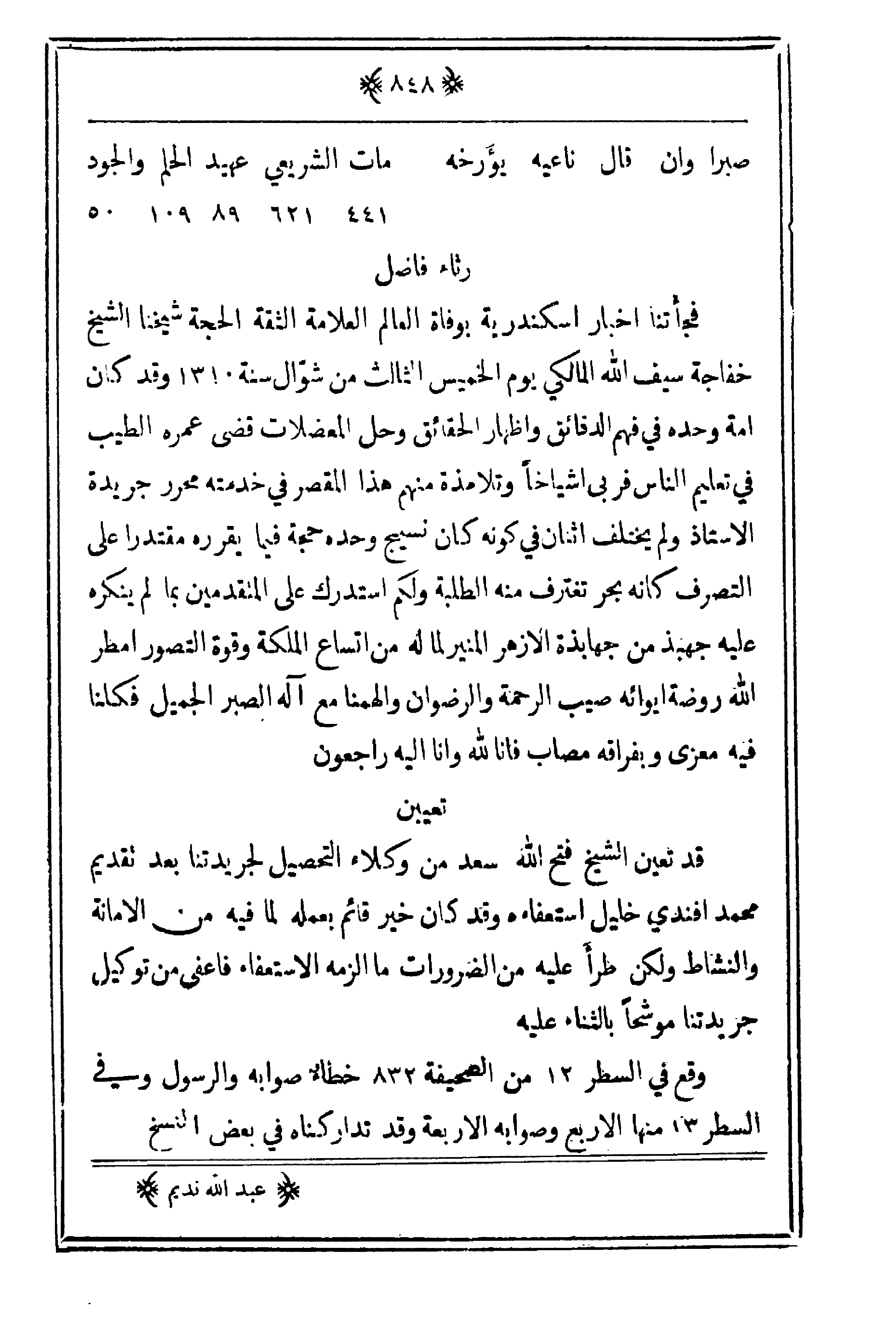 فجأتنا أخبار إسكندرية بوفاة العالم العلامة الثقة الحجة شيخنا الشيخ خفاجة سيف الله المالكي يوم الخميس الثالث من شوّال سنة 1310 وقد كان أمة وحده في فهم الدقائق وإظهار الحقائق وحل المعضلات قضى عمره الطيب في تعليم الناس فربى أشياخاً وتلامذة منهم هذا المقصر في خدمته محرر جريدة الأستاذ ولم يختلف اثنان في كونه كان نسيج وحده حجة فيما يقرره مقتدرا على التصرف كأنه بحر تغترف منه الطلبة ولكم استدرك على المتقدمين بما لم ينكره عليه جهبذ من جهابذة الأزهر المنير لما له من اتساع الملكة وقوة التصور أمطر الله روضة إيوائه صيب الرحمة والرضوان وألهمنا مع آله الصبر الجميل فكلنا فيه معزى وبفراقه مصاب فأنا الله وأنا إليه راجعون.