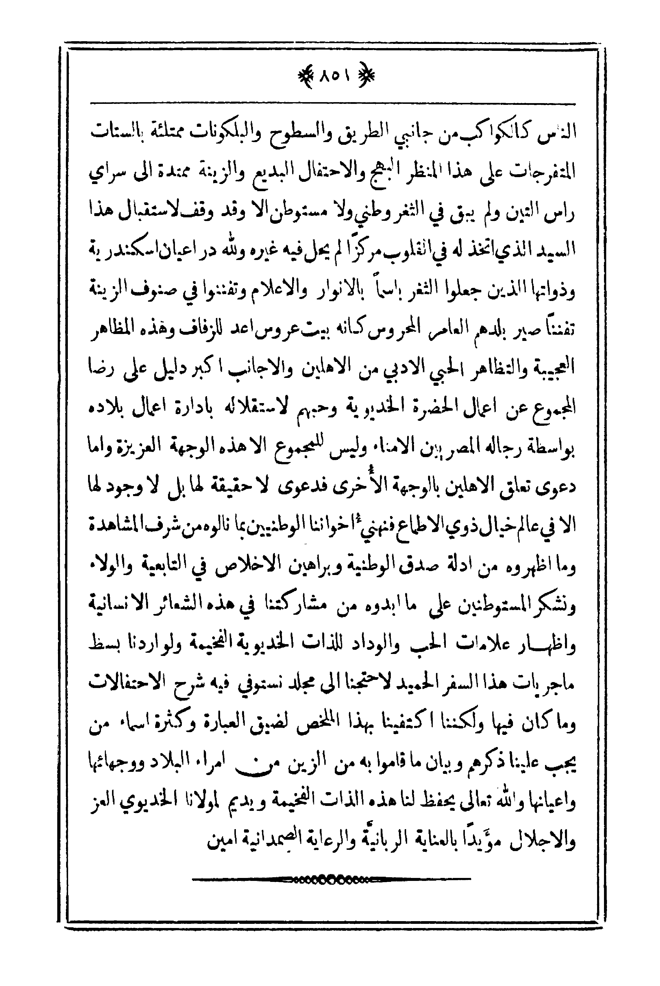 الناس كالكواكب من جانبي الطريق والسطوح والبلكونات ممتلئة بالستات المتفرجات على هذا المنظر البهج والاحتفال البديع والزينة ممتدة إلى سراي رأس التين ولم يبق في الثغر وطني ولا مستوطن إلا وقد وقف لاستقبال هذا السيد الذي اتخذ له في القلوب مركزاً لم يحل فيه غيره ولله در أعيان إسكندرية وذواتها الذين جعلوا الثغر باسماً بالأنوار والأعلام وتفننوا في صنوف الزينة تفنناً صير بلدهم العامر المحروس كأنه بيت عروس أعد للزفاف وهذه المظاهر العجيبة والتظاهر الحبي الأدبي من الأهلين والأجانب أكبر دليل على رضا المجموع عن أعمال الحضرة الخديوية وحبهم لاستقلاله بإدارة أعمال بلاده بواسطة رجاله المصريين الأمناء وليس للمجموع إلا هذه الوجهة العزيزة وأما دعوى تعلق الأهلين بالوجهة الأُخرى فدعوى لا حقيقة لها بل لا وجود لها إلا في عالم خيال ذوي الأطماع فنهنيءُ إخواننا الوطنيين بما نالوه من شرف المشاهدة وما أظهروا من أدلة صدق الوطنية وبراهين الإخلاص في التابعية والولاء ونشكر المستوطنين على ما أبدوه من مشاركتنا في هذه الشعائر الإنسانية وإظهار علامات الحب والوداد للذات الخديوية الفخيمة ولو أردنا بسط مجريات هذا السفر الحميد لاحتجنا على مجلد نستوفي فيه شرح الاحتفالات وما كان فيها ولكننا اكتفينا بهذا الملخص لضيق العبارة وكثرة أسماء من يجب علينا ذكرهم وبيان ما قاموا به من الزين من أمراء البلاد ووجهائها وأعيانها والله تعالى يحفظ لنا هذه الذات الفخيمة ويديم لمولانا الخديوي العز والإجلال مؤيداً بالعناية الربانيّة والرعاية الصمدانية أمين.