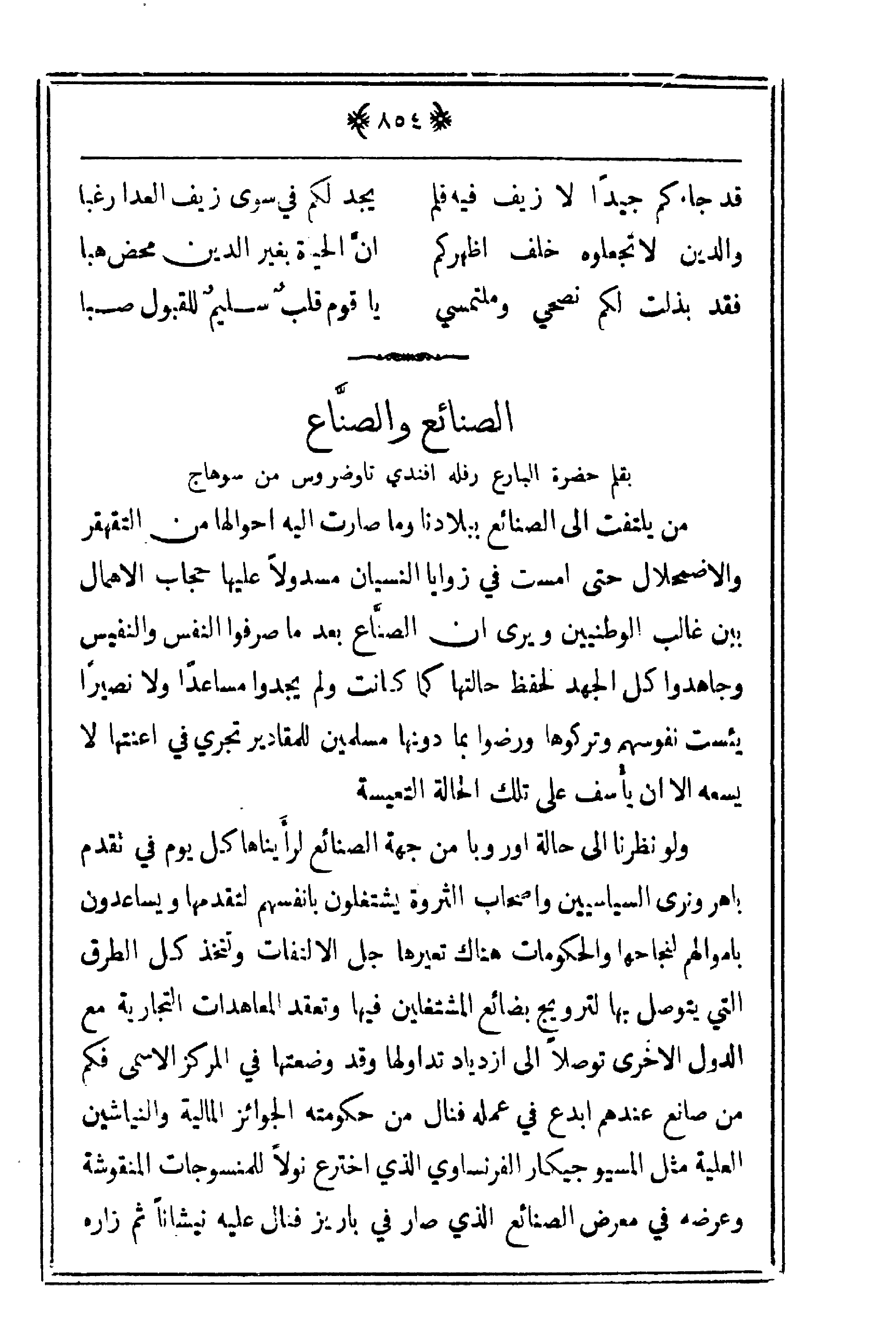 من يلتفت إلى الصنائع ببلادنا وما صارت إليه أحوالها من التقهقر والاضمحلال حتى أمست في زوايا النسيان مسدولاً عليها حجاب الإهمال بين غالب الوطنيين ويرى أن الصنّاع بعد ما صرفوا النفس والنفيس وجاهدوا كل الجهد لحفظ حالتها كما كانت ولم يجدوا مساعداً ولا نصيراً يئست نفوسهم وتركوها ورضوا بما دونها مسلمين للمقادير تجري في أعنتها لا يسعه إلا أن يأسف عل تلك الحالة التعيسة.