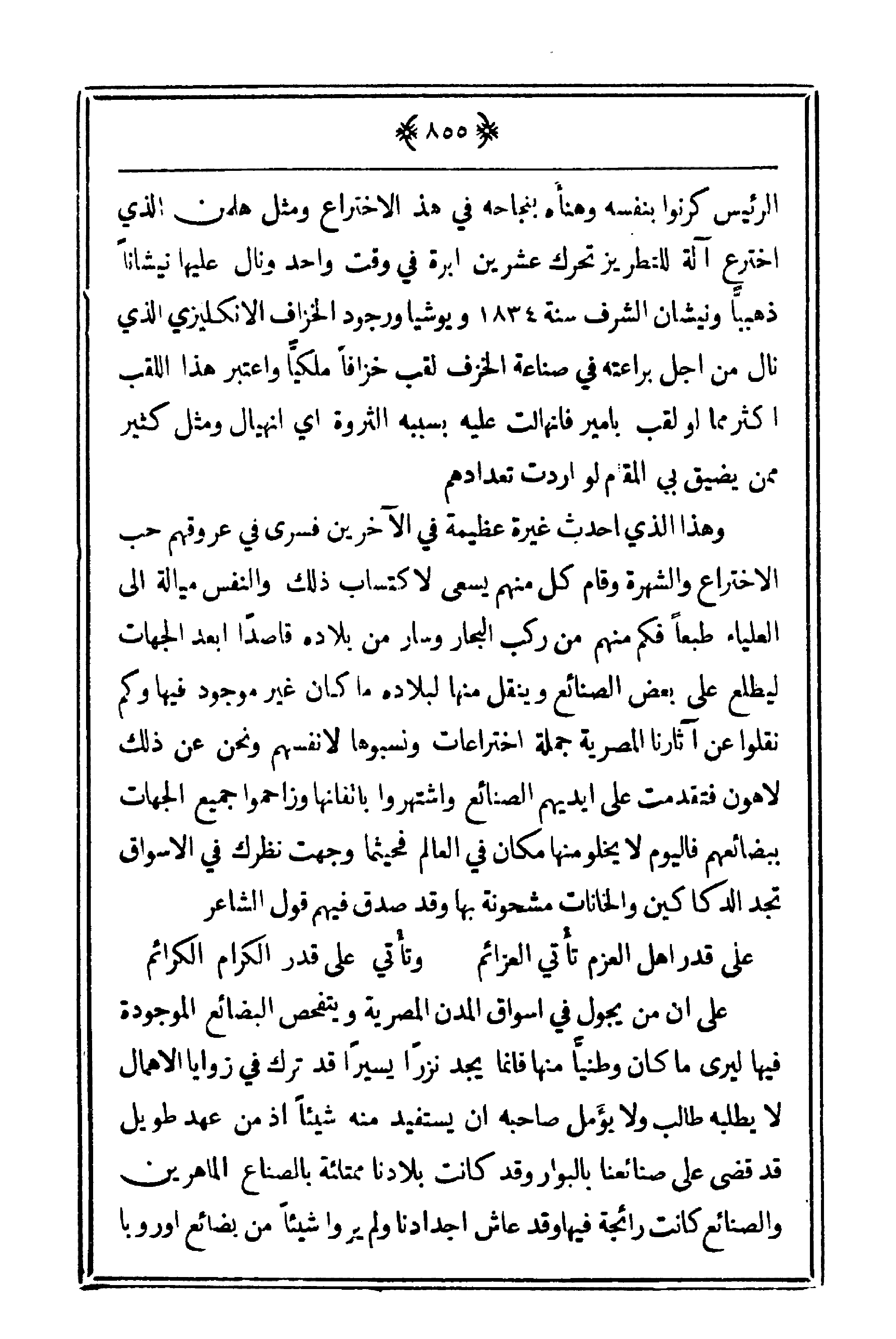 الرئيس كرنوا بنفسه وهنأه بنجاحه في هذا الاختراع ومثل هلمن الذي اخترع آلة للتطريز تحرك عشرين إبرة في وقت واحد ونال عليها نيشاناً ذهبياً ونيشان الشرف سنة 1834 ويوشيا ووجود الخزاف الإنكليزي الذي نال من أجل براعته في صناعة الخزف لقب خزافاً ملكيّاً واعتبر هذا اللقب أكثر مما لو لقب بأمير فانهالت عليه بسببه الثروة أي انهيال ومثل كثير ممن يضيق بي المقام لو أردت تعدادهم.