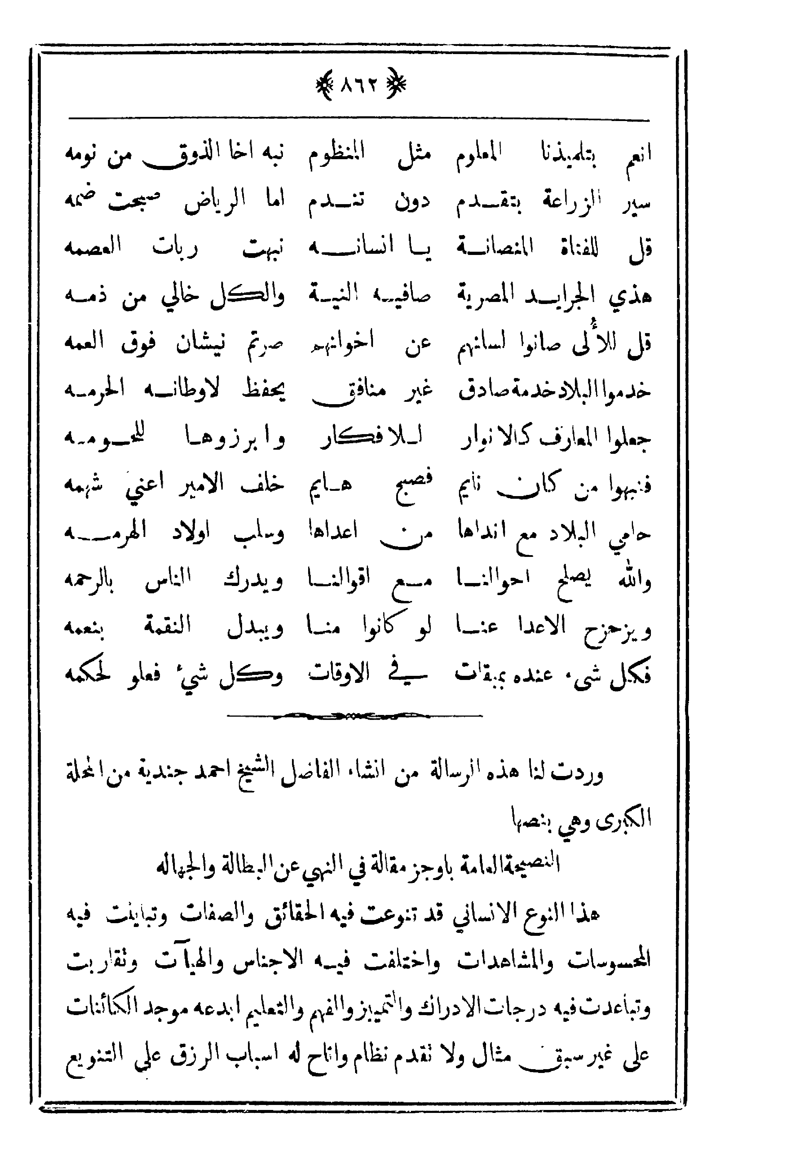 وردت لنا هذه الرسالة من إنشاء الفاضل الشيخ أحمد جندية من المحلة الكبرى وهي بنصها: