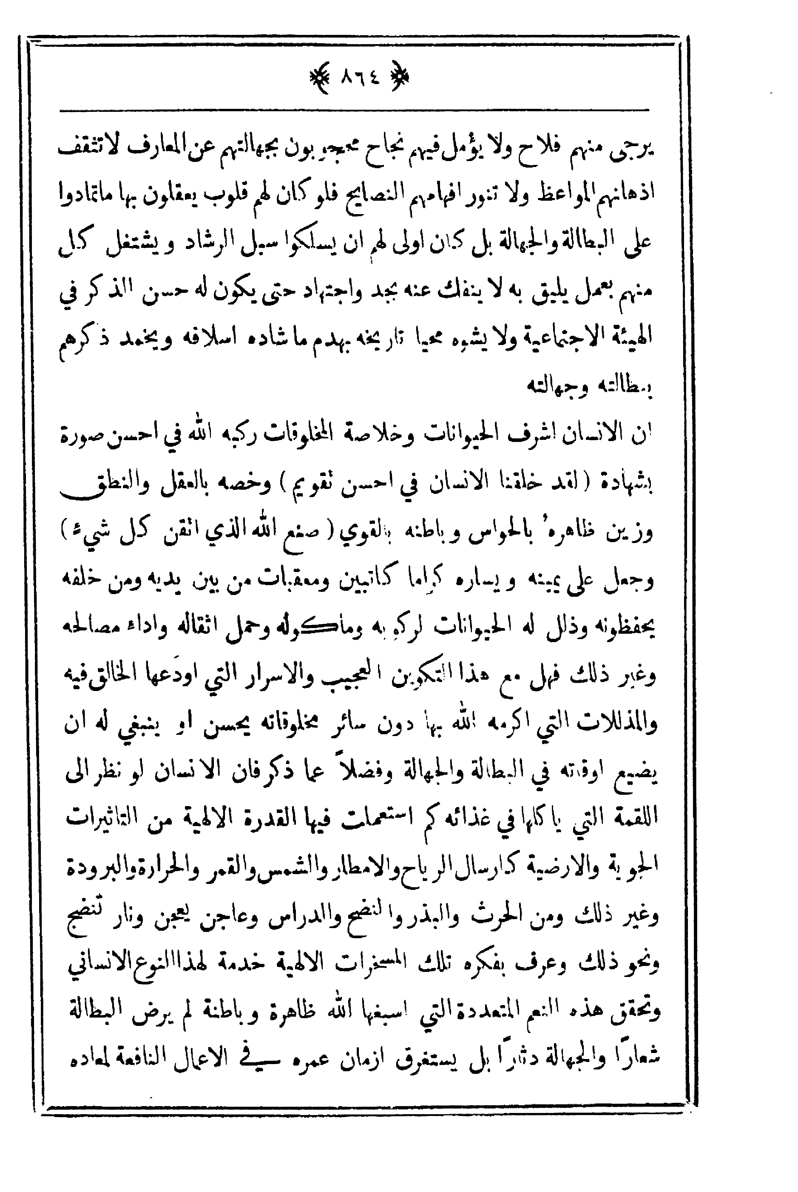 إن الإنسان أشرف الحيوانات وخلاصة المخلوقات ركبه الله في أحسن صورة بشهادة (لقد خلقنا الإنسان في أحسن تقويم) وخصه بالعقل والنطق وزين ظاهرهُ بالحواس وباطنه بالقوي (صنع الله الذي أتقن كل شيءٍٍ) وجعل على يمينه ويساره كراما كاتبين ومعقبات من بين يديه ومن خلفه يحفظونه وذلل له الحيوانات لركوبه ومأكوله وحمل أثقاله وأداء مصالح وغير ذلك فهل مع هذا التكوين العجيب والأسرار التي أودعها الخالق فيه والمذللات التي أكرمه الله بها دون سائر مخلوقاته يحسن أو ينبغي له أن يضيع أوقاته في البطالة والجهالة وفضلاً عما ذكر فإن الإنسان لو نظر إلى اللقمة التي يأكلها في غذائه كم استعملت فيها القدرة الإلهية من التأثيرات الجوية والأرضية كإرسال الرياح والأمطار والشمس والقمر والحرارة والبرودة وغير ذلك ومن الحرث والبذر والنضج والدراس وعاجن يعجن ونار تنضج ونحو ذلك وعرف بفكره تلك المسخرات الإلهية خدمة لهذا النوع الإنساني وتحقق هذه النعم المتعددة التي أسبغها الله ظاهرة وباطنة لم يرض البطالة شعاراً والجهالة دثاراً بل يستغرق أزمان عمره في الأعمال النافعة لمعاده