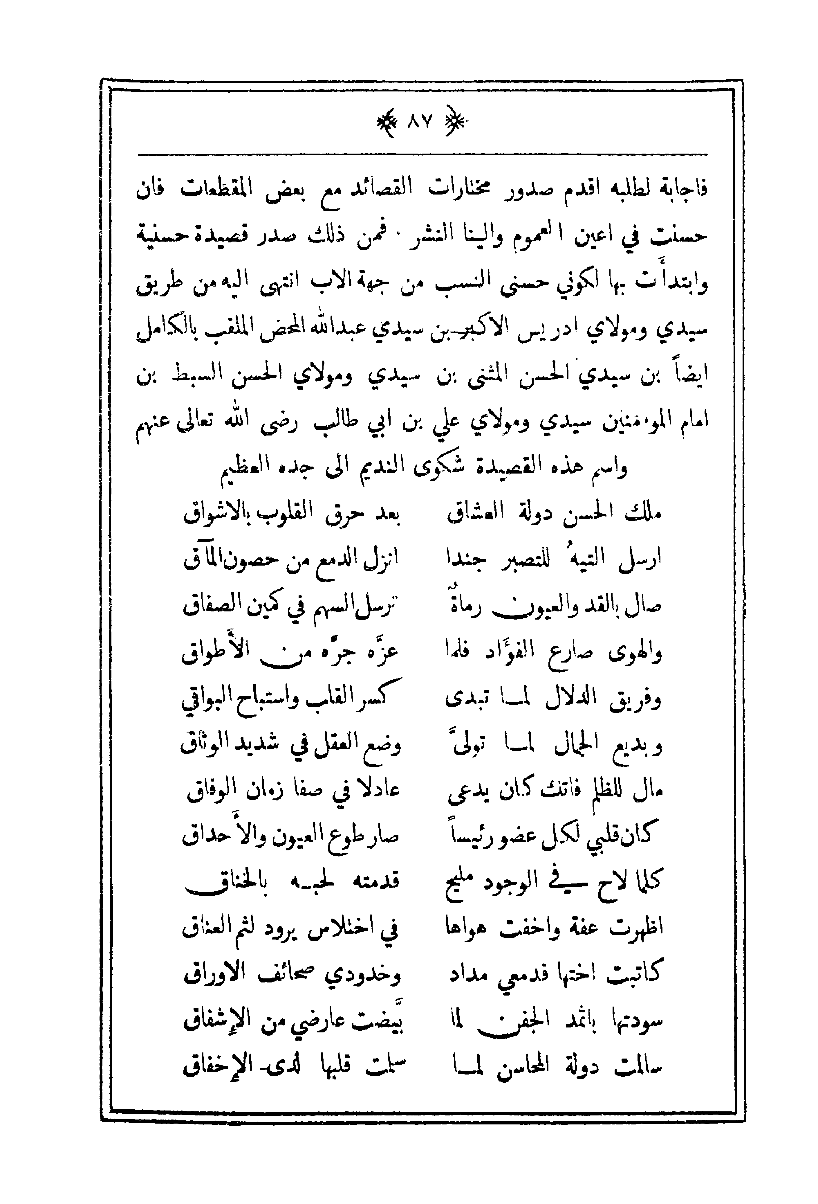 فإجابة لطلبه أقدم صدور مختارات القصائد مع بعض المقطعات فإن حسنت في أعين العموم والينا النشر. فمن ذلك صدر قصيدة حسنية وابتدأت بها لكوني حسني النسب من جهة الأب انتهي إليه من طريق سيدي ومولاي إدريس الأكبر بن سيدي عبد الله المحض الملقب بالكامل أيضاً ابن سيدي الحسن المثنى بن سيدي ومولاي الحسن البسط بن إمام المؤمنين سيدي ومولاي علي بن أبي طالب رضي الله تعالى عنهم.