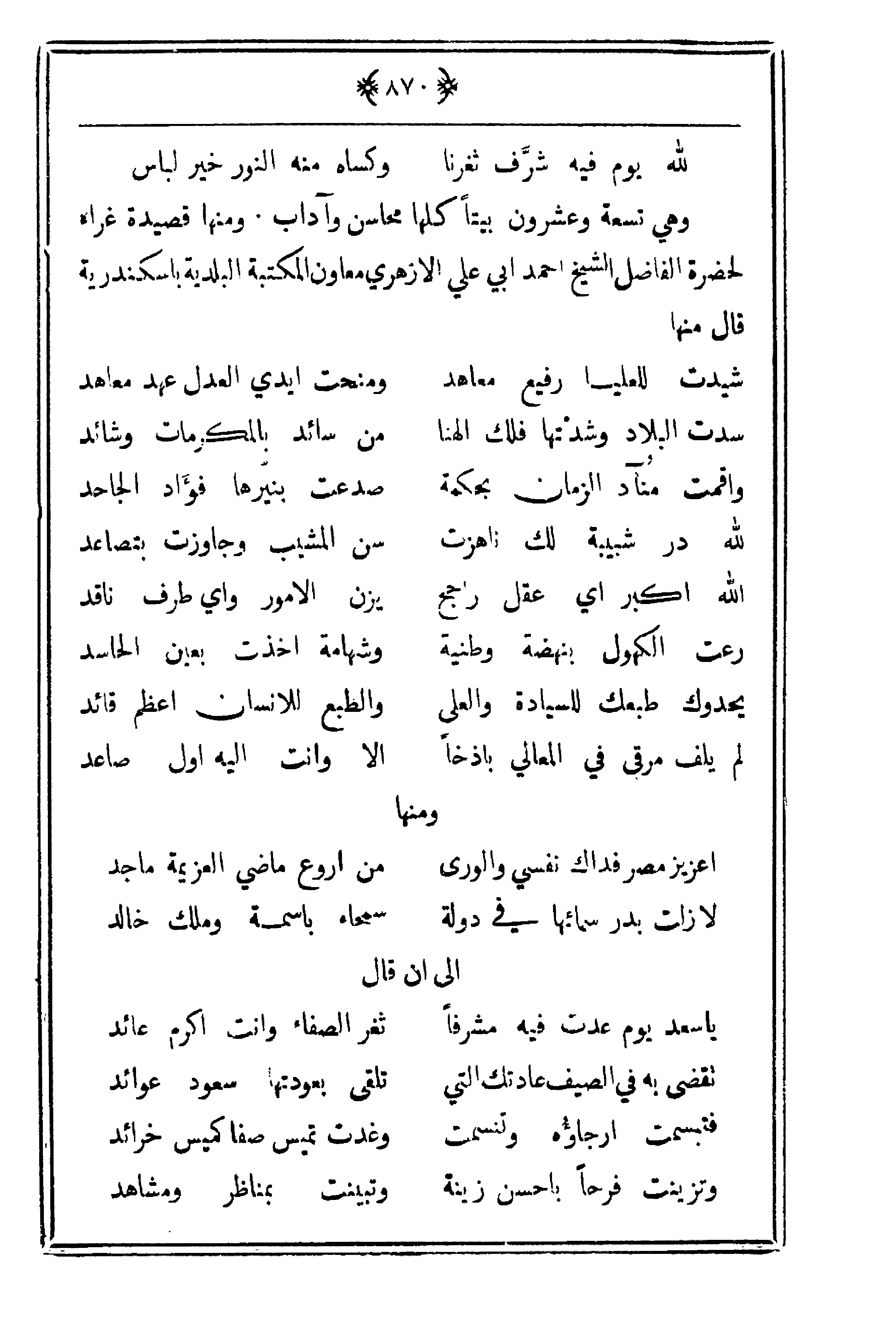 وهي تسعة وعشرون بيتاً كلها محاسن وآداب. ومنها قصيدة غراء لحضرة الفاضل الشيخ أحمد أبي علي الأزهري معاون المكتبة البلدية بإسكندرية قال منها: