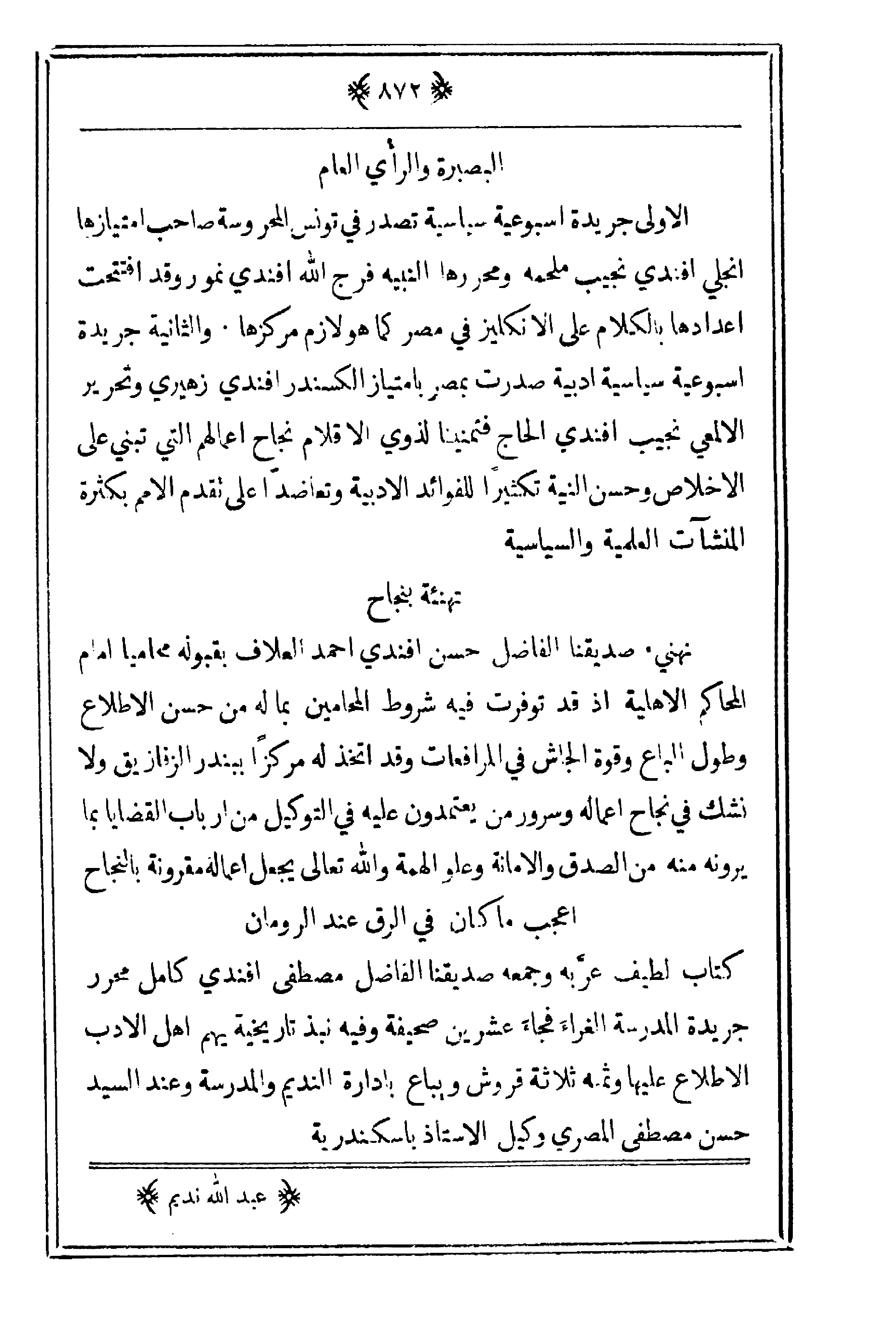 الأولى جريدة أسبوعية سياسية تصدر في تونس المحروسة صاحب امتيازها أنجلي أفندي نجيب ملحمه ومحررها النبيه فرج الله أفندي نمور وقد افتتحت أعدادها بالكلام على الإنكليز في مصر كما هو لازم مركزها. والثانية جريدة أسبوعية سياسية أدبية صدرت بمصر بامتياز ألكسندر أفندي زهيري وتحرير الألمعي نجيب أفندي الحاج فتمنينا لذوي الأقلام نجاح أعمالهم التي تبني على الإخلاص وحسن النية تكثيراً للفوائد الأدبية وتعاضداً على تقدم الأمم بكثرة المنشأت العلمية والسياسية.