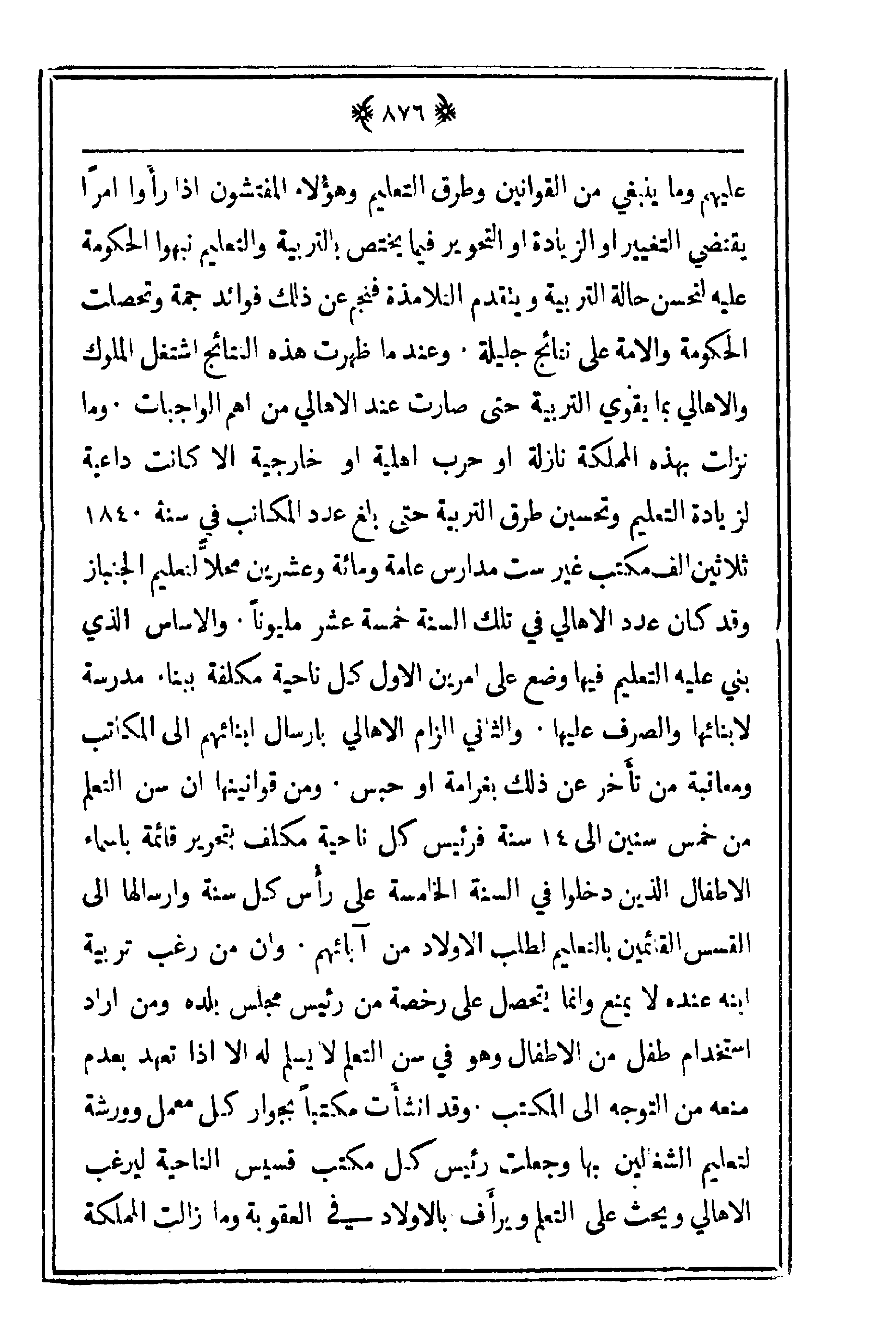 عليهم وما ينبغي من القوانين وطرق التعليم وهؤُلاء المفتشون إذا رأوا أمراً يقتضي التغيير أو الزيادة أو التحوير فيما يختص بالتربية والتعليم نبهوا الحكومة عليه لتحسن حالة التربية ويتقدم التلامذة فنجم عن ذلك فوائد جمة وتحصلت الحكومة والأمة على نتائج جليلة. وعندما ظهرت هذه النتائج اشتغل الملوك والأهالي بما يقوي التربية حتى صارت عند الأهالي من أهم الواجبات. وما نزلت بهذه المملكة نازلة أو حرب أهلية أو خارجية إلا كانت داعية لزيادة التعليم وتحسين طرق التربية حتى بلغ عدد المكاتب في سنة 1840 ثلاثين ألف مكتب غير ست مدارس عامة ومائة وعشرين محلاً لتعليم الجنباز وقد كان عدد الأهالي في تلك السنة خمسة عشر مليوناً. والأساس الذي بني عليه التعليم فيها وضع على أمرين الأول كل ناحية مكلفة ببناء مدرسة لأبنائها والصرف عليها. والثاني إلزام الأهالي بإرسال أبنائهم إلى المكاتب ومعاقبة من