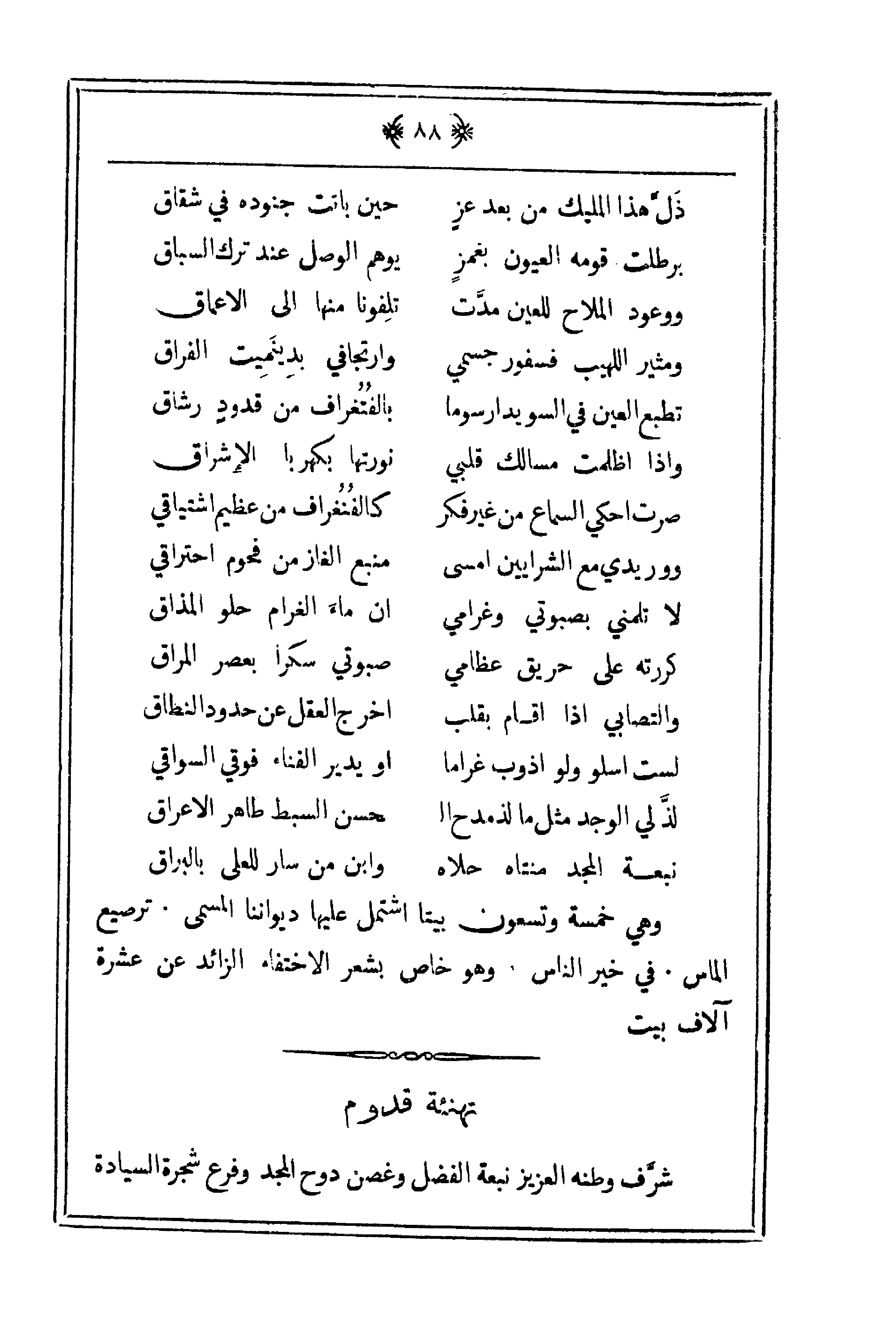 وهي خمسة وتسعون بيتاً اشتمل عليها ديواننا المسمى. ترصيع الماس. في خير الناس. وهو خاص بشعر الاختفاء الزائد عن عشرة آلاف بيت.