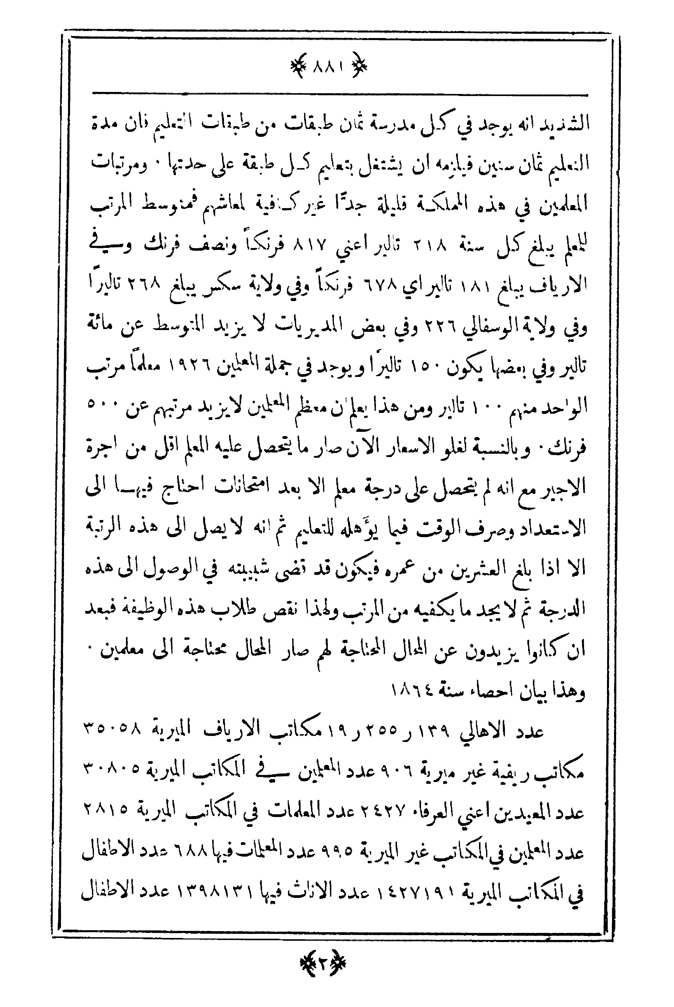 الشديد أنه يوجد في كل مدرسة ثمان طبقات من طبقات التعليم فإن مدة التعليم ثمان سنين فيلزمه أن يشتغل بتعليم كل طبقة على حدتها. ومرتبات المعلمين في هذه المملكة قليلة جداً غير كافية لمعاشهم فمتوسط المرتب للمعلم يبلغ كل سنة 218 تالير أعين 817 فرنكاً ونصف فرنك وفي الأرياف يبلغ 181 تاليراي 678 فرنكاً وفي ولاية سكس يبلغ 268 تاليراً وفي ولاية الوسفالي 226 وفي بعض المديريات لا يزيد المتوسط عن مائة تالير وفي بعضها يكن 150 تاليراً ويوجد في جملة المعلمين 1926 معلماً مرتب الواحد منهم 100 تالير ومن هذا يعلم أن معظم المعلمين لا يزيد مرتبهم عن 500 فرنك. وبالنسبة لغلو الأسعار الآن صار ما يتحصل عليه المعلم أقل من أجرة الأجير مع أنه لم يتحصل على درجة معلم إلا بعد امتحانات احتاج فيها إلى الاستعداد وصرف الوقت فيما يؤهله للتعليم ثم أنه لا يصل إلى هذه الرتبة إلا إذا بلغ العشرين من عمره فيكون قد قضى شبيبته في الوصول إلى هذه الدرجة ثم لا يجد ما يكفيه من المرتب ولهذا نقص طلاب هذه الوظيفة فبعد أن كانوا يزيدون عن المحال المحتاجة لهم صار المحال محتاجة إلى معلمين. وهذا بيان إحصاء سنة 1864.