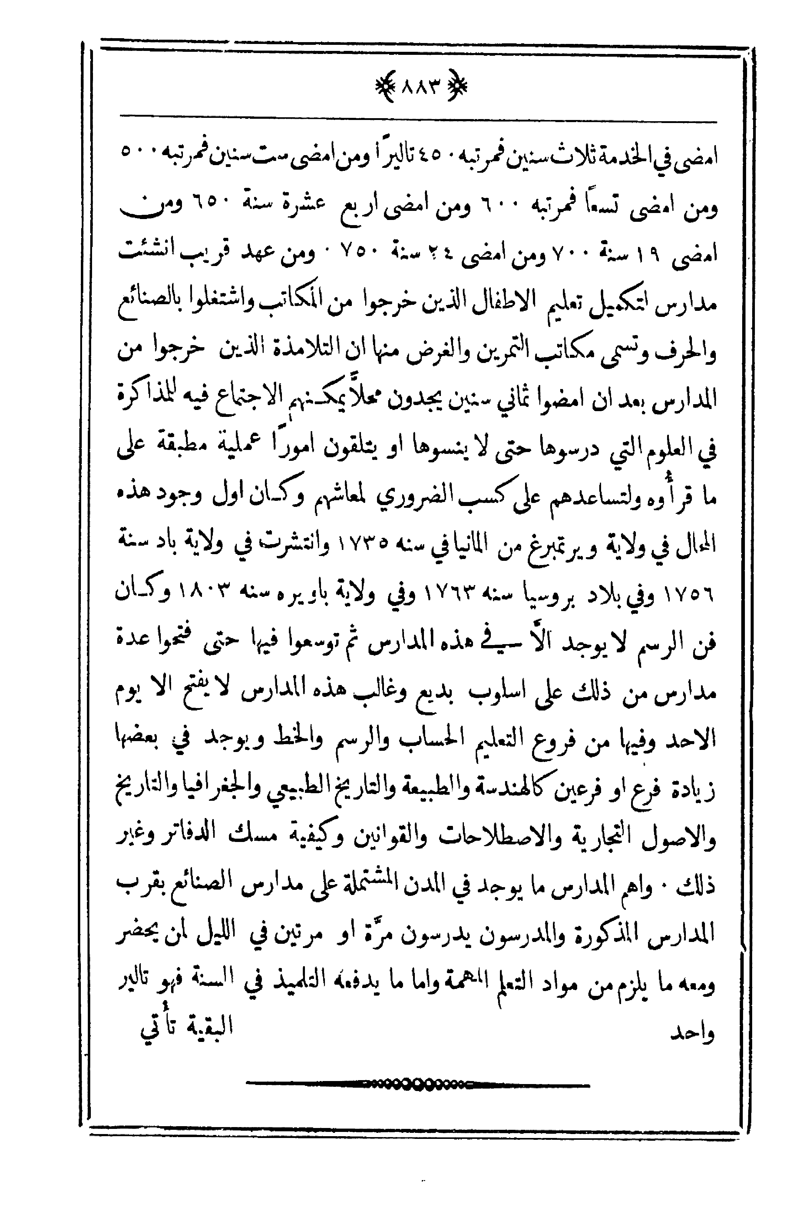 وغير ذلك. وأهم المدارس ما يوجد في المدن المشتملة على مدارس الصنائع بقرب المدارس المذكورة والمدرسون مرّة أو مرتين في الليل لمن يحضر ومعه ما يلزم من مواد التعلم المهمة وأما ما يدفعه التلميذ في السنة فهو تالير واحد.