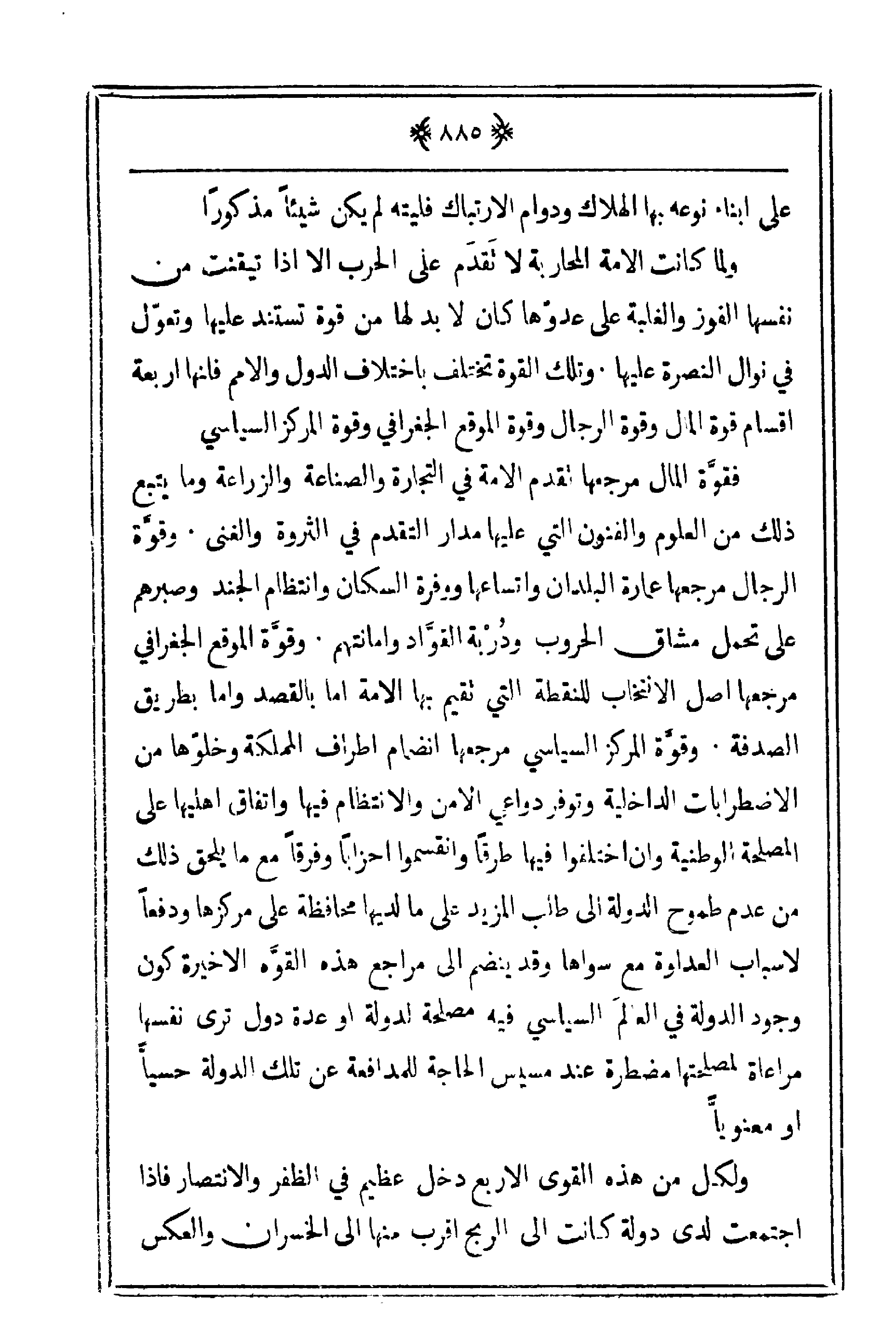 فقوّة المال مرجعها تقدم الأمة في التجارة والصناعة والزراعة وما يتبع ذلك من العلوم والفنون التي عليها مجار التقدم في الثروة والغنى. وقوّة الرجال مرجعها عمارة البلدان