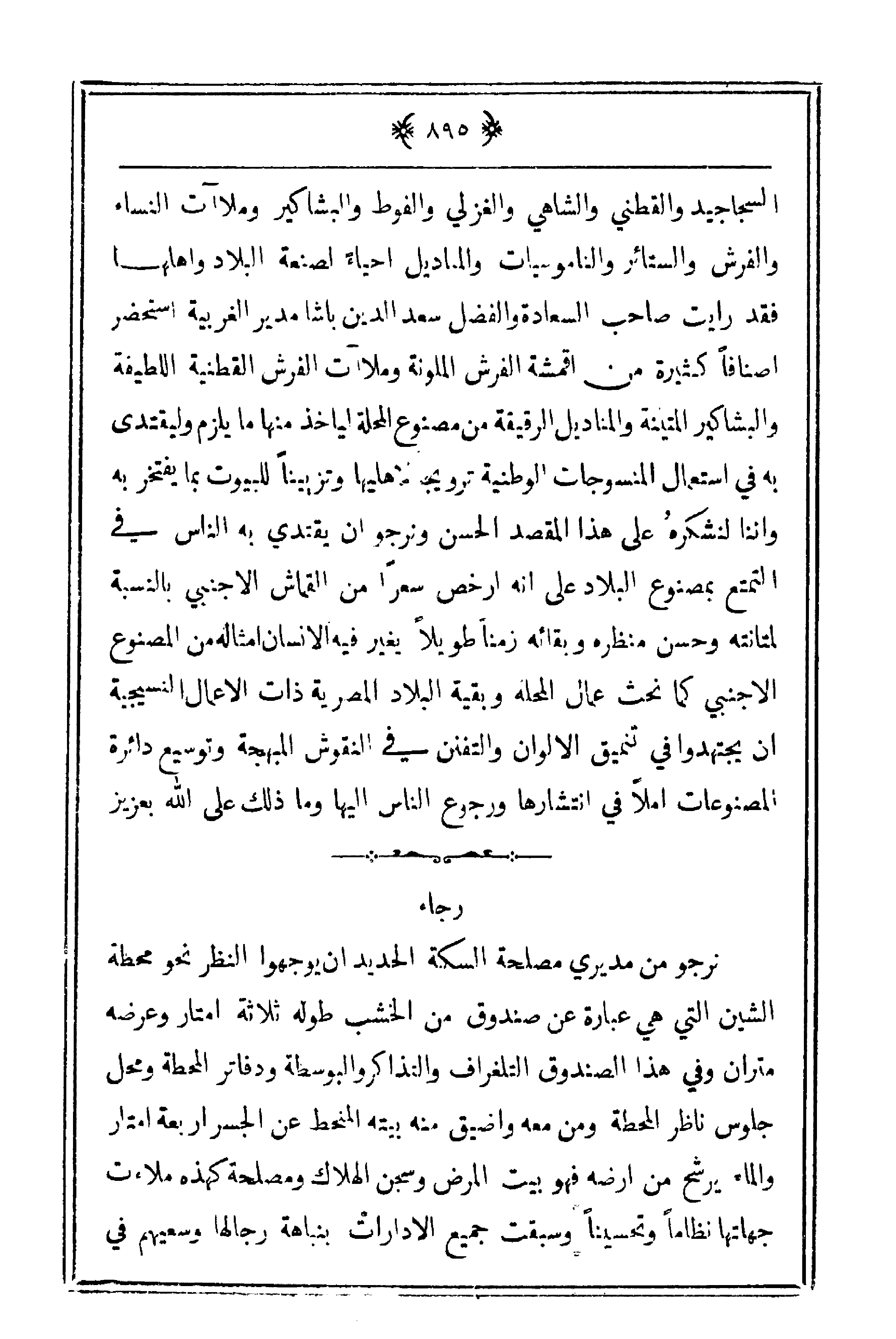 السجاجيد والقطني والشاهي والغزالي والفوط والبشاكير وملأت النساء والفرش والستائر والناموسيات والمناديل أحياءً لصنعة البلاد وأهلها فقد رأيت صاحب السعادة والفضل سعد الدين باشا مدير الغربية استحضر أصنافاً كثيرة من أقمشة الفرش الملونة وملأت الفرش القطنية اللطيفة والبشاكير المتينة والمناديل الرقيقة من مصنوع المحلة ليأخذ منها ما يلزم وليقتدي به في استعمال المنسوجات الوطنية ترويجاً لأهليها وتزييناً للبيوت بما يفتخر به وإننا لنشكرهُ على هذا المقصد الحسن ونرجو أن يقتدي به الناس في التمتع بمصنوع البلاد على أنه أرخص سعراً من القماش الأجنبي بالنسبة لمتانته وحسن منظره وبقائه زمناً طويلاً يغير فيه الإنسان أمثاله من المصنوع الأجنبي كما نحث عمال المحلة وبقية البلاد المصرية ذات الأعمال النسيجية أن يجتهدوا في تنميق الألوان والتفنن في النقوش المبهجة وتوسيع دائرة المصنوعات أملاً في انتشارها ورجوع الناس إليها وما ذلك على الله بعزيز.